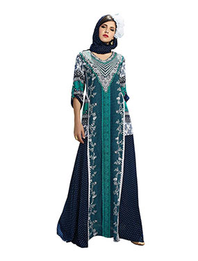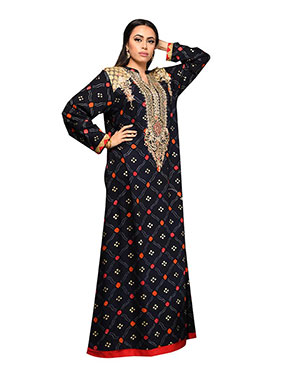 جلابية طويلة من الفسكوز بطبعات مميزة ومتعددة الألوان حيث تجمع ما بين اللون الأحمر والأزرق والأسود والرمادي، مصممة بأكمام طويلة وفتحة رقبة على شكل حرف V مما يمنحها شكل أنثوي للغاية.
