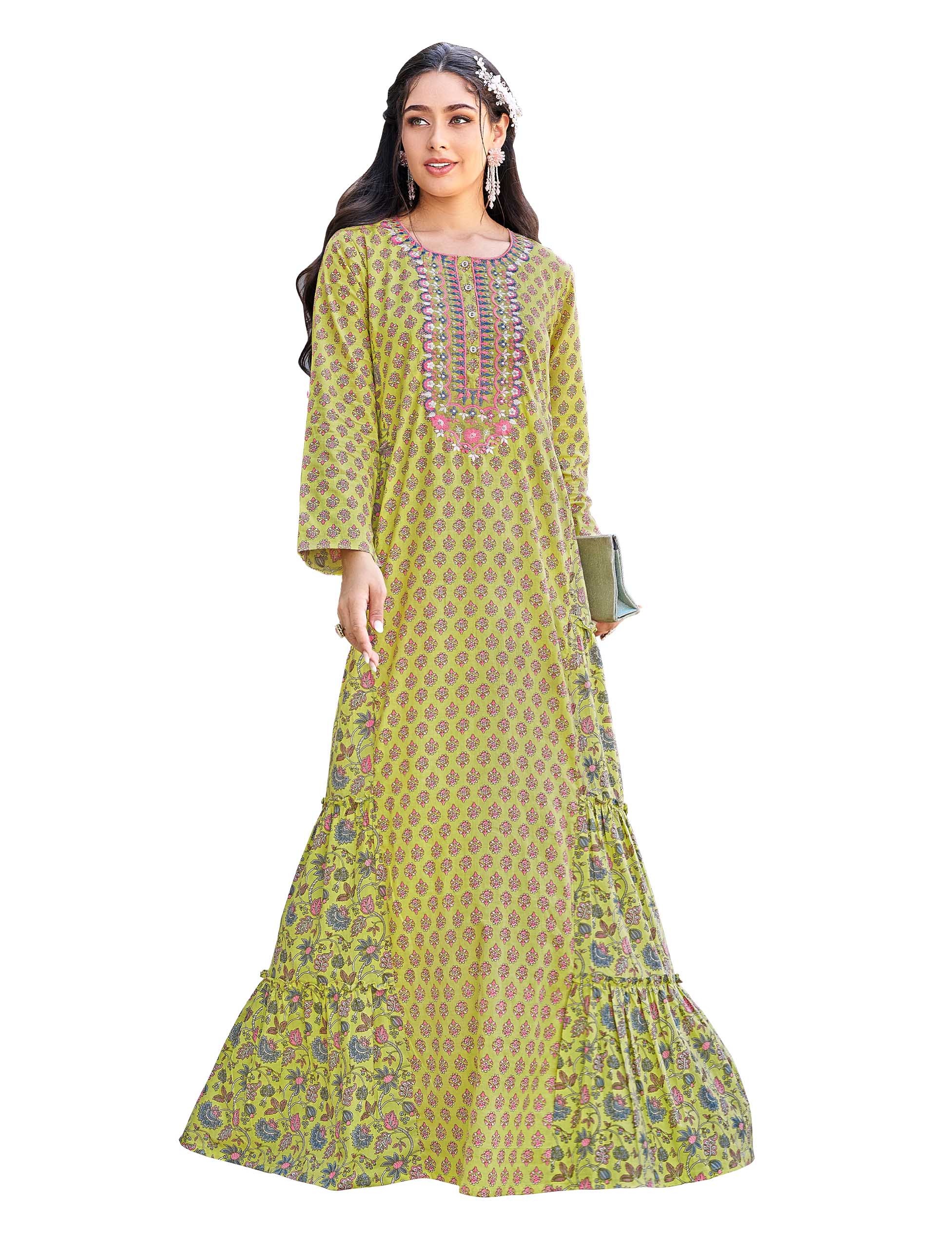 تزيني في جلابية صفراء اللون مصممة بطبعة زهرية اللون مع أكمام طويلة وتطريز رائع على الصدر مع أزرار أمامية. ويكتمل التصميم بنقشة من الأزهار الملونة على جانبي الجلابية لاطلالة فريدة من نوعها.