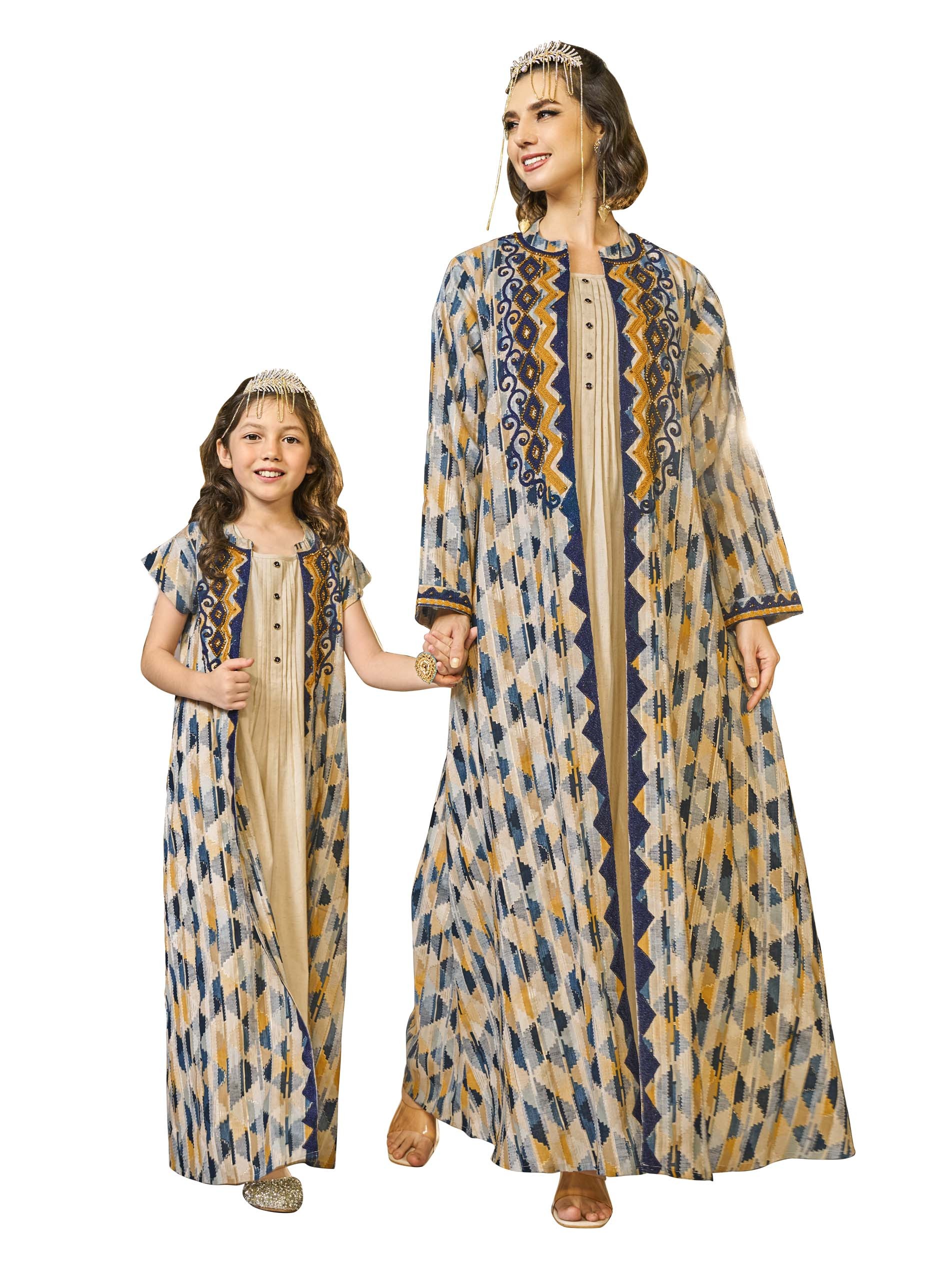 تتميز هذه الجلابية ذات الجاكيت المكون من طبقتين للأطفال بتصميم عصري مع طبعة إيكات حيوية باللون الأزرق والأصفر والبني، مزينة بتطريز دقيق وعمل يدوي من الخرز. مصنوعة من القطن القابل للتنفس، تضمن الراحة والحرية في الحركة، مما يجعلها مثالية للصيف واحتفالات رمضان. القاعدة البيج وتصميم الجاكيت المفصل يخلقان تباينًا ممتعًا وجذابًا، مما يجعلها خيارًا فريدًا للأطفال.