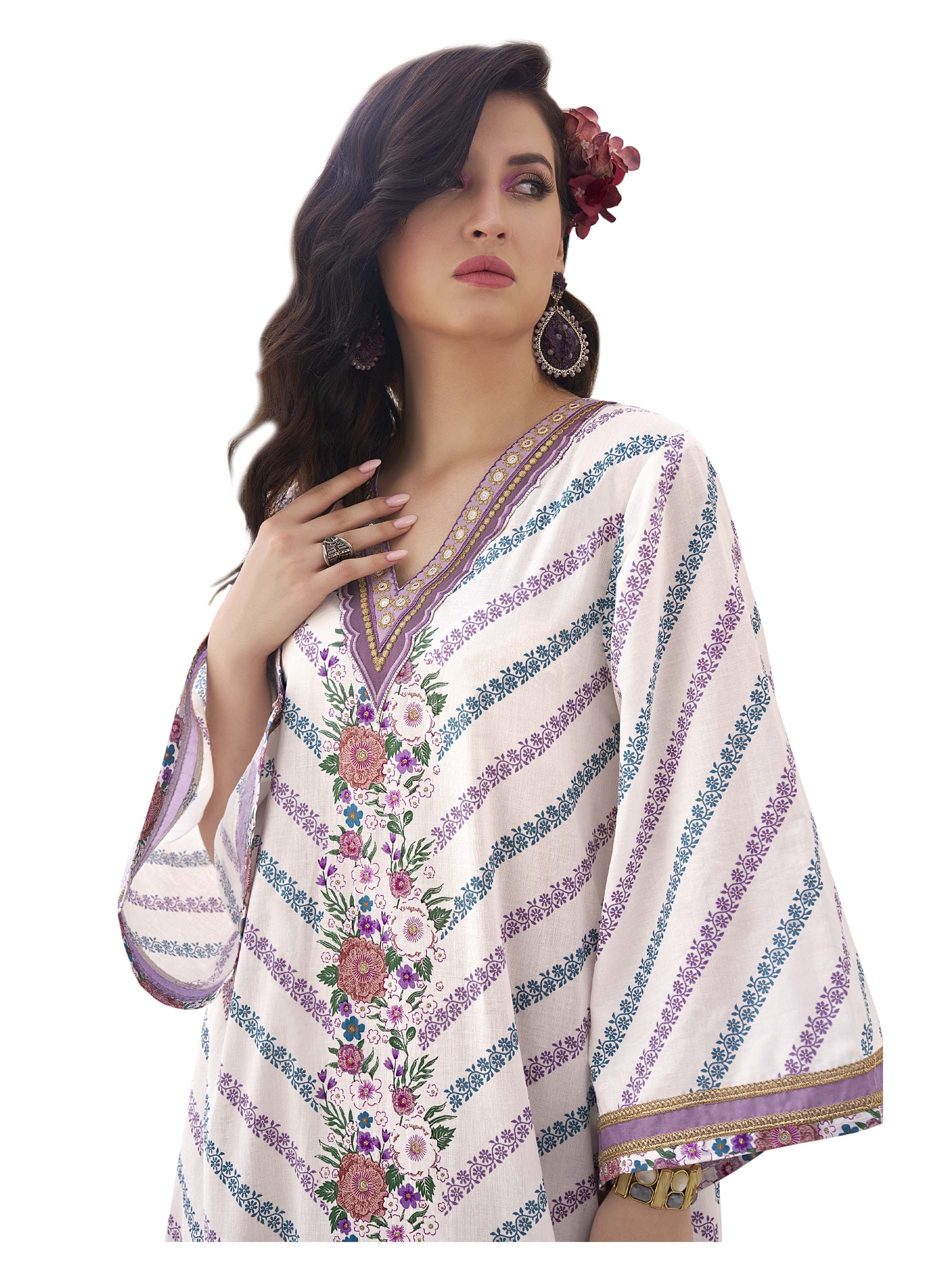 جلابية قطنية بيضاء اللون مصممة بتطريز مخطط من الزهور الملونة على جانبي الجلابية. وبتكمل التصميم بأكمام طويلة واسعة وطبعة الأزهار التي تمتد بطول الجلابية لتمنحك الشعور بالأناقة والتميز.