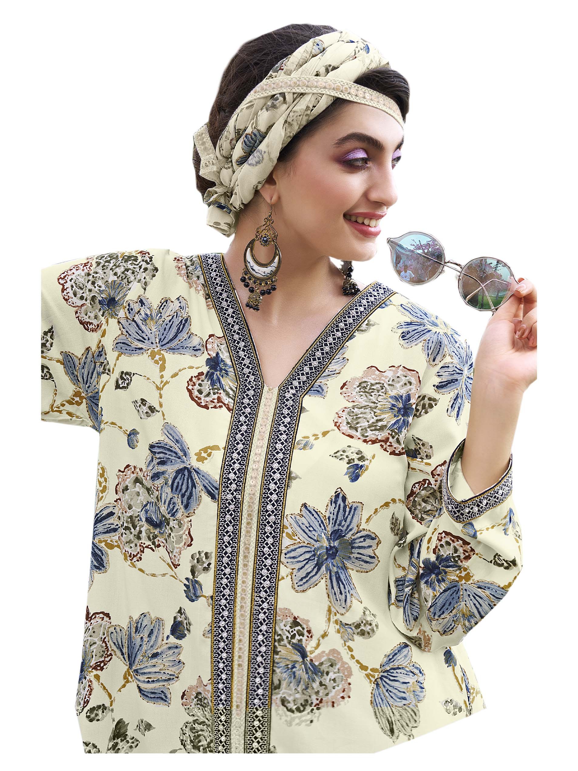 جلابية من القطن بيضاء اللون مصممة لمحبي البساطة والأناقة..مزودة بنقشة الأزهار الزرقاء مع تطريز مميز يمتد بطول الجلابية.