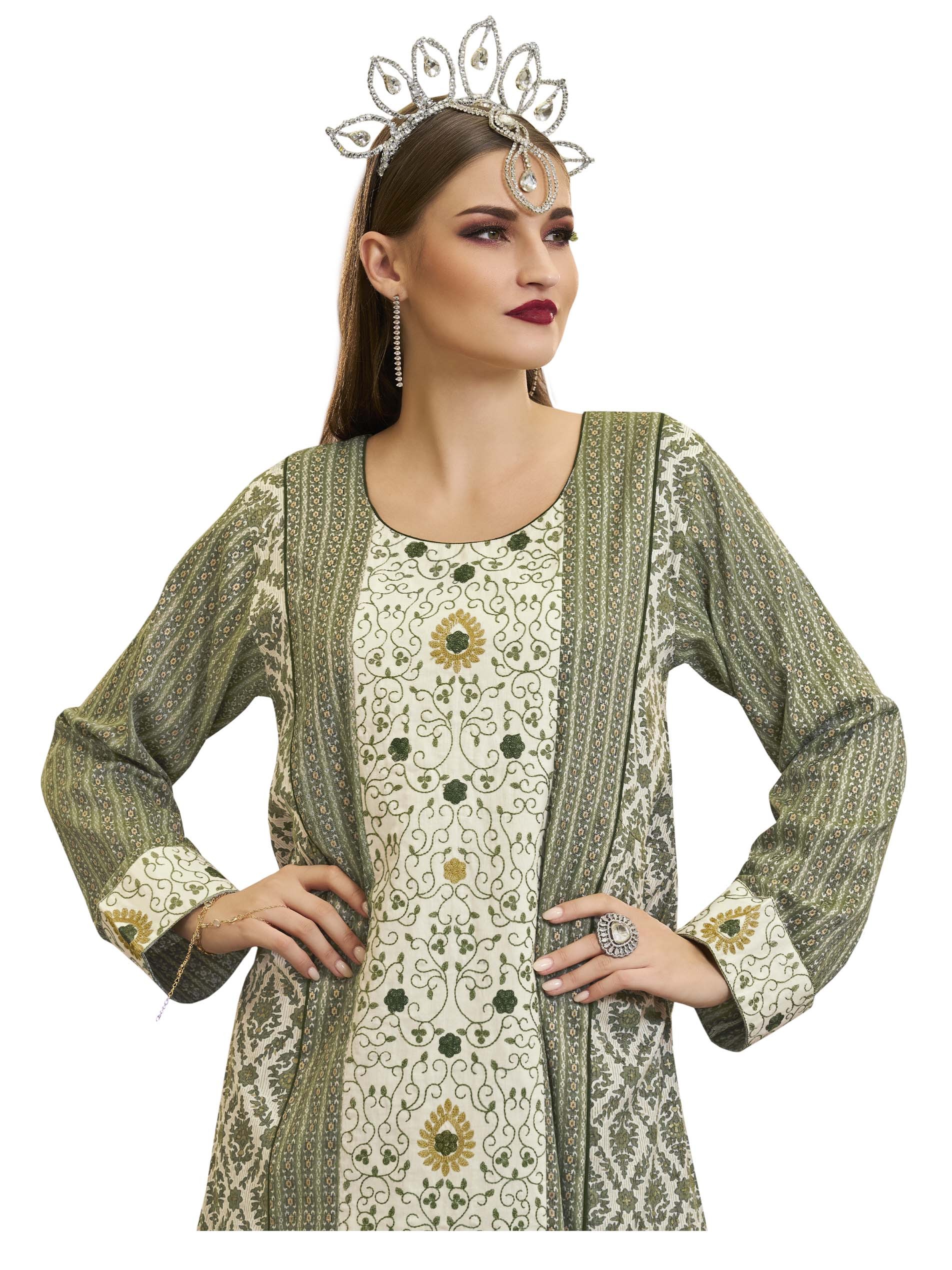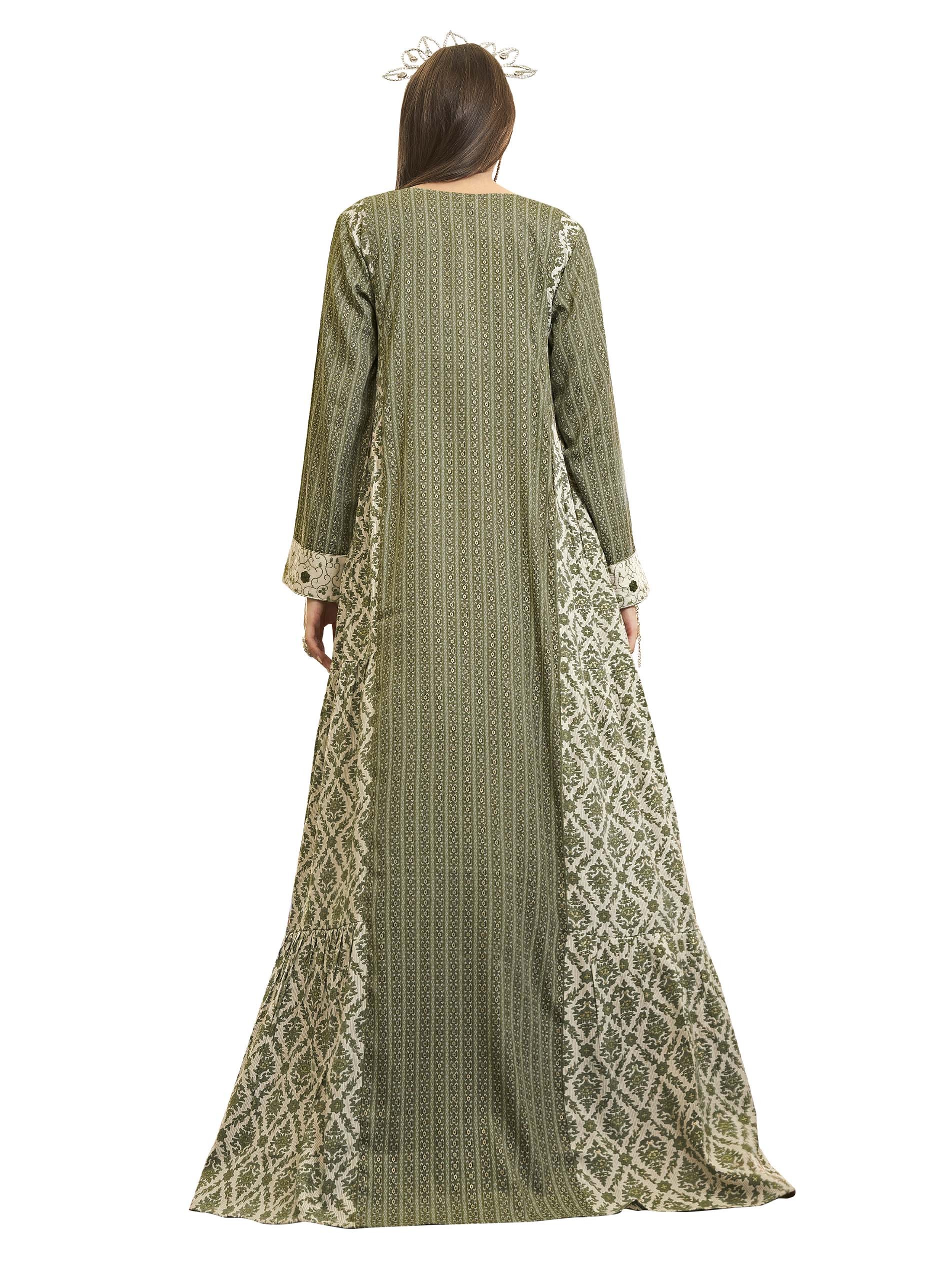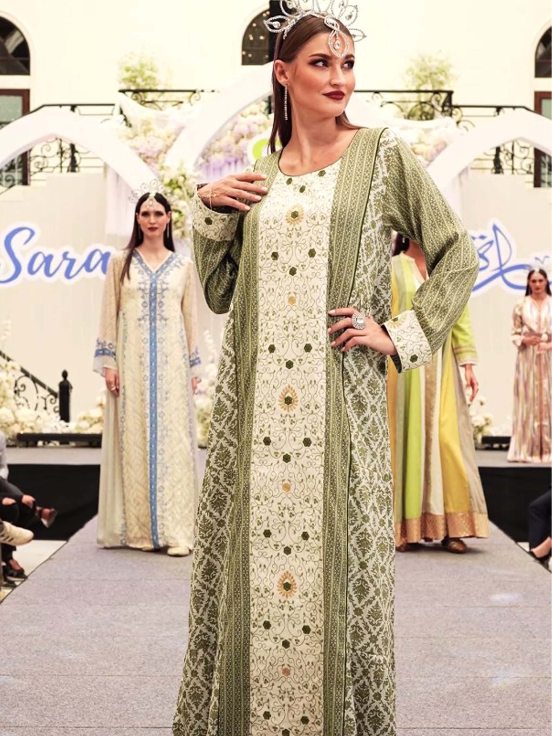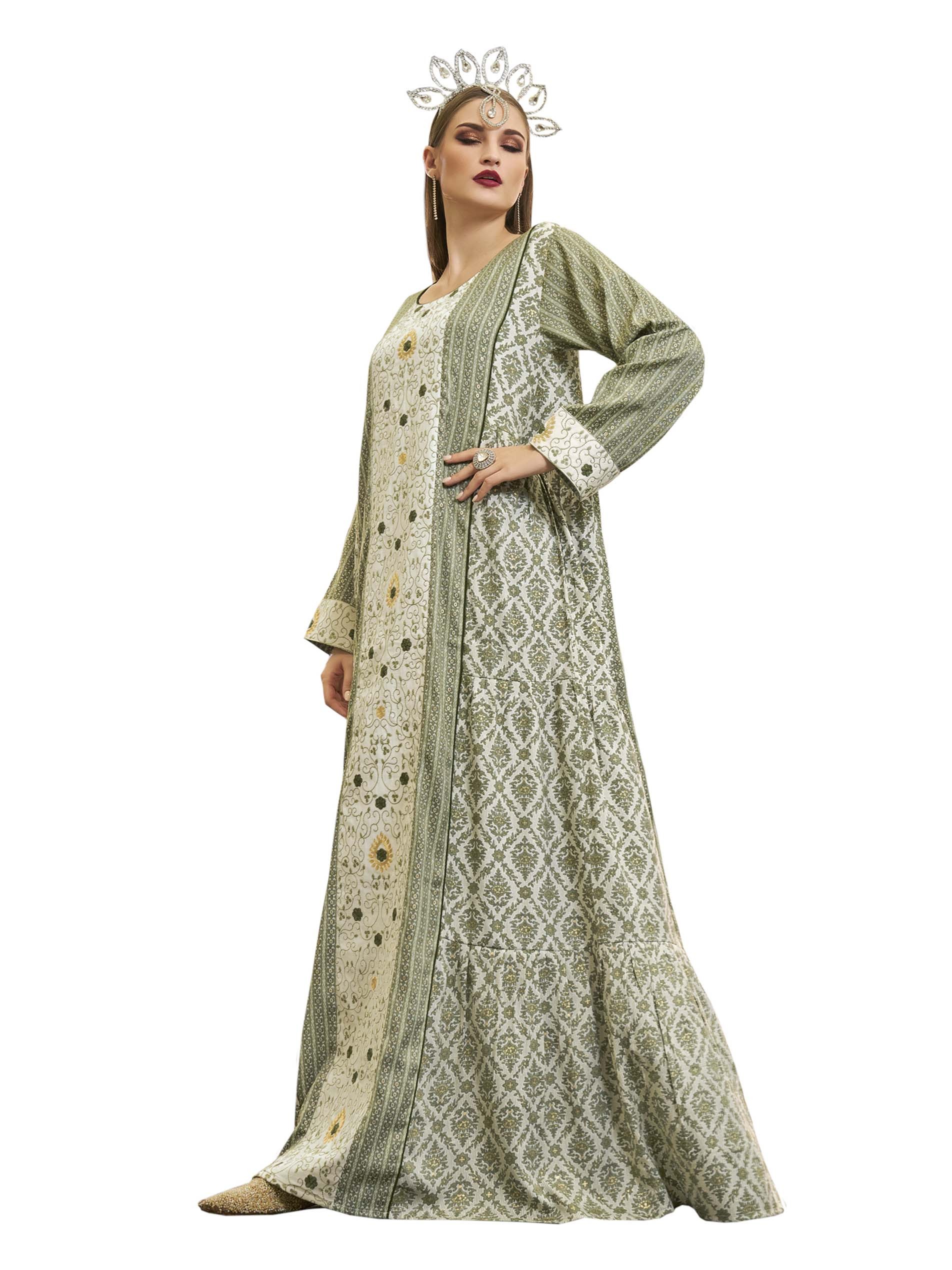 تألقي في جلابية باللون الرمادي مصممة من القطن ومزودة بتطريزات متنوعة. ويكتمل التصميم بلمسة من التطريز الذهبي مع أكمام طويلة وفتحة رقبة دائرية لاطلالة رائعة في الاحتفالات والمناسبات.