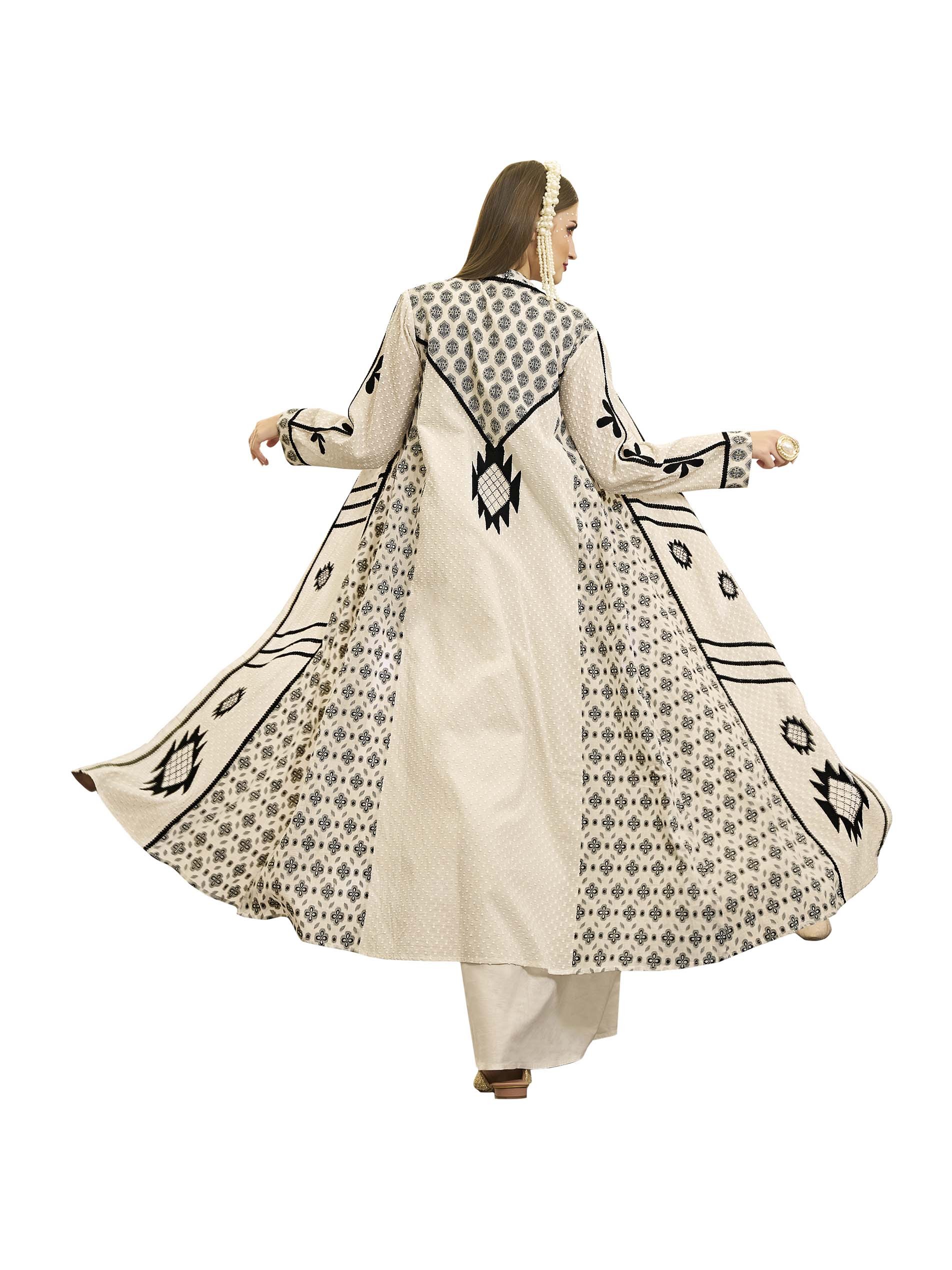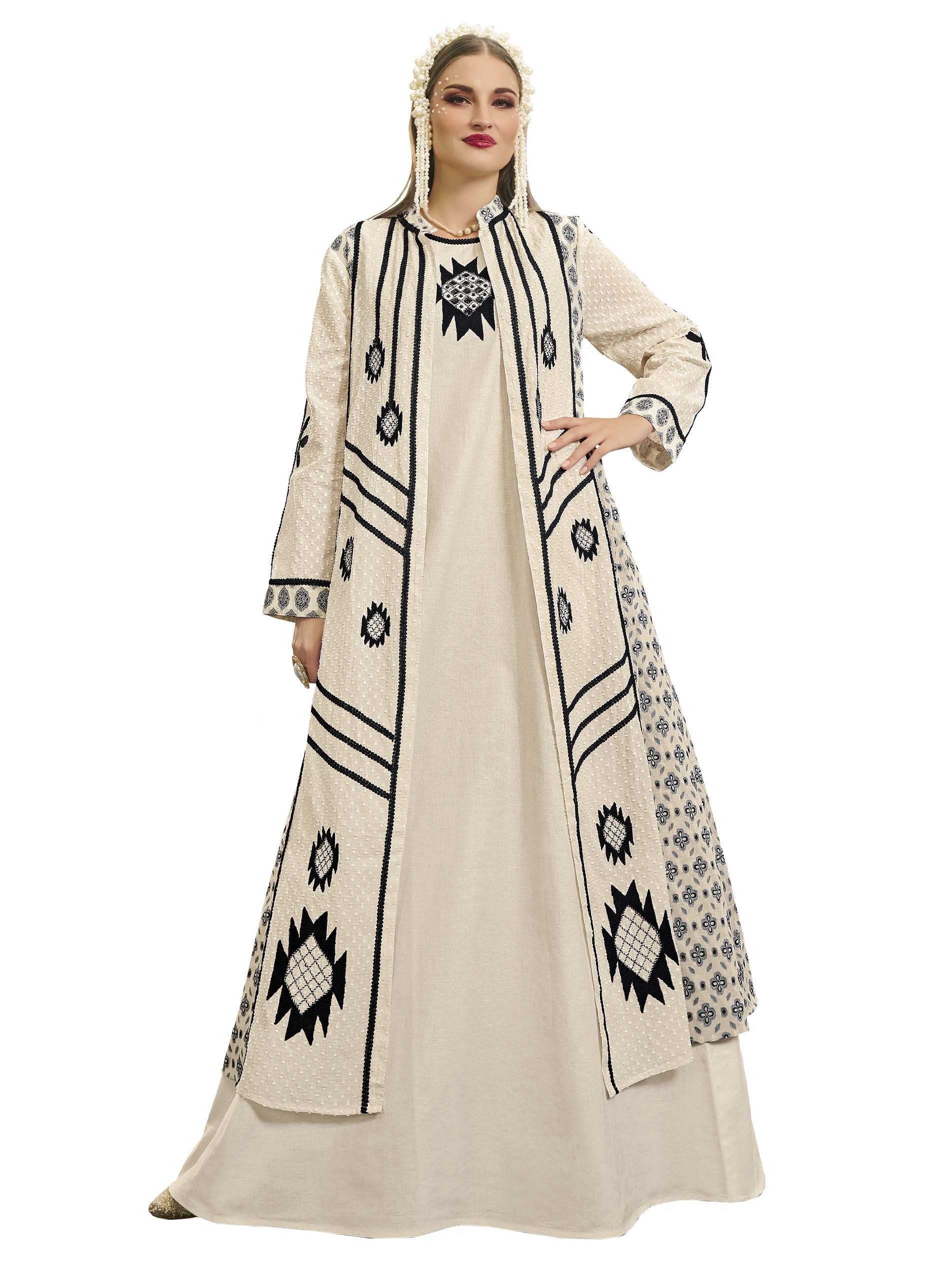 اذا كنتي من محبين اللون الرمادي الفاتح، تعتبر هذه الجلابية الاختيار الأمثل لك، فهي مصممة بنقش اسود وأكمام مميزة لاطلالة أنيقة وملفتة في رمضان.