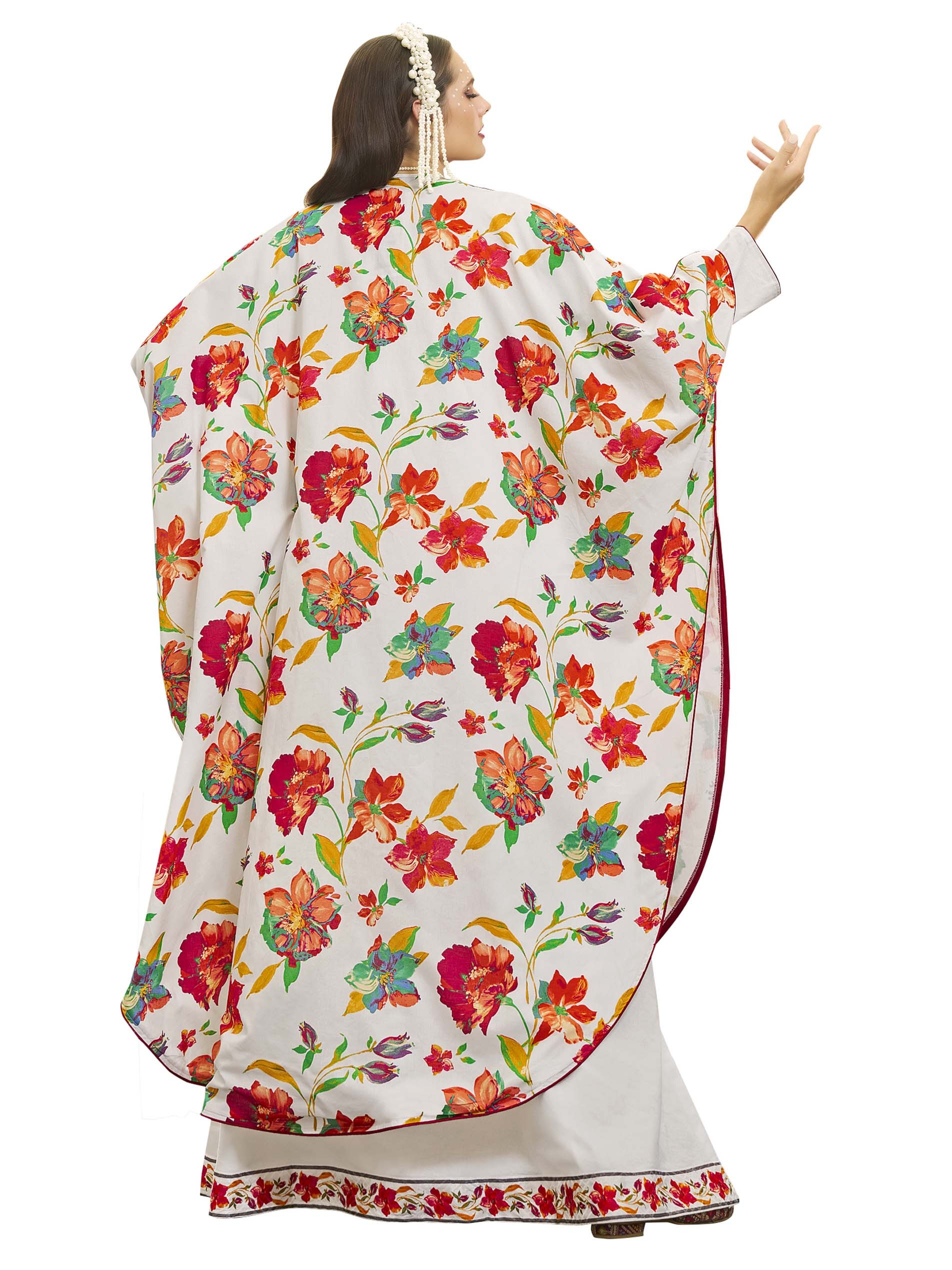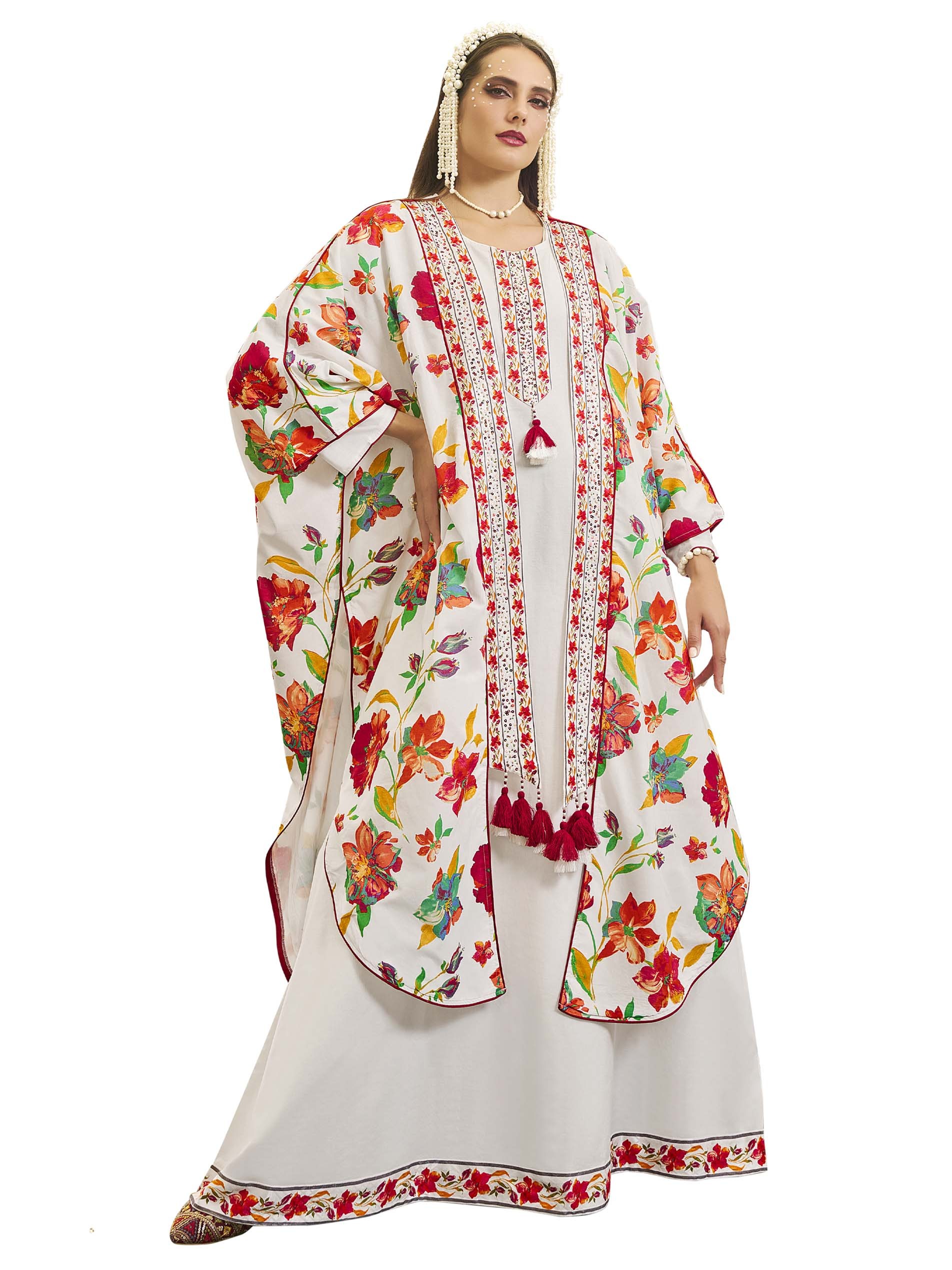 جلابية بيضاء بتصميم عصري، مصنوعة من القطن بنقشة الزهور الملونة باللونين الوردي والبرتقالي ويضفي عليها لمسة من اللون الأصفر مع أكمام طويلة وتطريز على الصدر.
