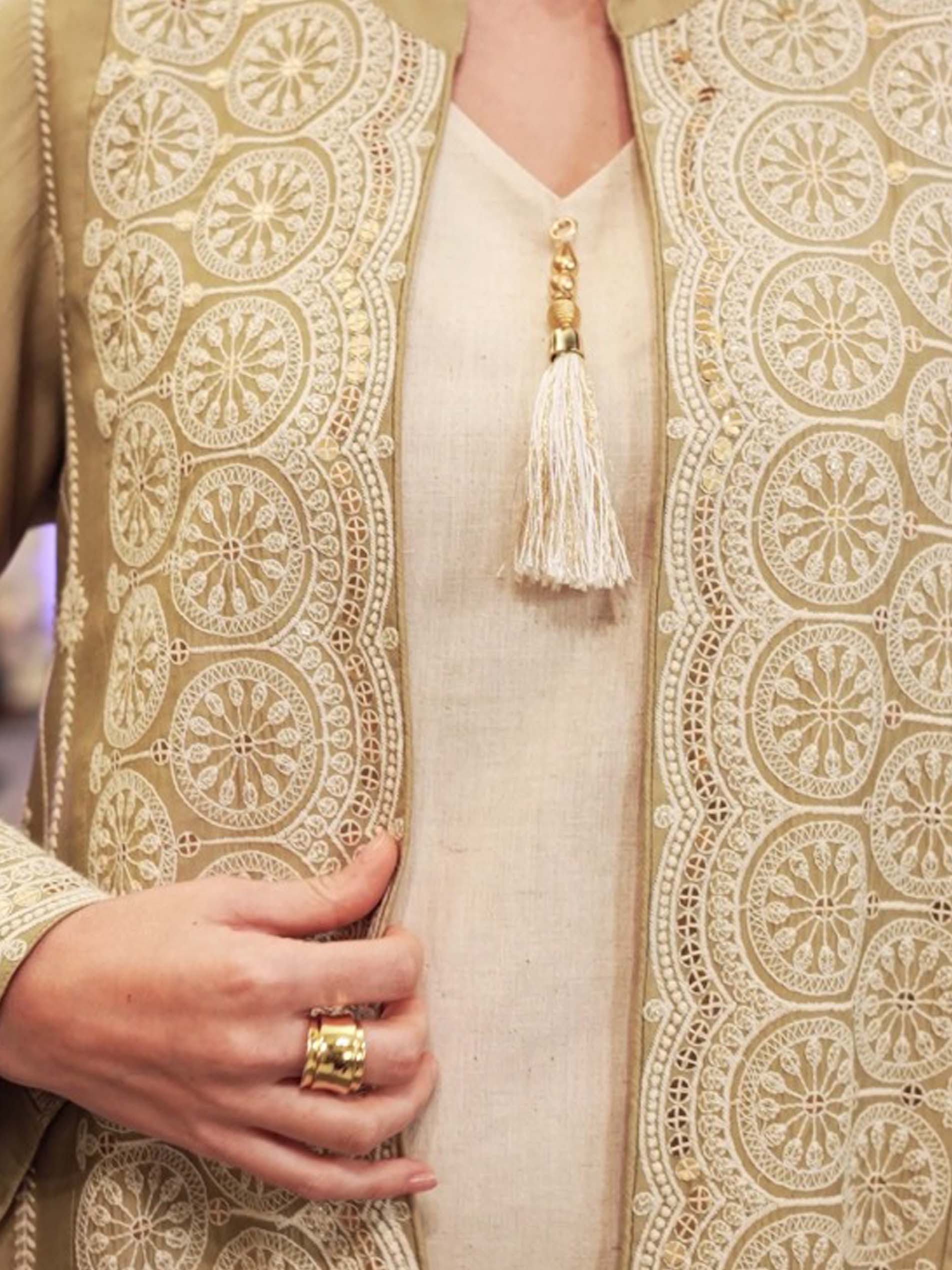 جلابية من القطن باللون الرمادي، غنية بالتطريزات مع أكمام طويلة، مصممة لتمنحك الشعور بالراحة والفخامة في آن واحد.
