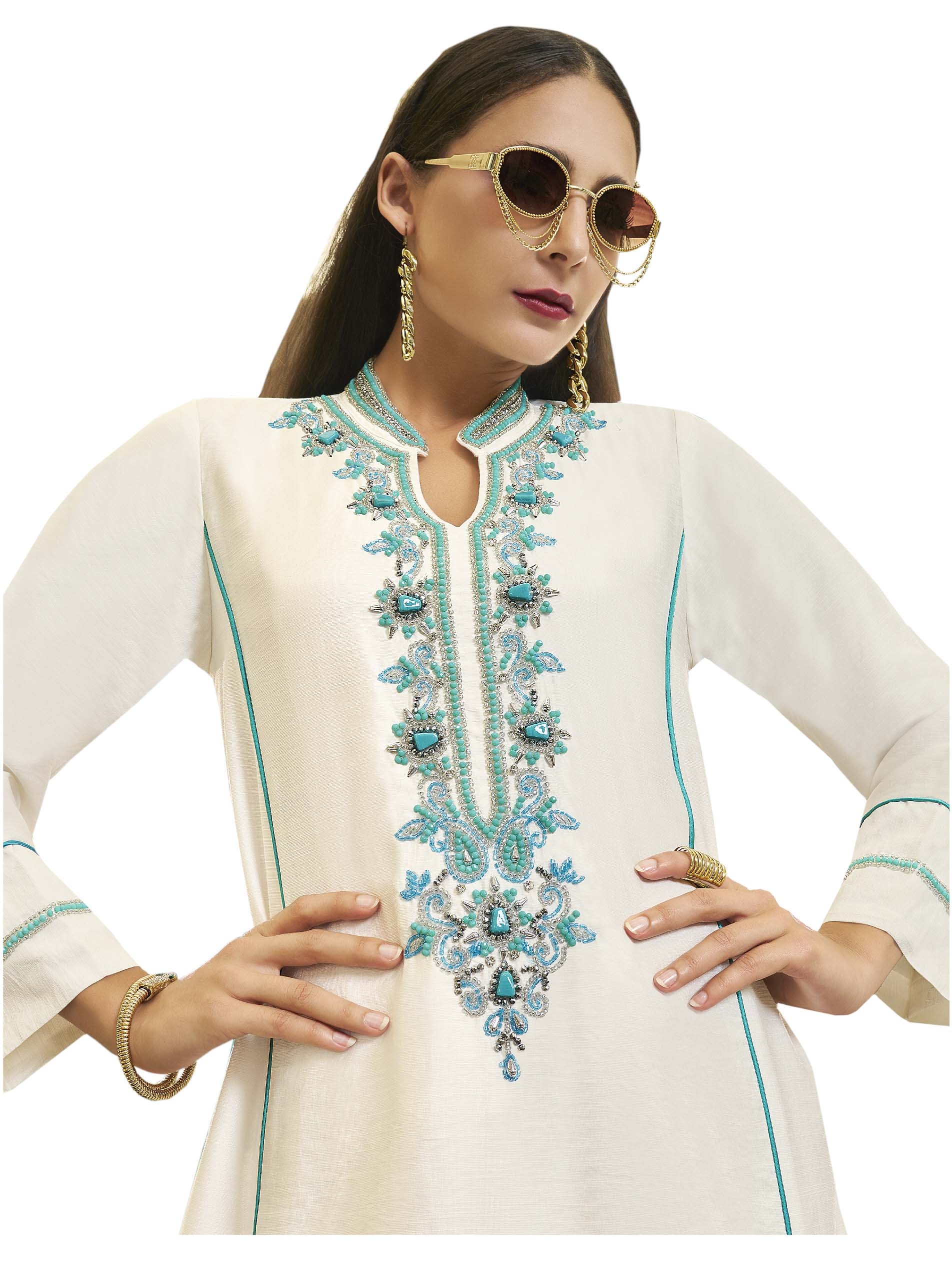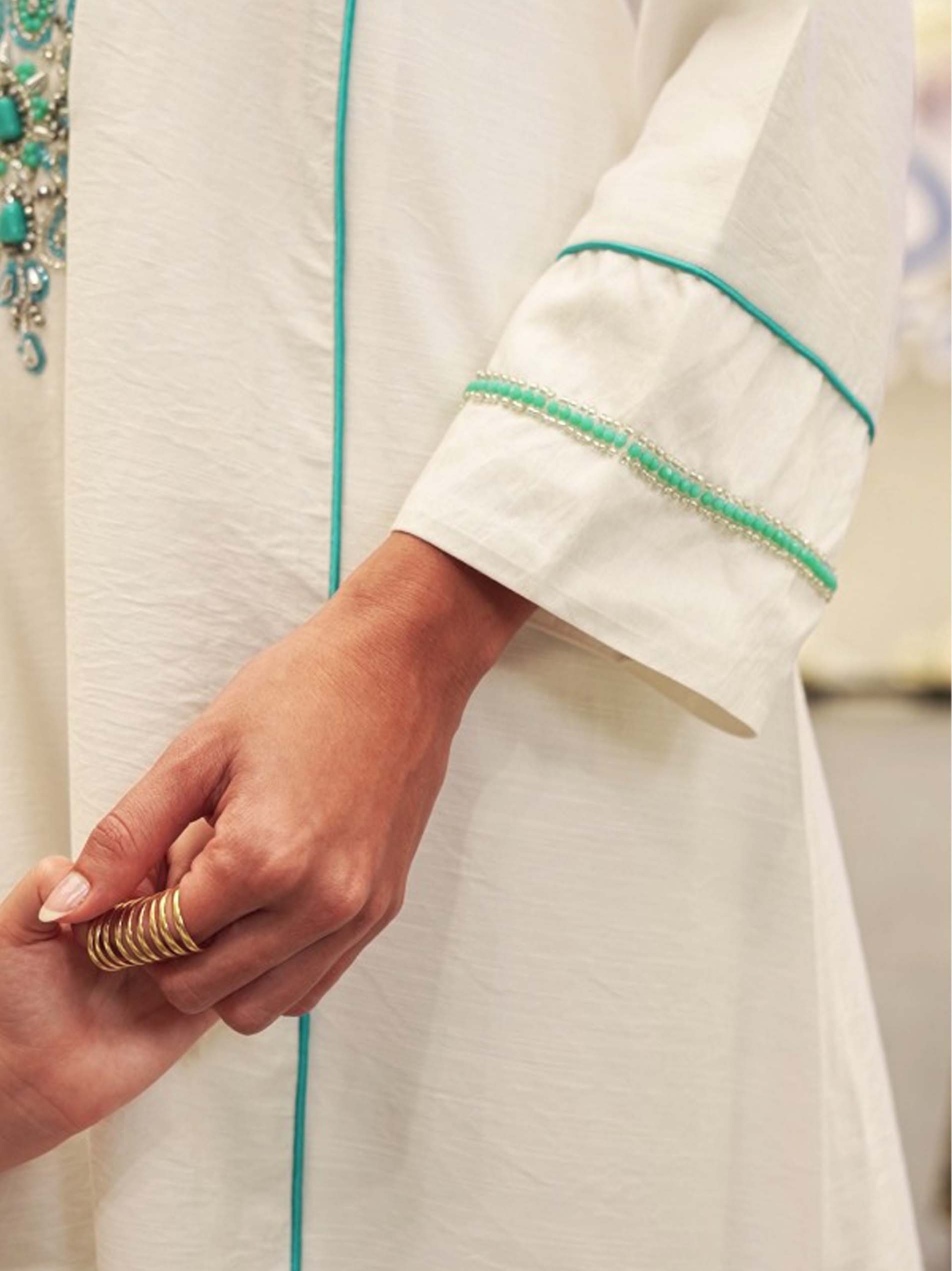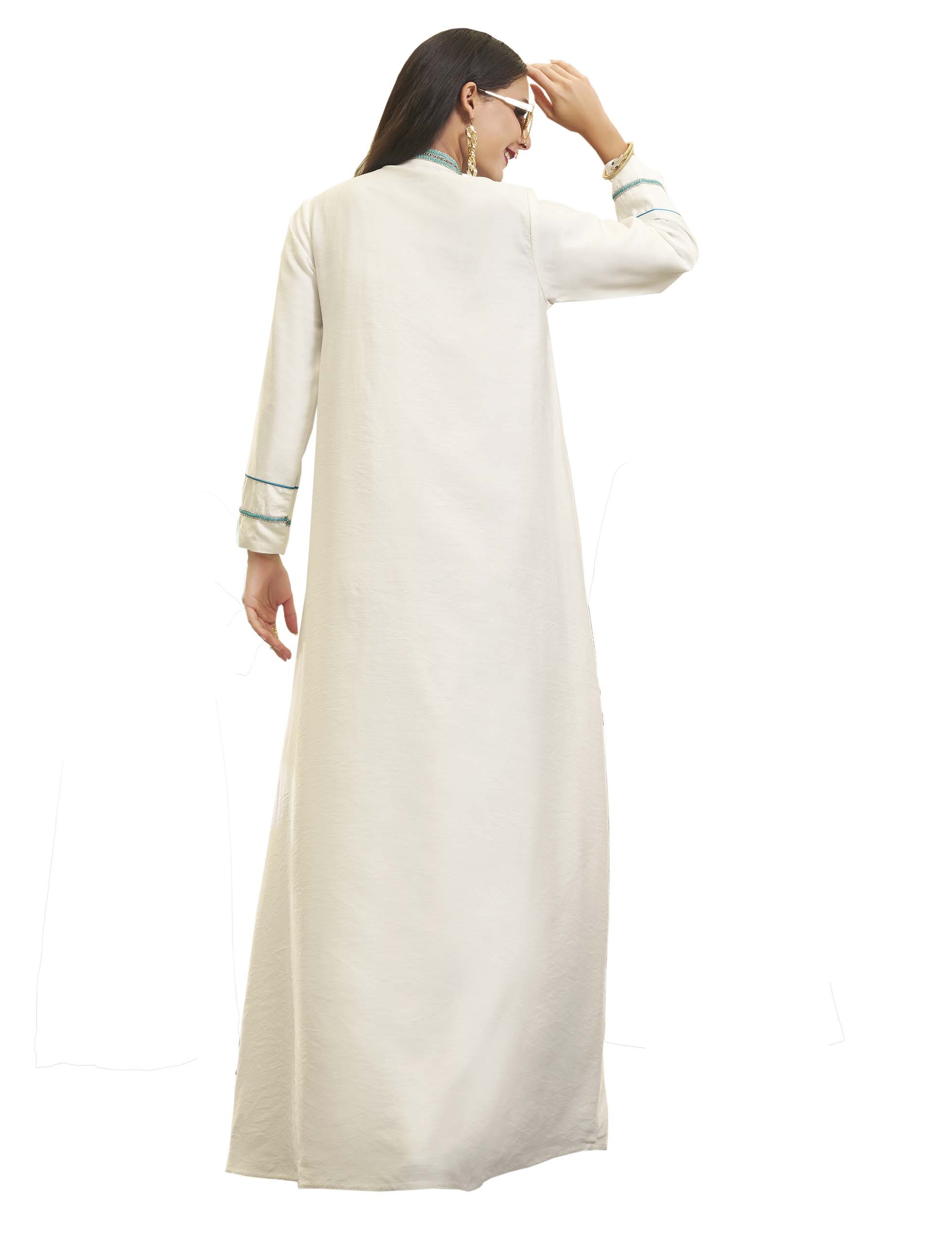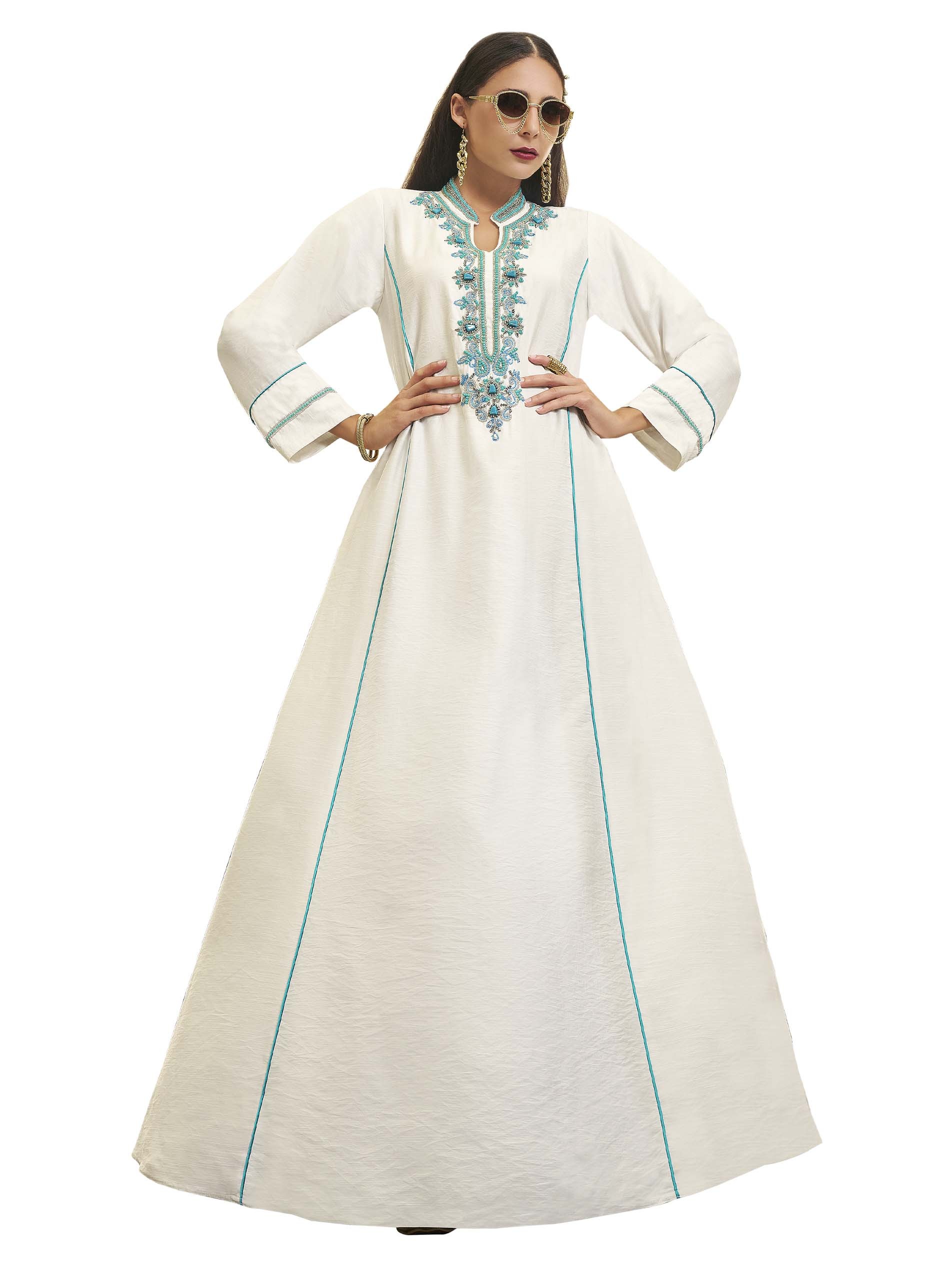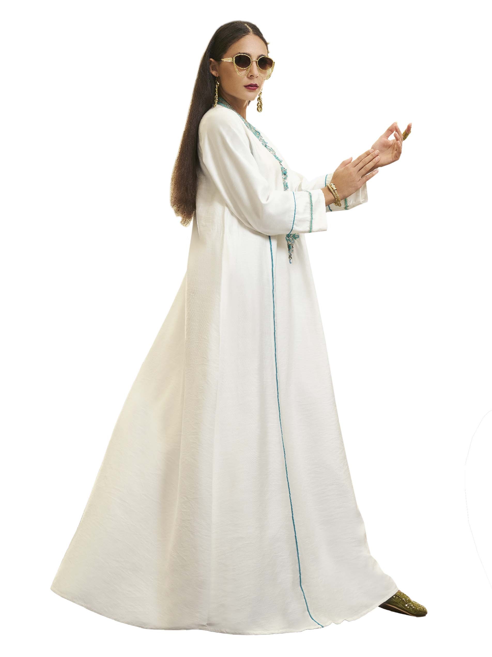 جلابية ماكسي طويلة بيضاء اللون، يتخللها اللون الأزرق بتصميم يجمع بين النعومة والفخامة. ويكتمل التصميم بتطريز رائع على الصدر بنقشة الأزهار.