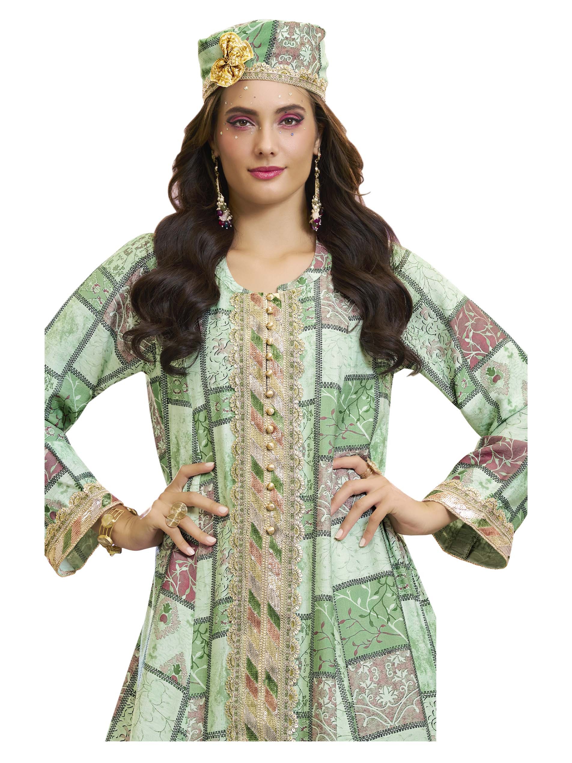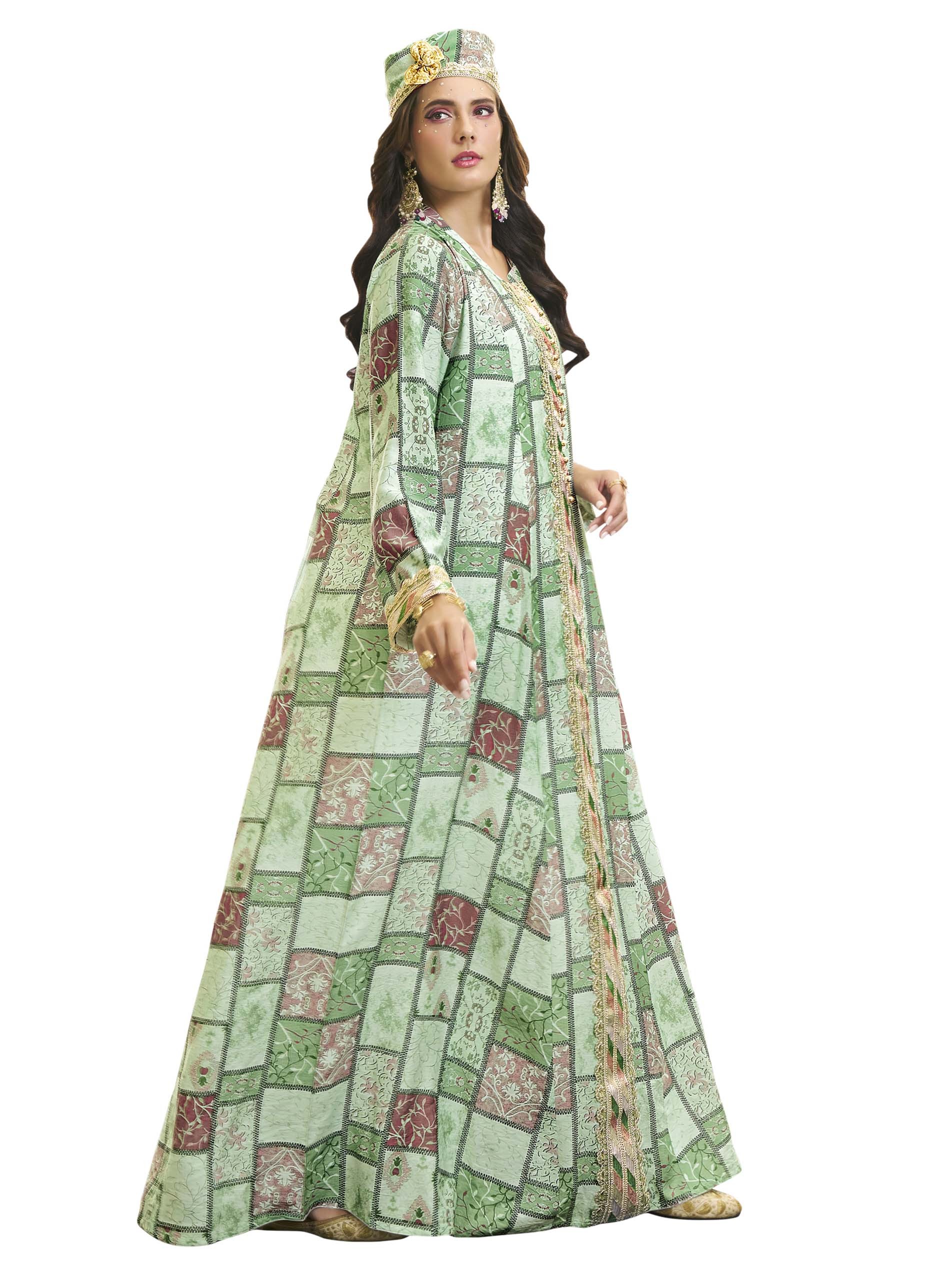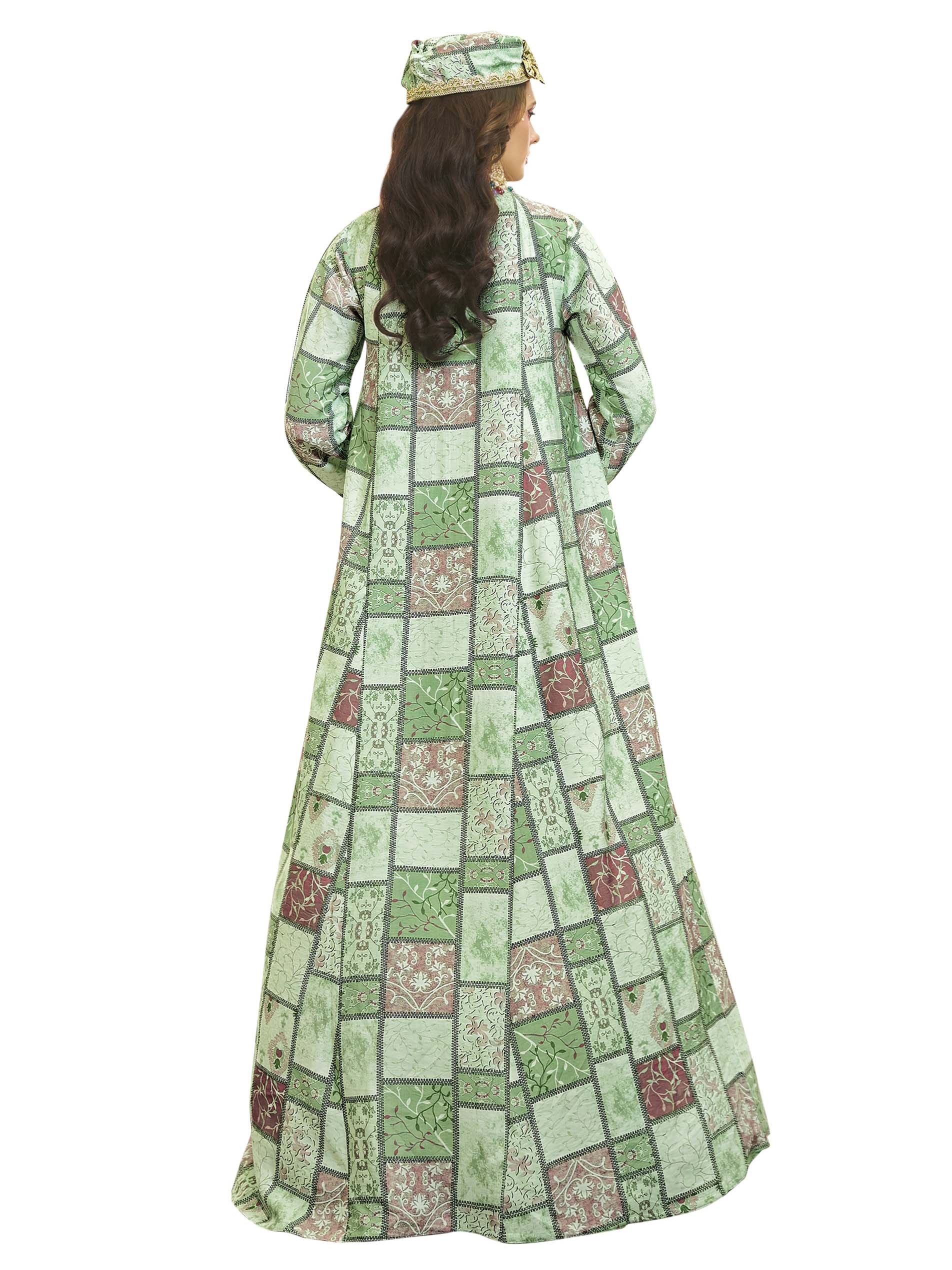 تألقي في جلابية قطنية بنقشة مربعات، مصممة باللونين الأخضر والزهري مع أكمام طويلة وأزرار أمامية على الصدر.