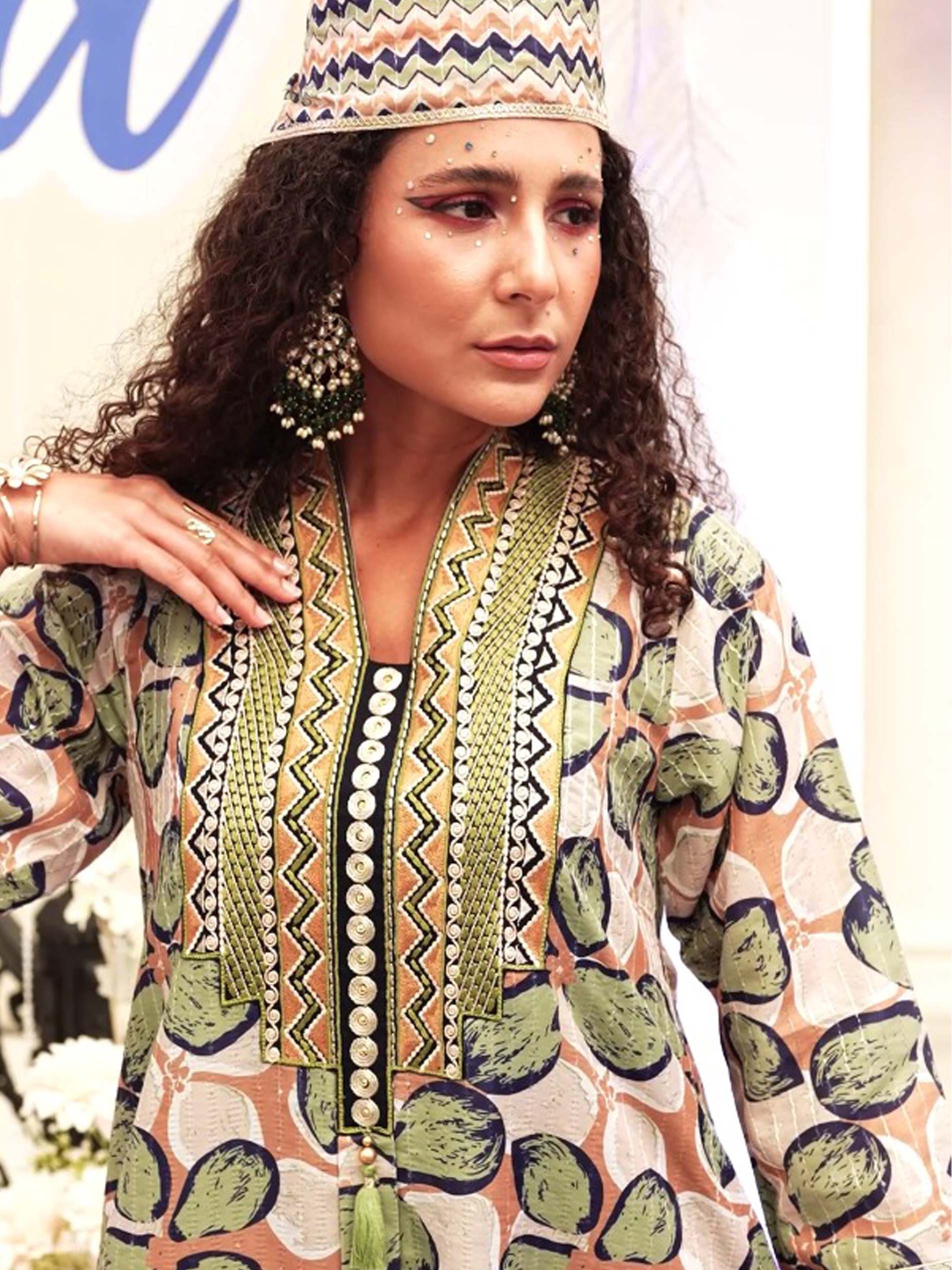 هذه القطعة الفنية يجب أن تكون جزء من خزانتك، فهي مصنوعة من القطن الناعم باللون الأخضر والبني والرمادي، ومزودة بنقشة أوراق الشجر مع أكمام طويلة وتطريز على الصدر.