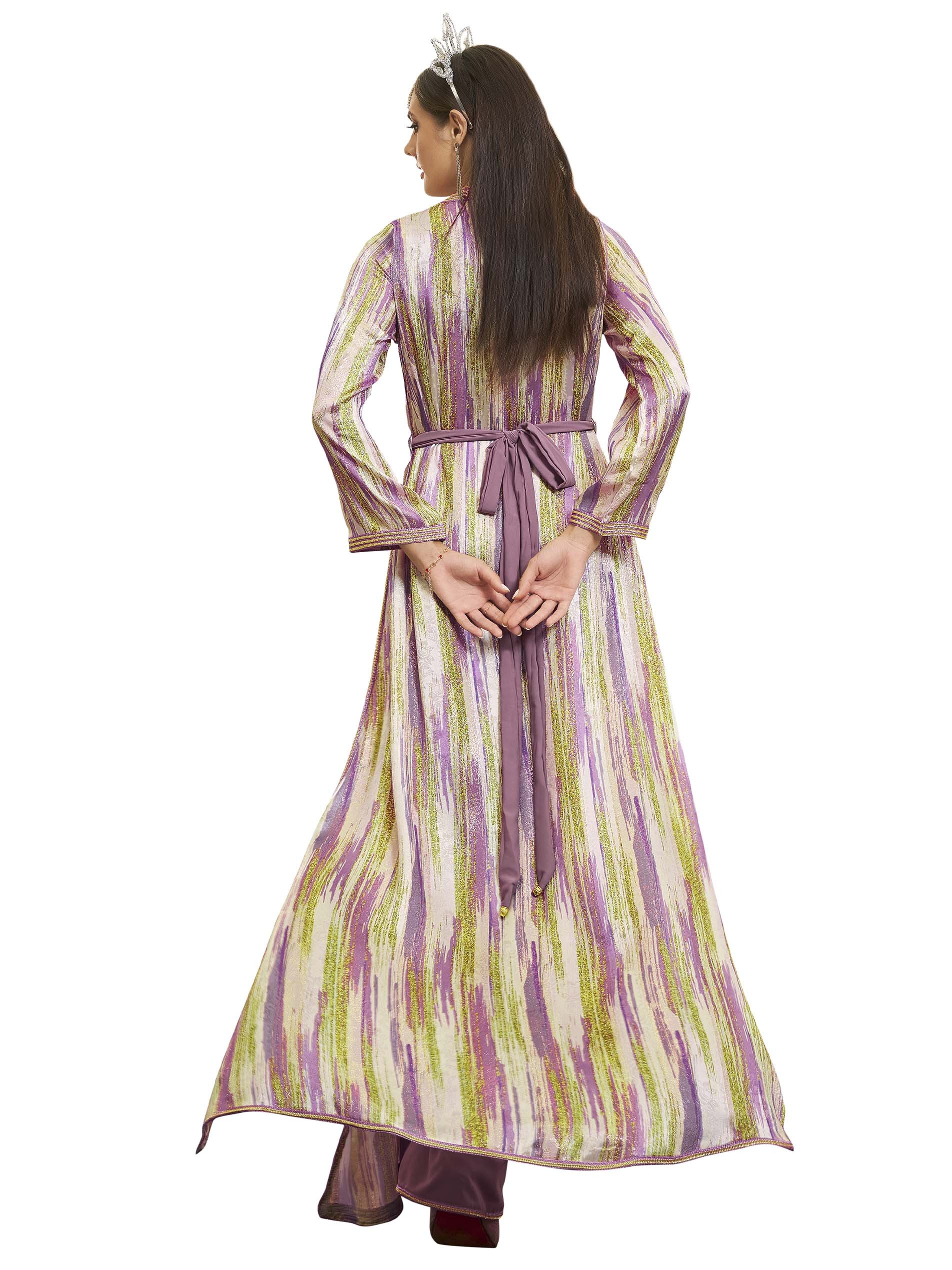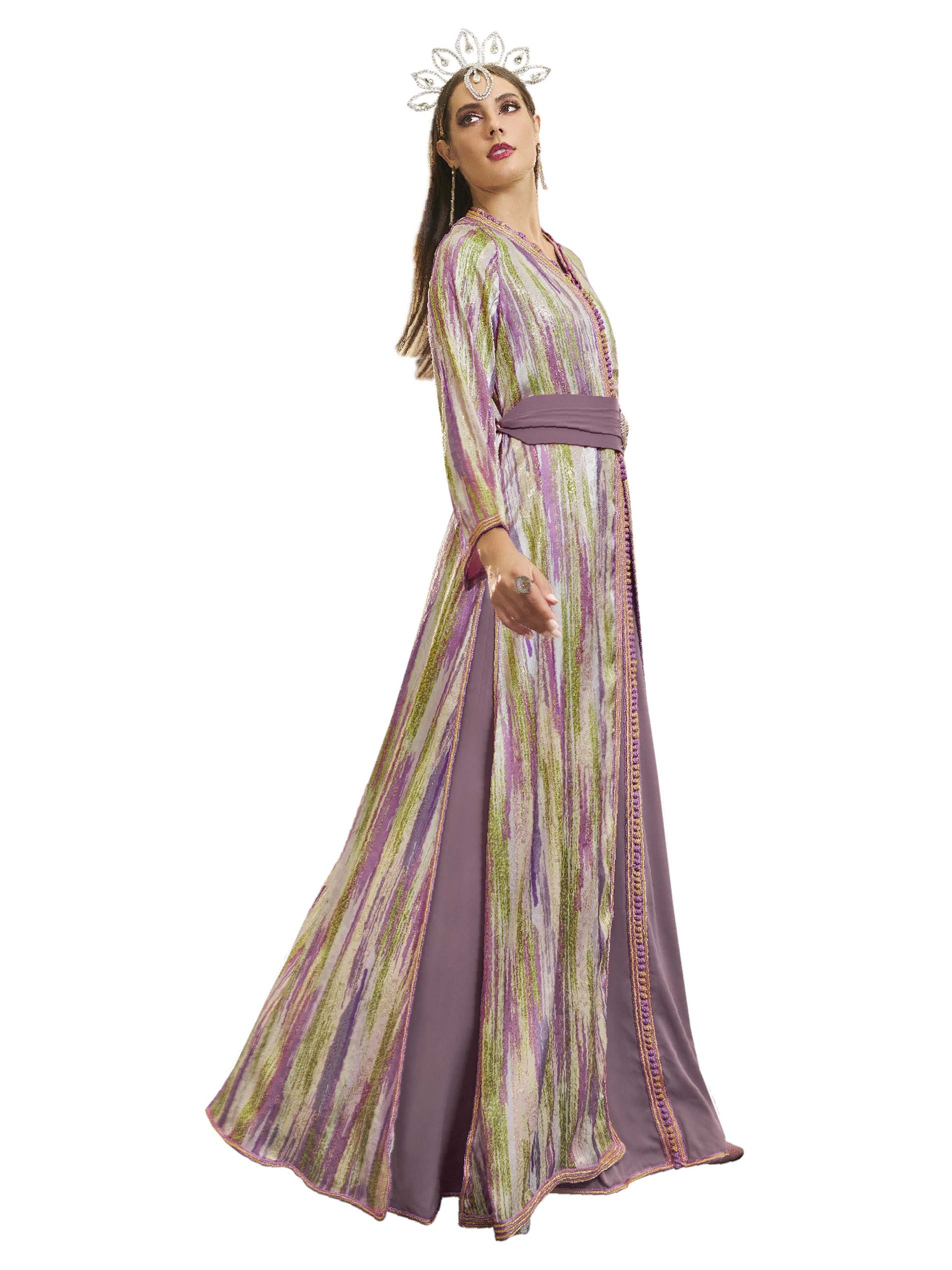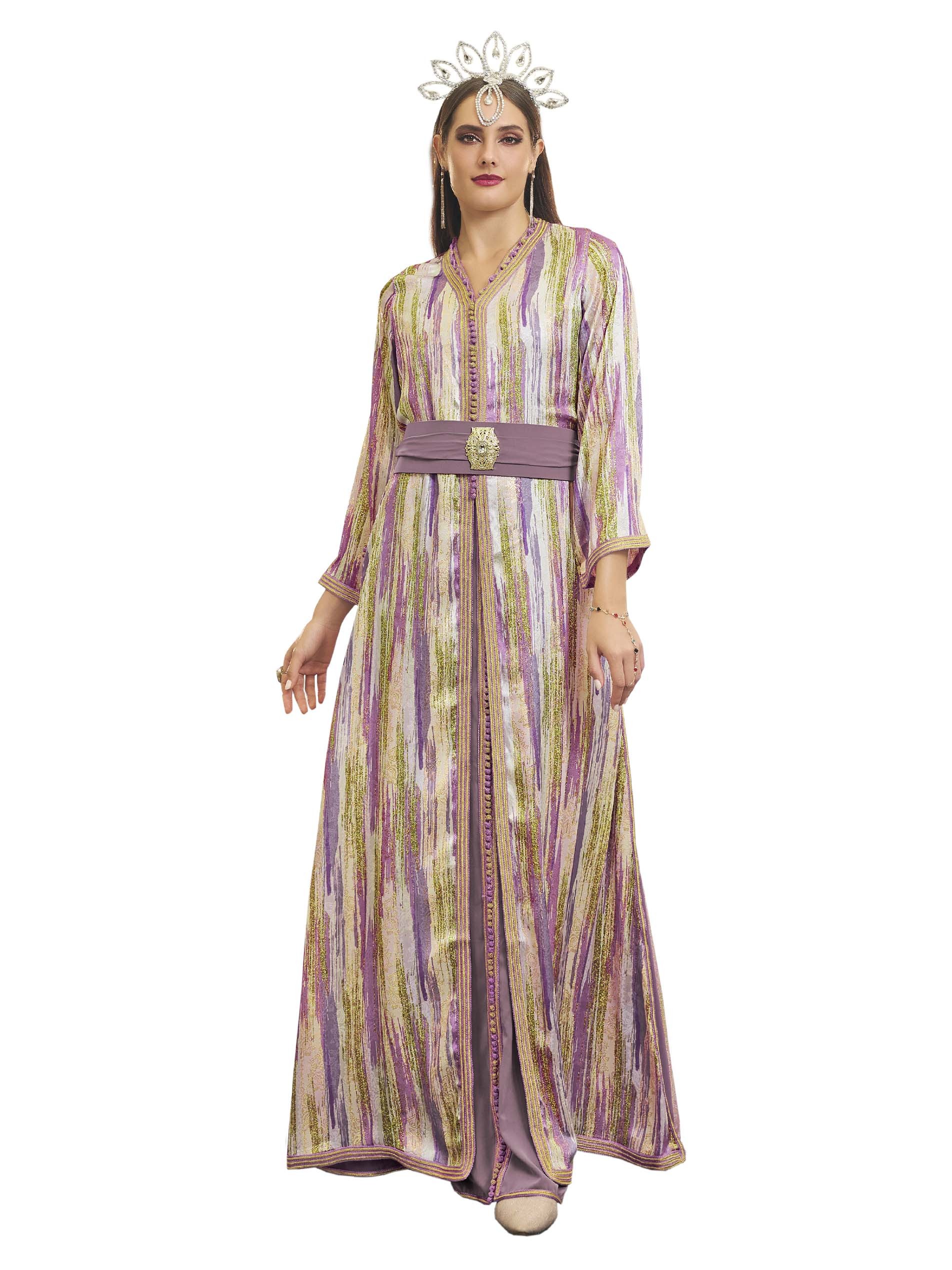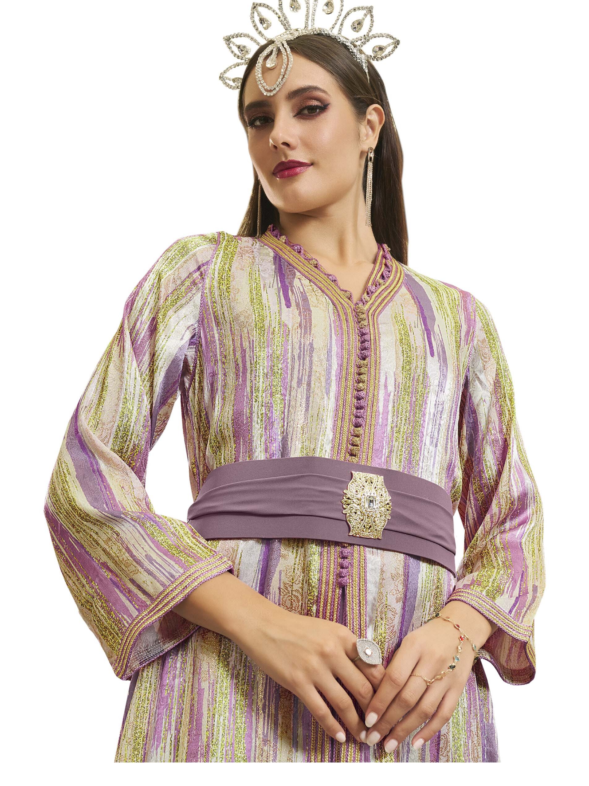 جلابية من القطن مصممة باللونين الذهبي والبنفسجي مع أكمام طويلة وحزام أنيق على الخصر لاطلالة رمضانية لافتة.