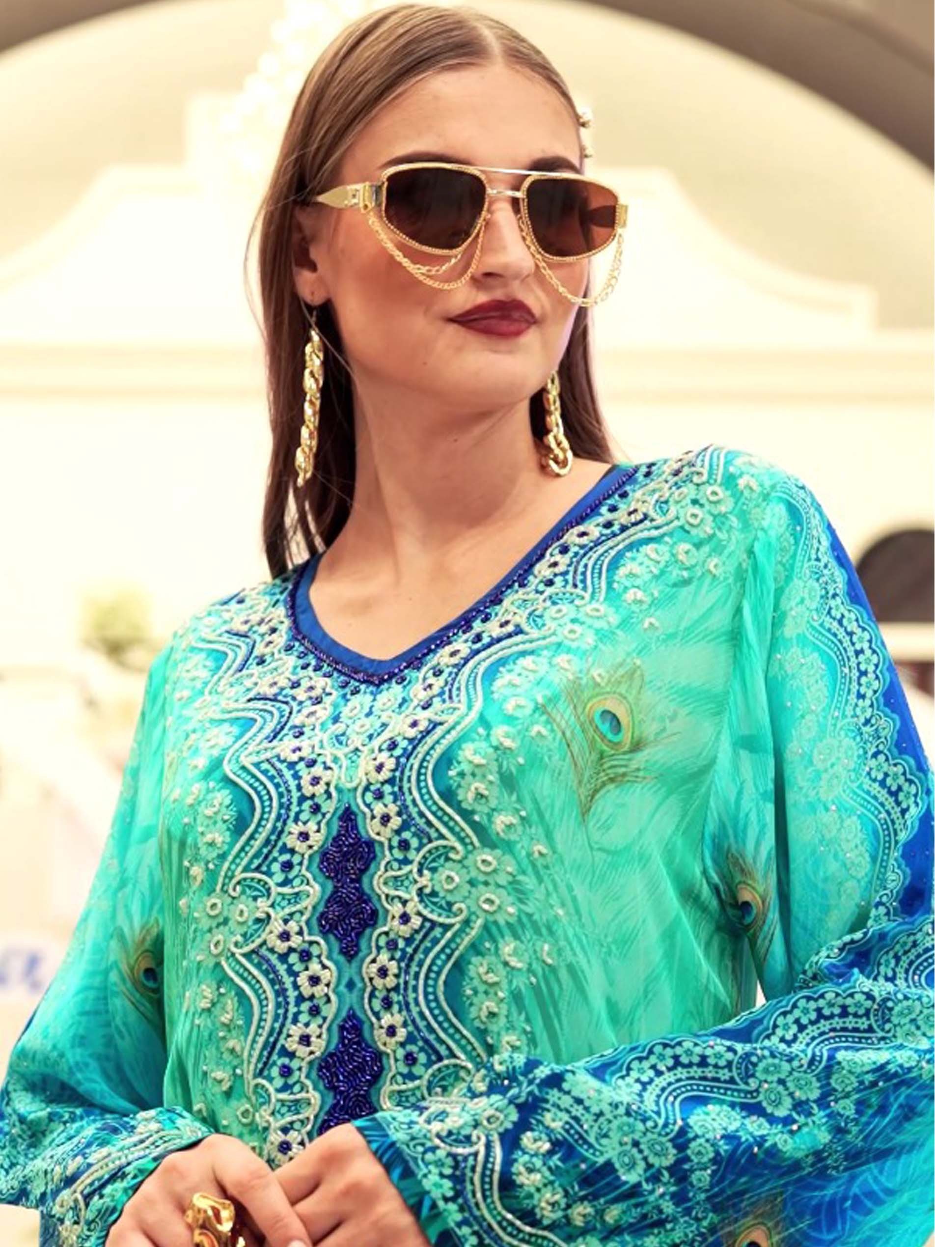 اذا كنتي من محبي اللون الأزرق، تعتبر هذه الجلابية الاختيار الأمثل لك، فهي مصممة من القطن بطبعات مميزة وملونة بدرجات اللون الأزرق الفاتح والغامق. ويكتمل التصميم بنقشة الزهور البيضاء مع أكمام طويلة لاطلالة راقية في المناسبات.