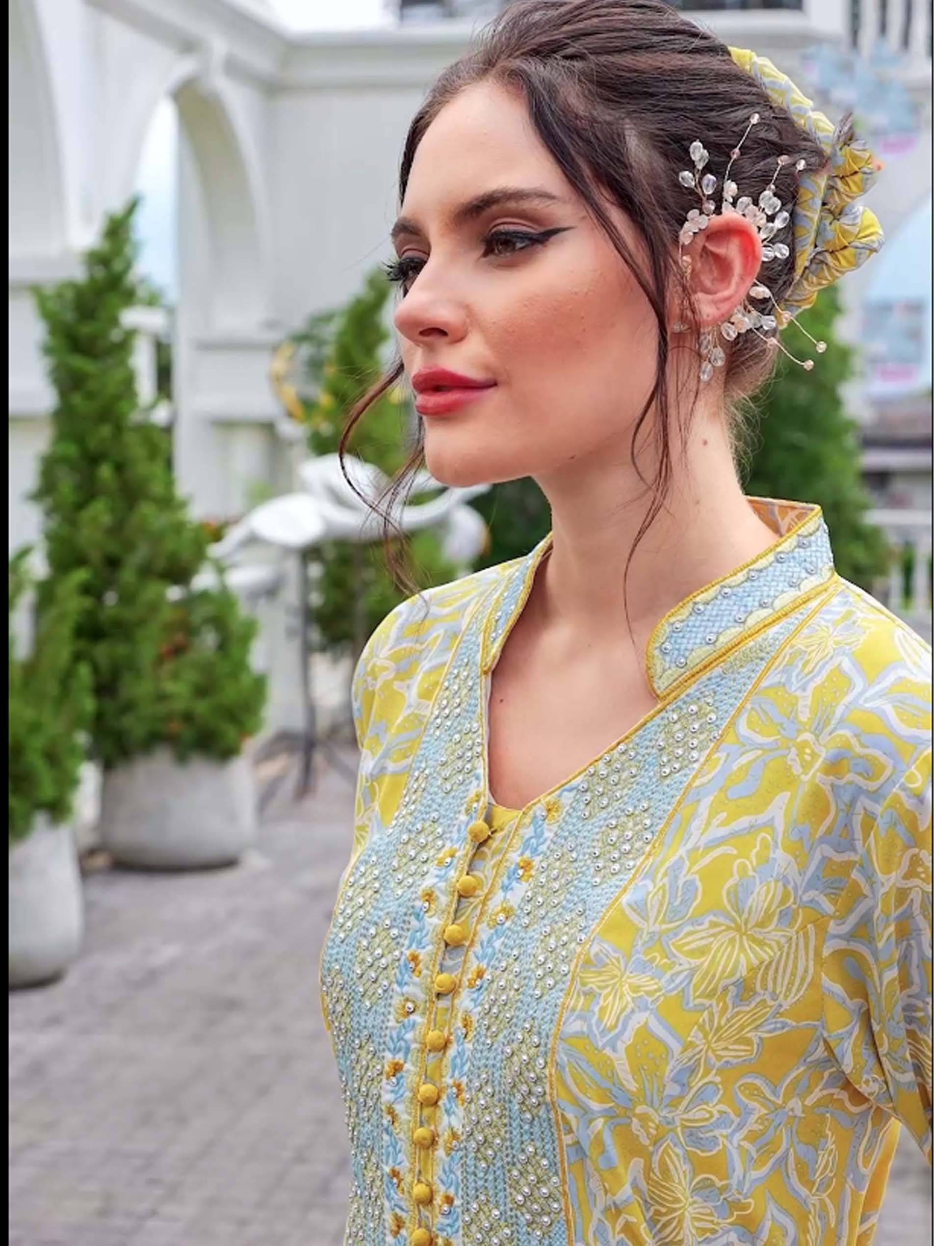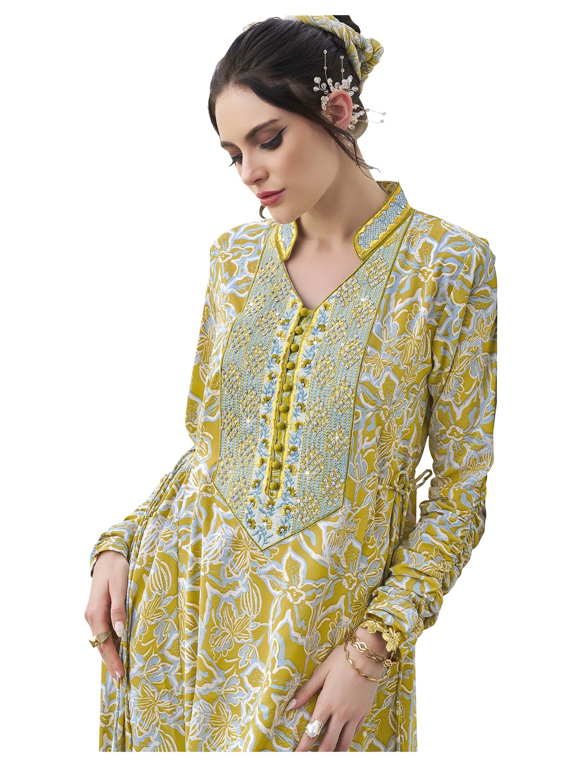 جلابية قطنية مصممة بنقشة الزهور باللونين الأصفر والأبيض مع أكمام طويلة، نقشة على الصدر وأزرار أمامية لاطلالة ساحرة في المناسبات.