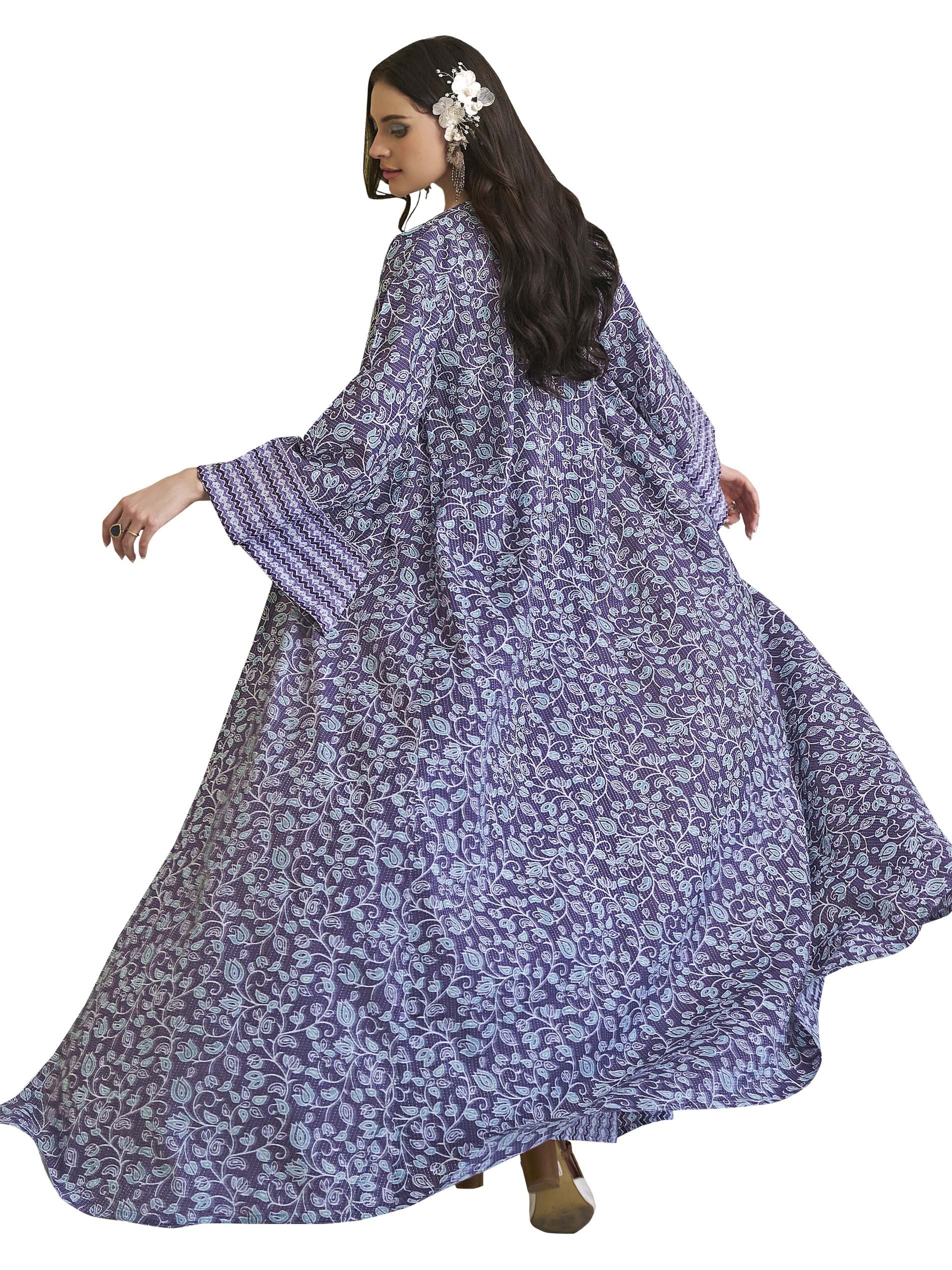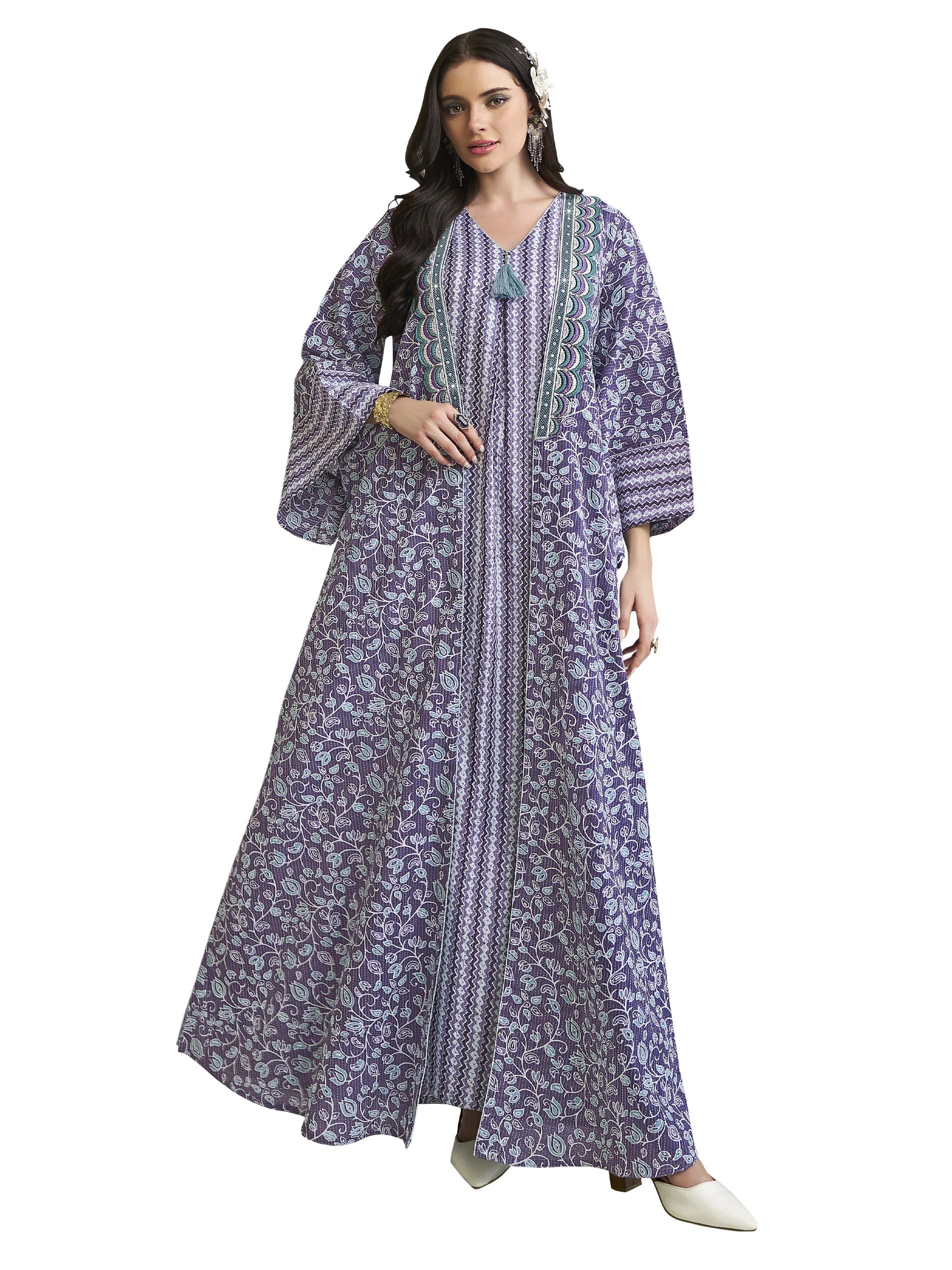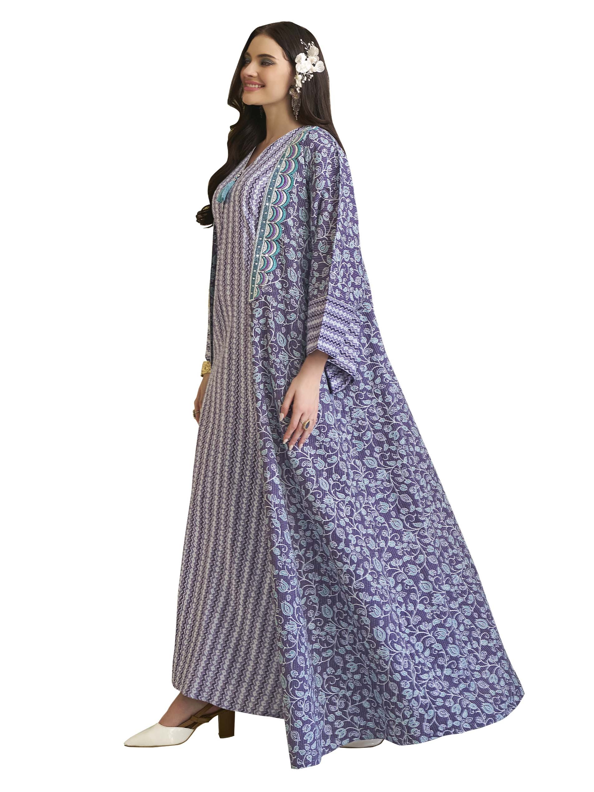 اذا كنتي من محبي اللون الأزرق، فهذه الجلابية تعتبر الاختيار الأمثل لك، فهي مصممة من القطن بنقوشات فريدة من نوعها ، ويضفي عليها اللون الأبيض لاطلالة رائعة في الحفلات والمناسبات.
