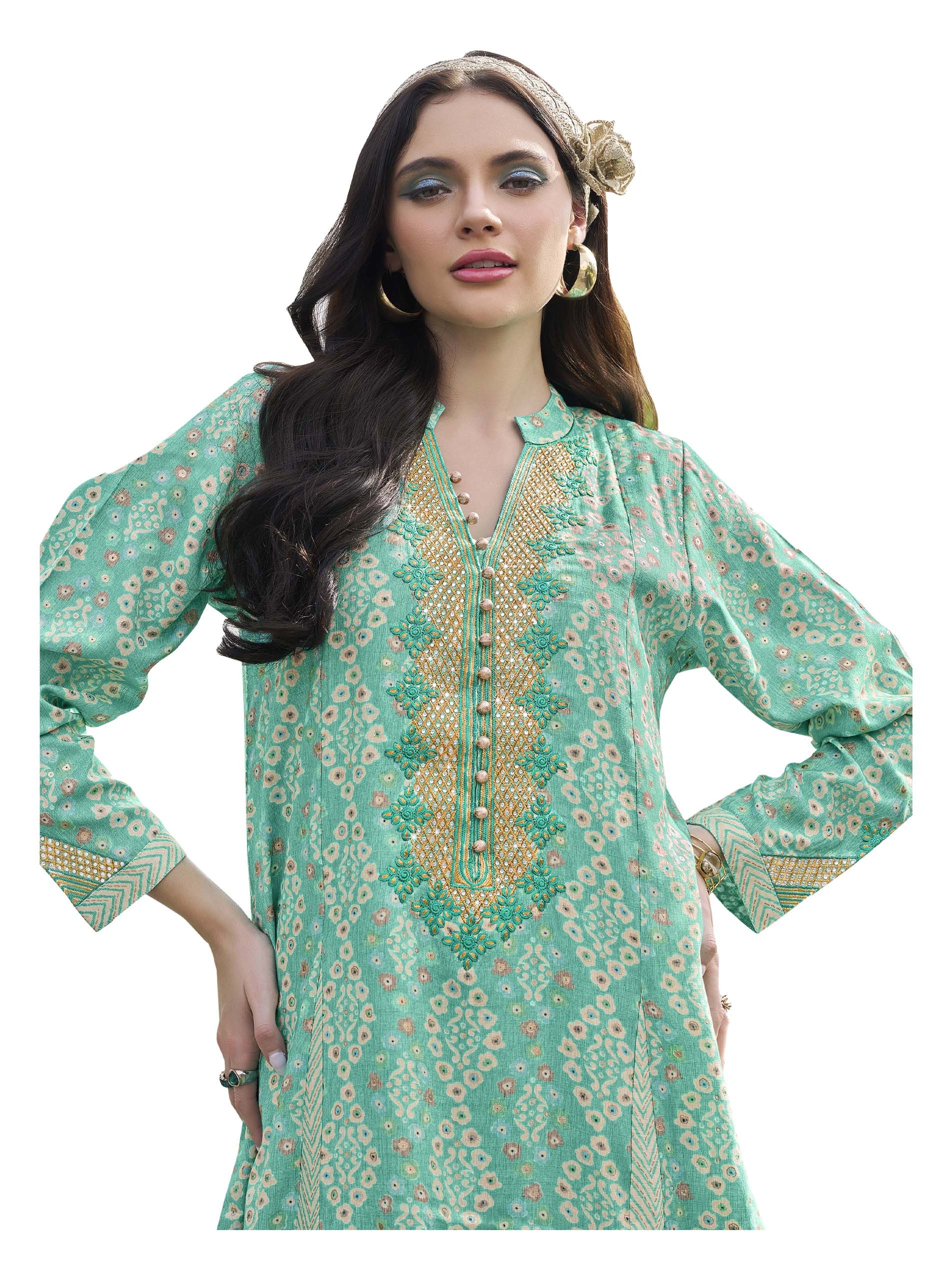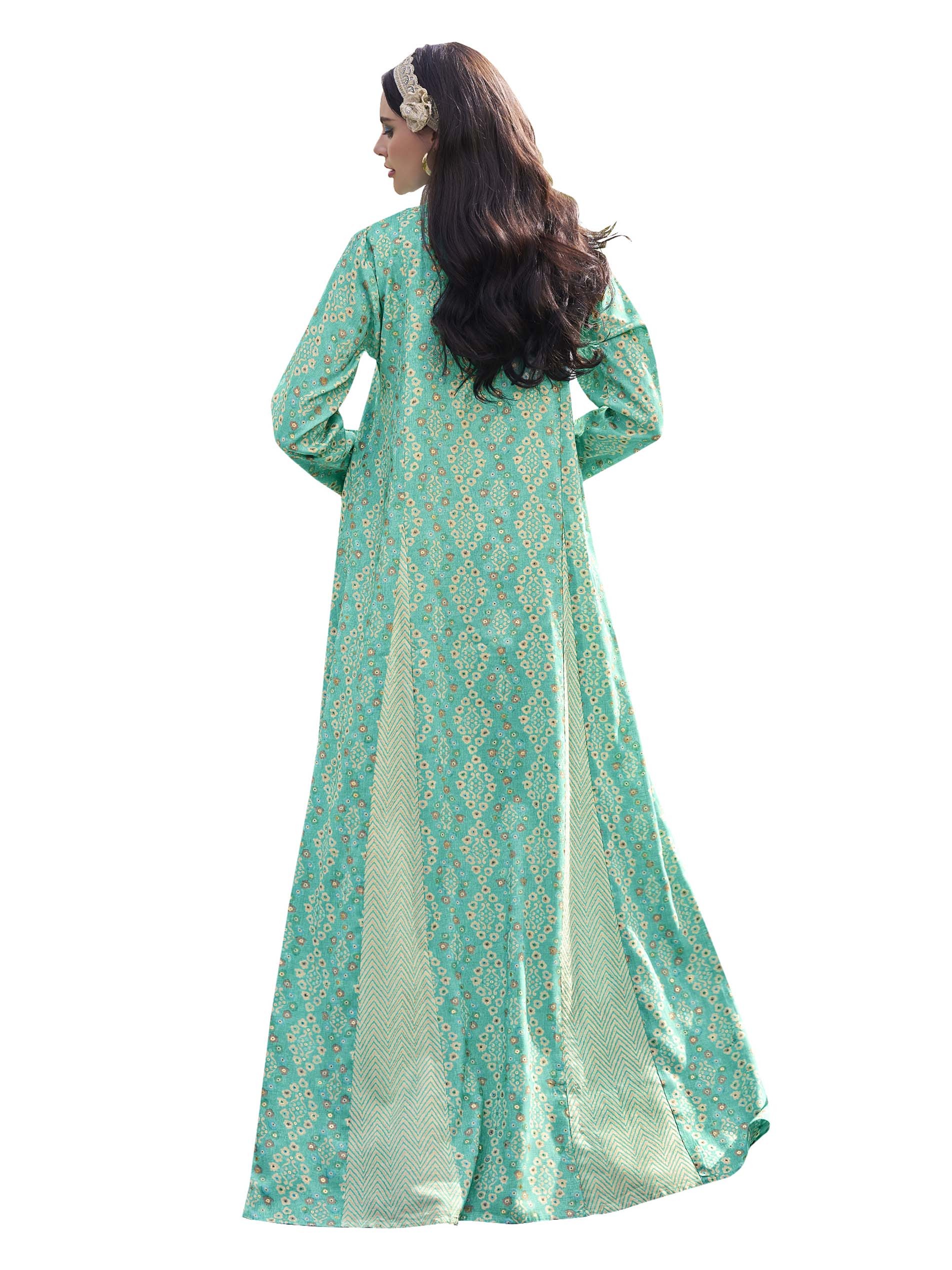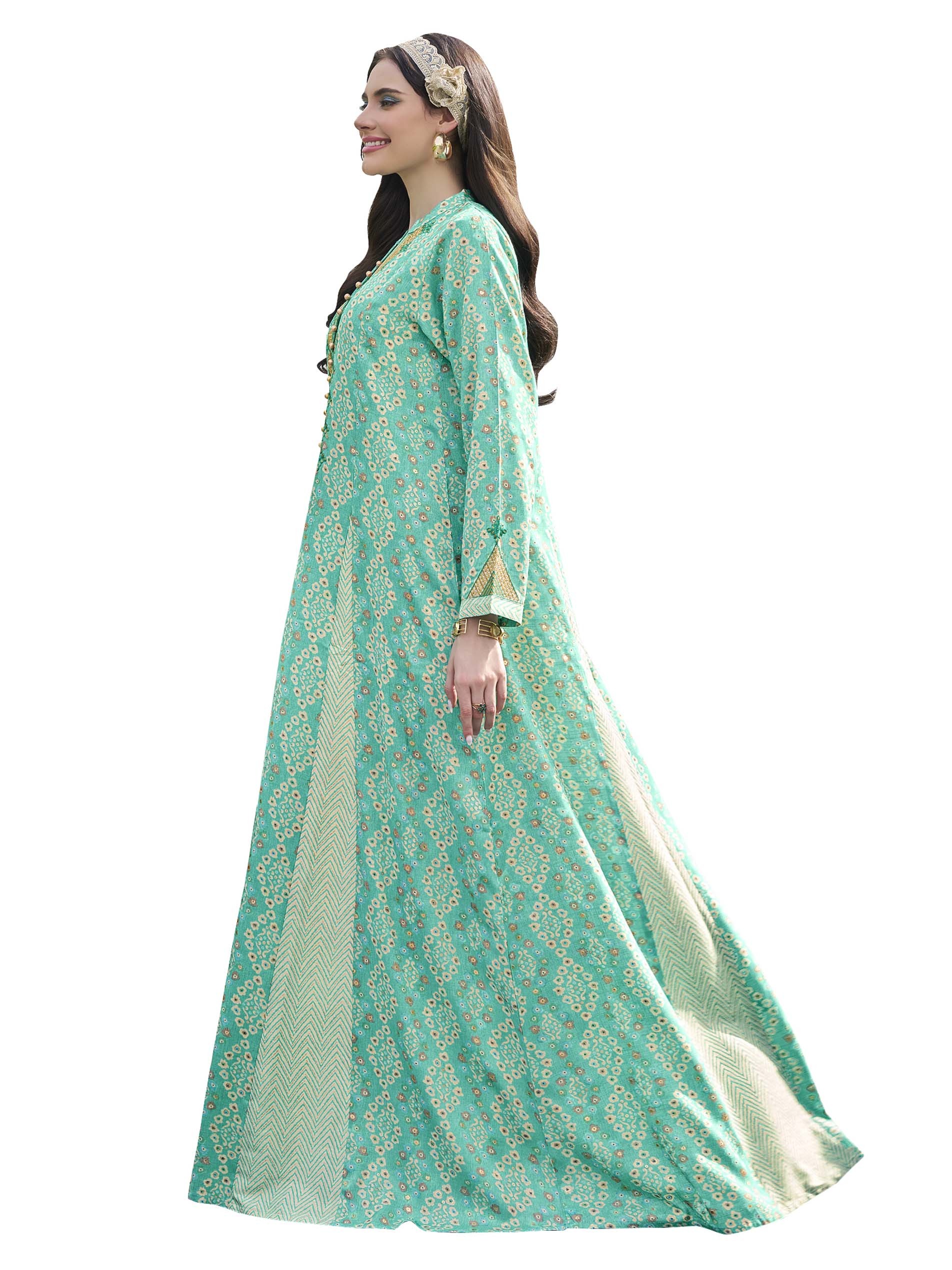 تألقي في جلابية من القطن باللون الأزرق السماوي مصممة بنقشة الزهور البيضاء مع نقشة الخطوط المتعرجة. ويكتمل التصميم بنقشة ذهبية على الصدر مع أزرار أمامية.