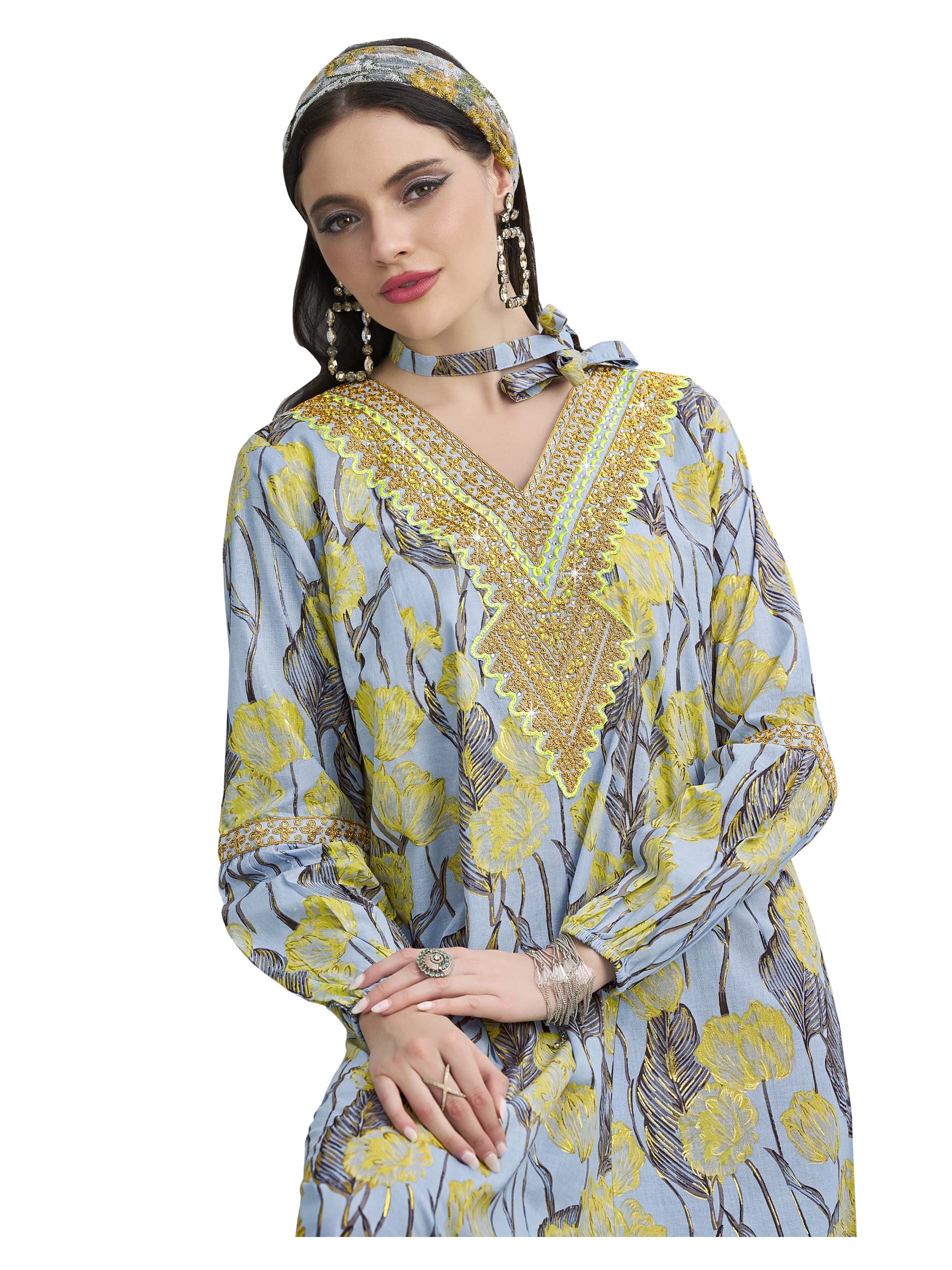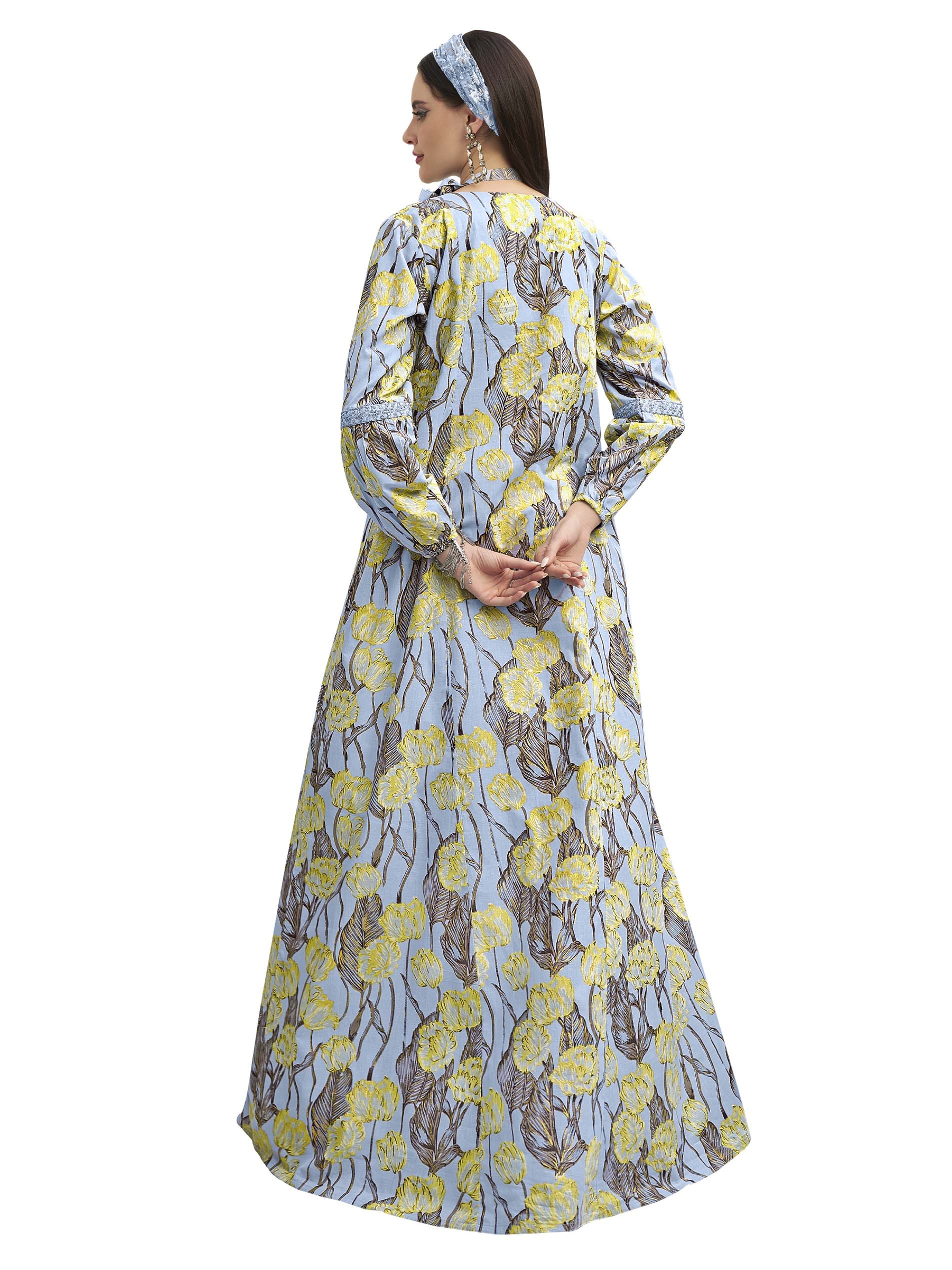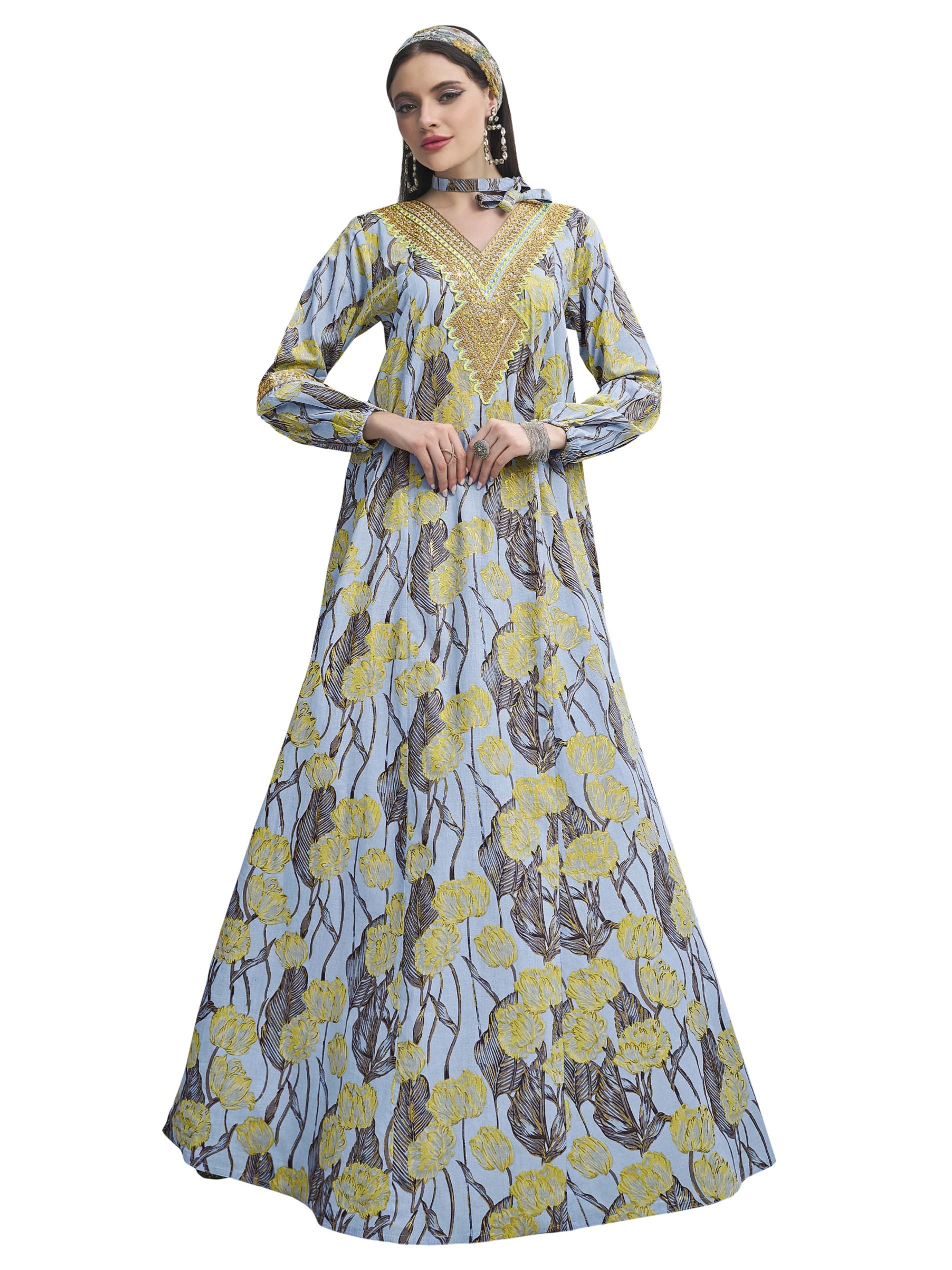 جلابية من القطن باللون الأزرق السماوي مزينة بنقشة الزهور وأوراق الشجر باللونين الأسود والذهبي مع أكمام طويلة وتطريز على الصدر.