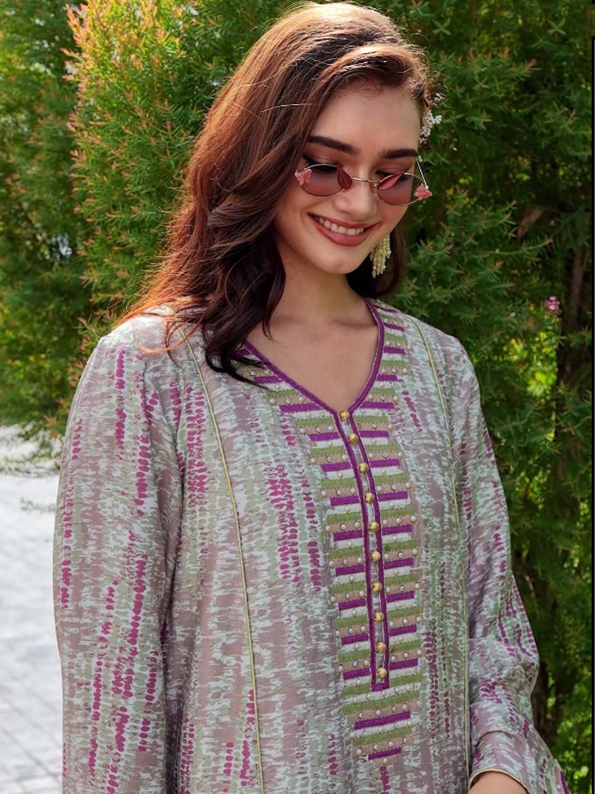 جلابية من القطن بتصميم رائع ومختلف مع أكمام طويلة وتطريز على الصدر باللونين الأخضر والبنفسجي مع أزرار أمامية ذهبية.