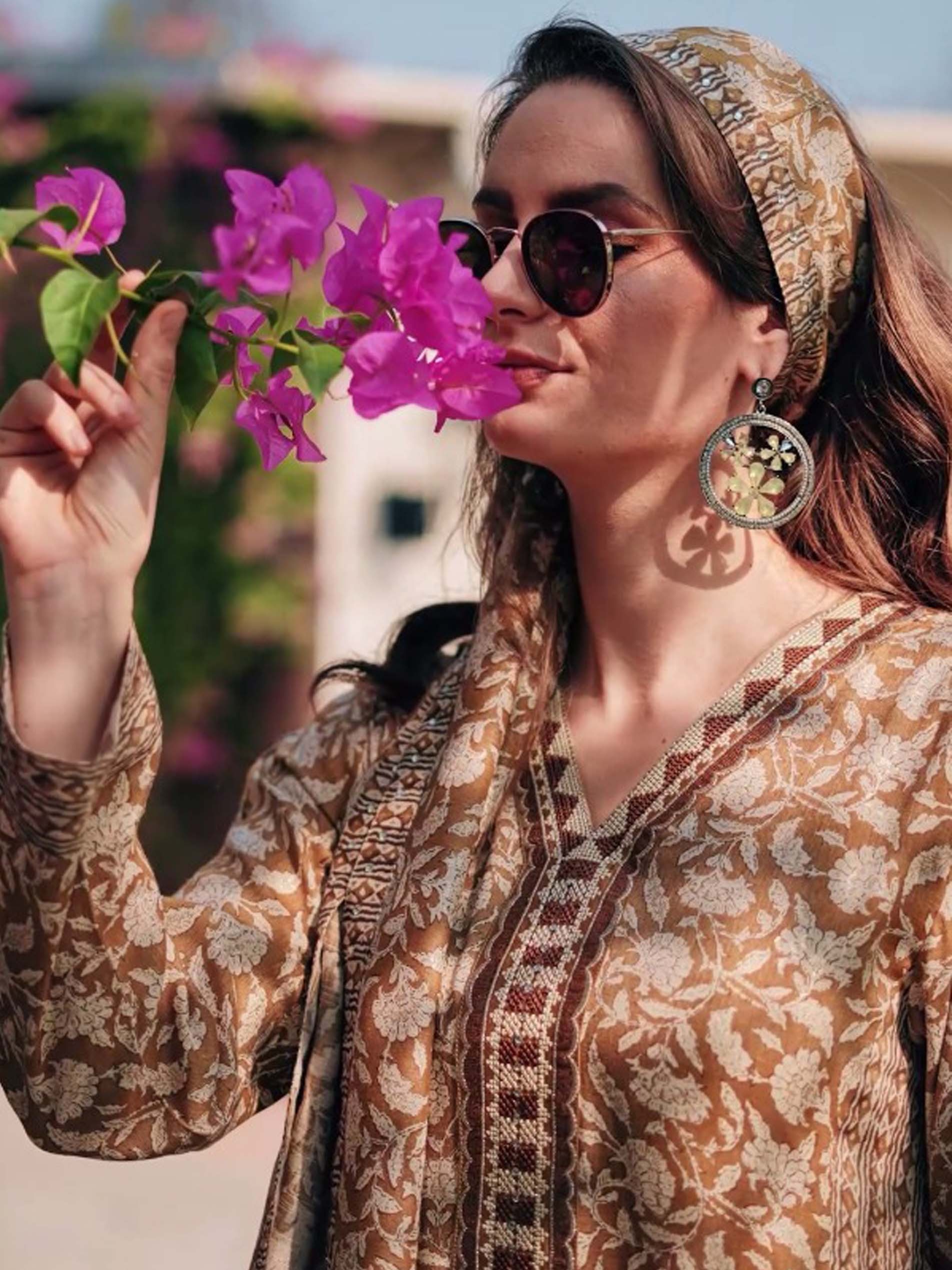 جلابية بنية اللون مصممة بنقشة الأزهار البيضاء لتمنحك اطلالة مميزة في الصيف. ويكتمل التصميم مع الأكمام الطويلة والتطريز الرائع على الصدر.