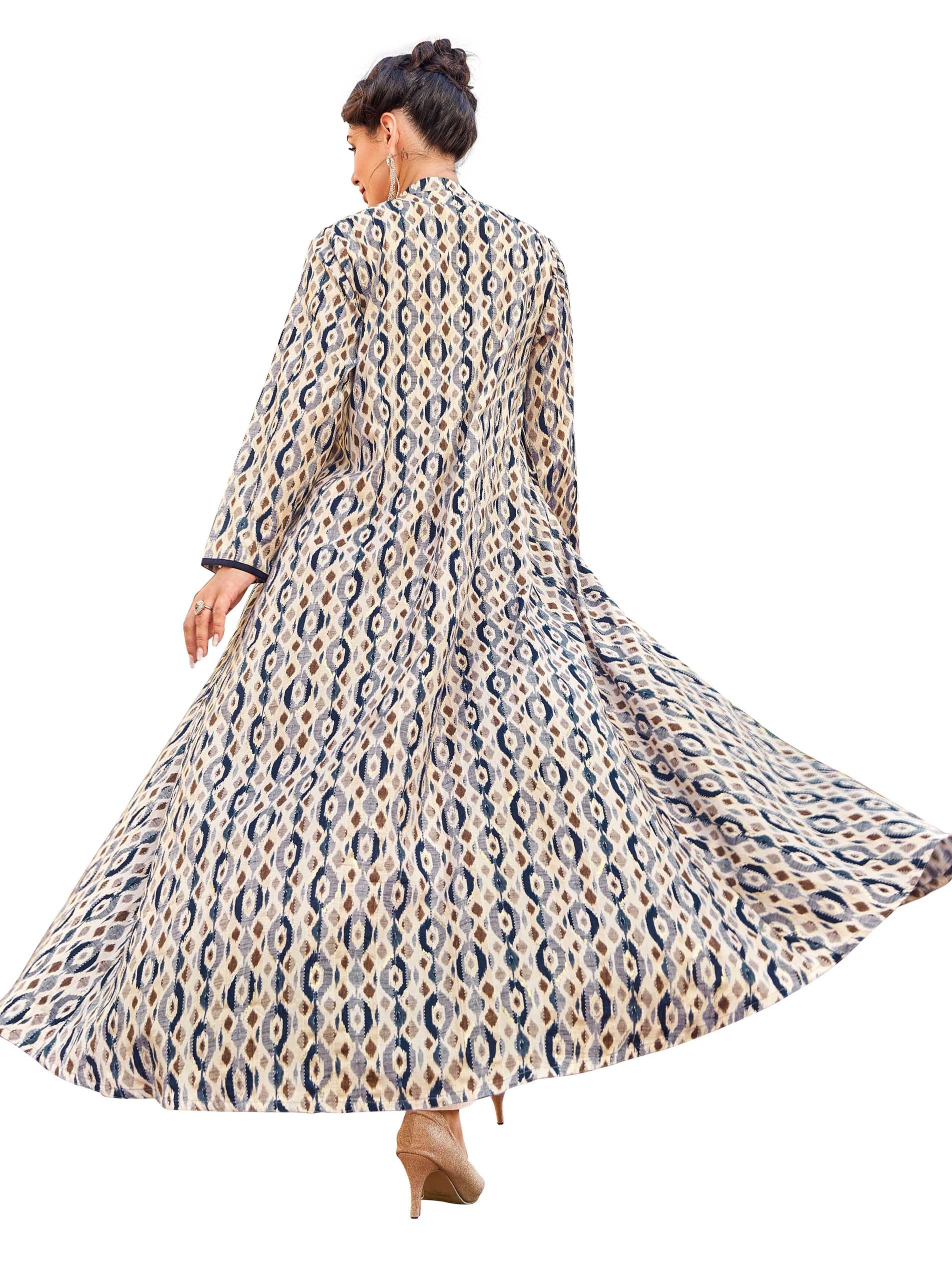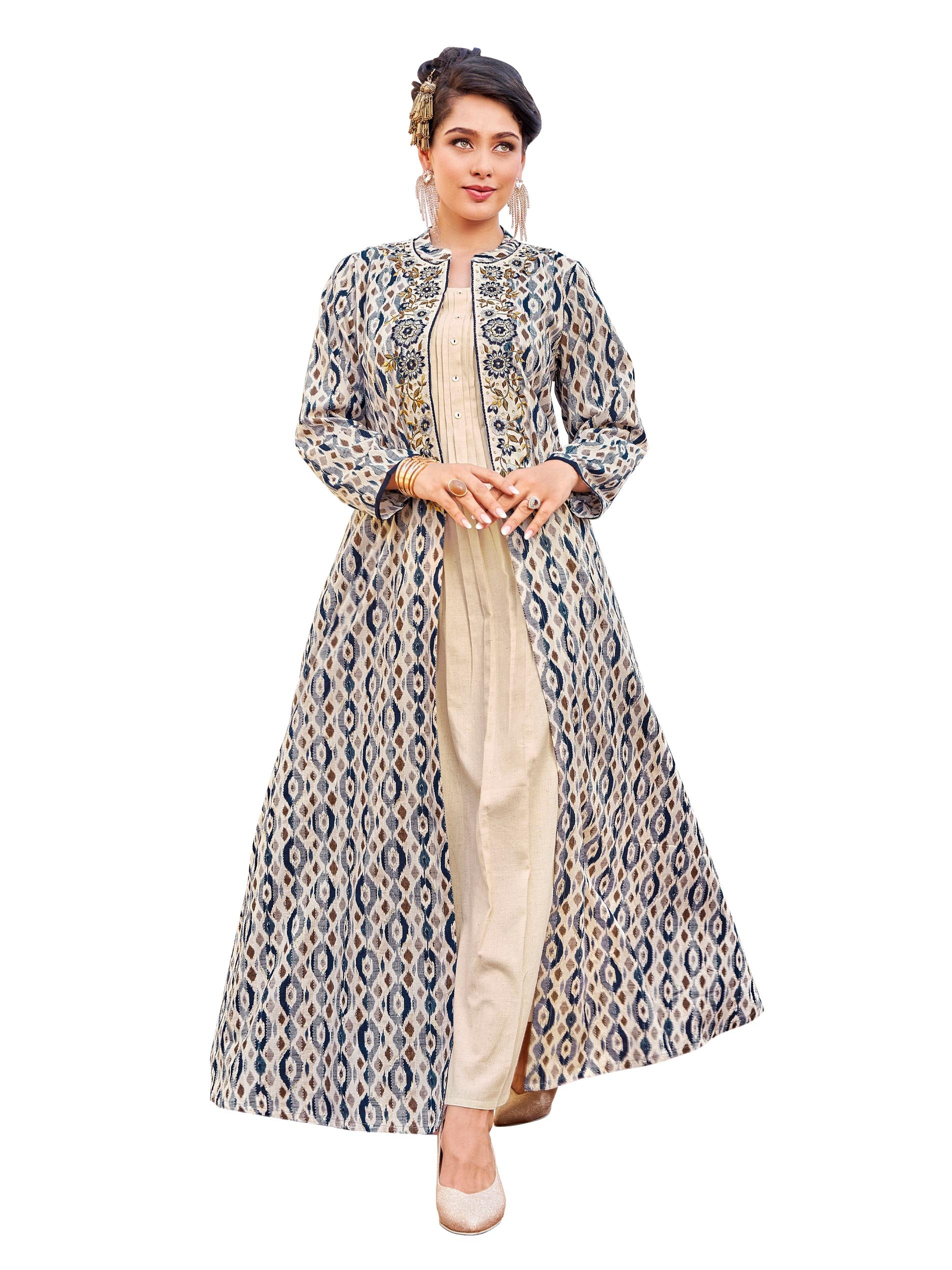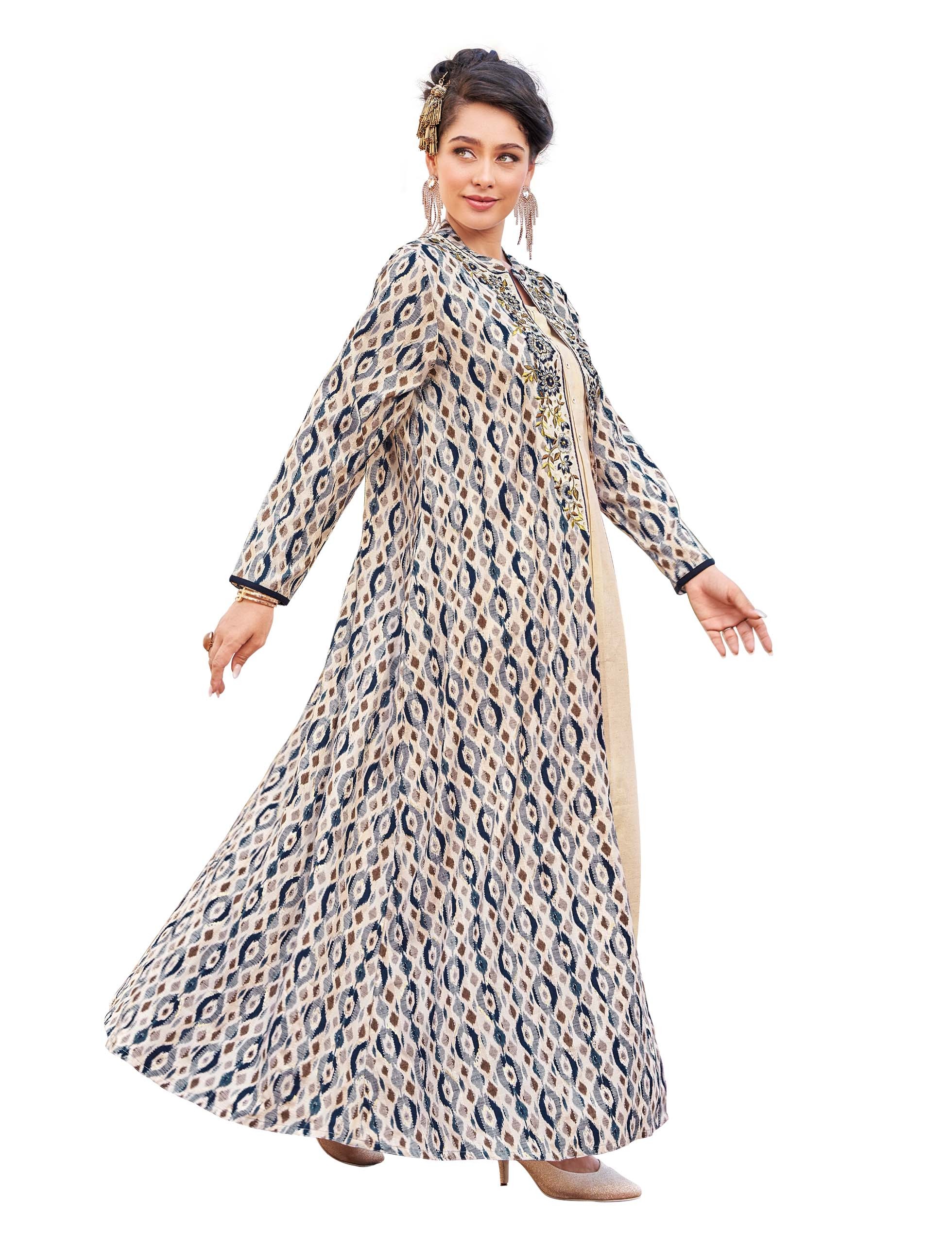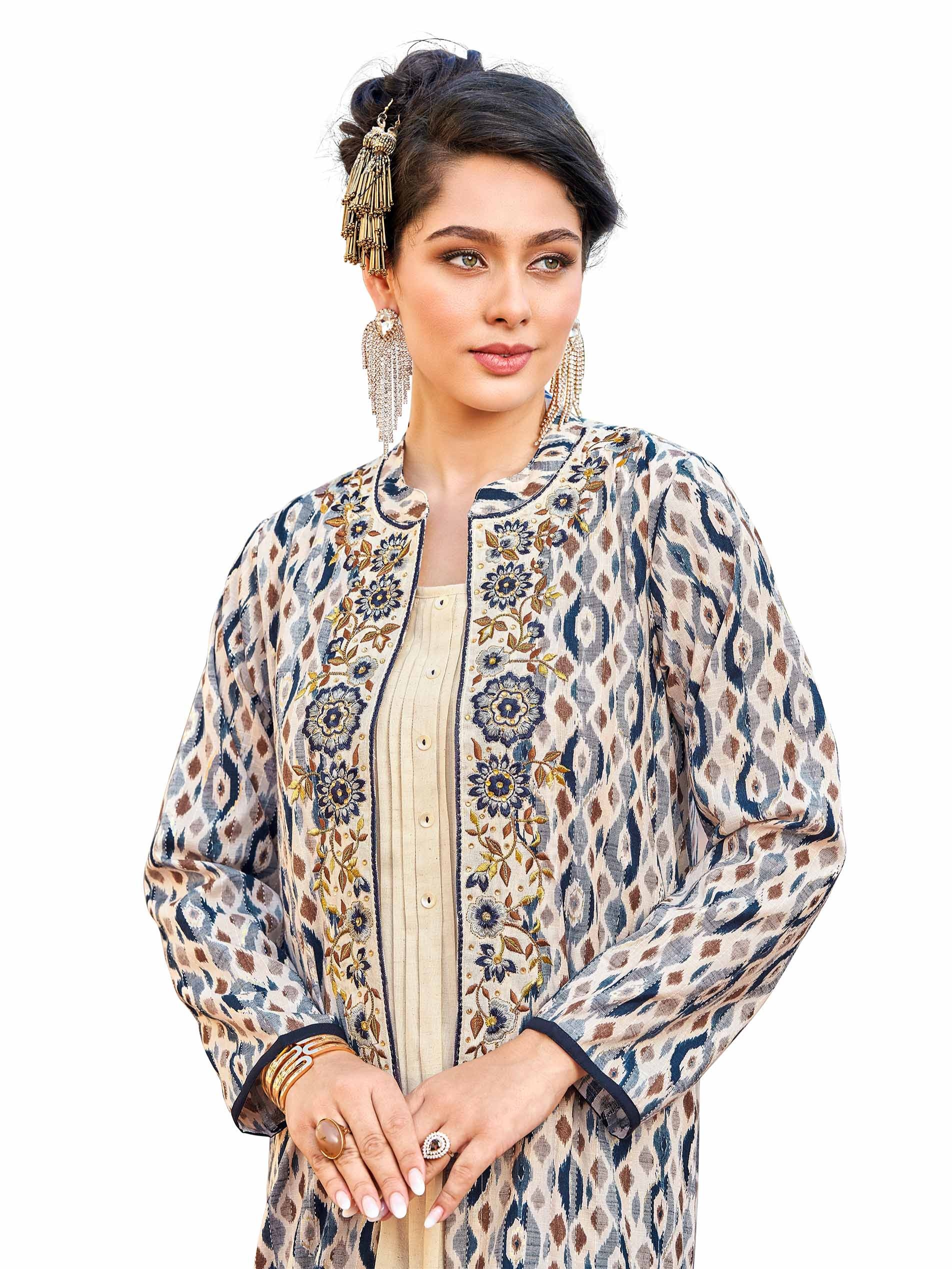 Two-piece off-white modern jalabiya with a luxurious design, complemented by an a jacket-shaped piece with distinctive and colorful patterns for a royal look on special occassions.