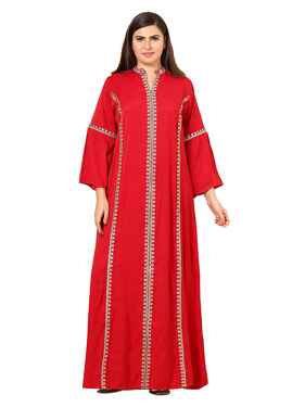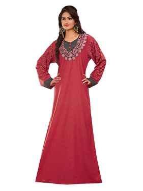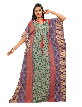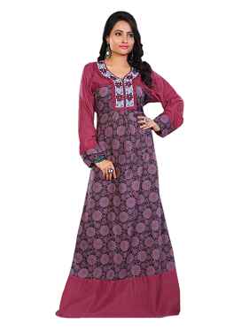 Navy blue is the colour of this season if you want to look your best. Go for this viscose and polyester full length jalabiya to cast a charming spell. The fabric is a floral fascination and the styling is emphasised with full sleeves, V neck and A line styling. Steal the show lady!
