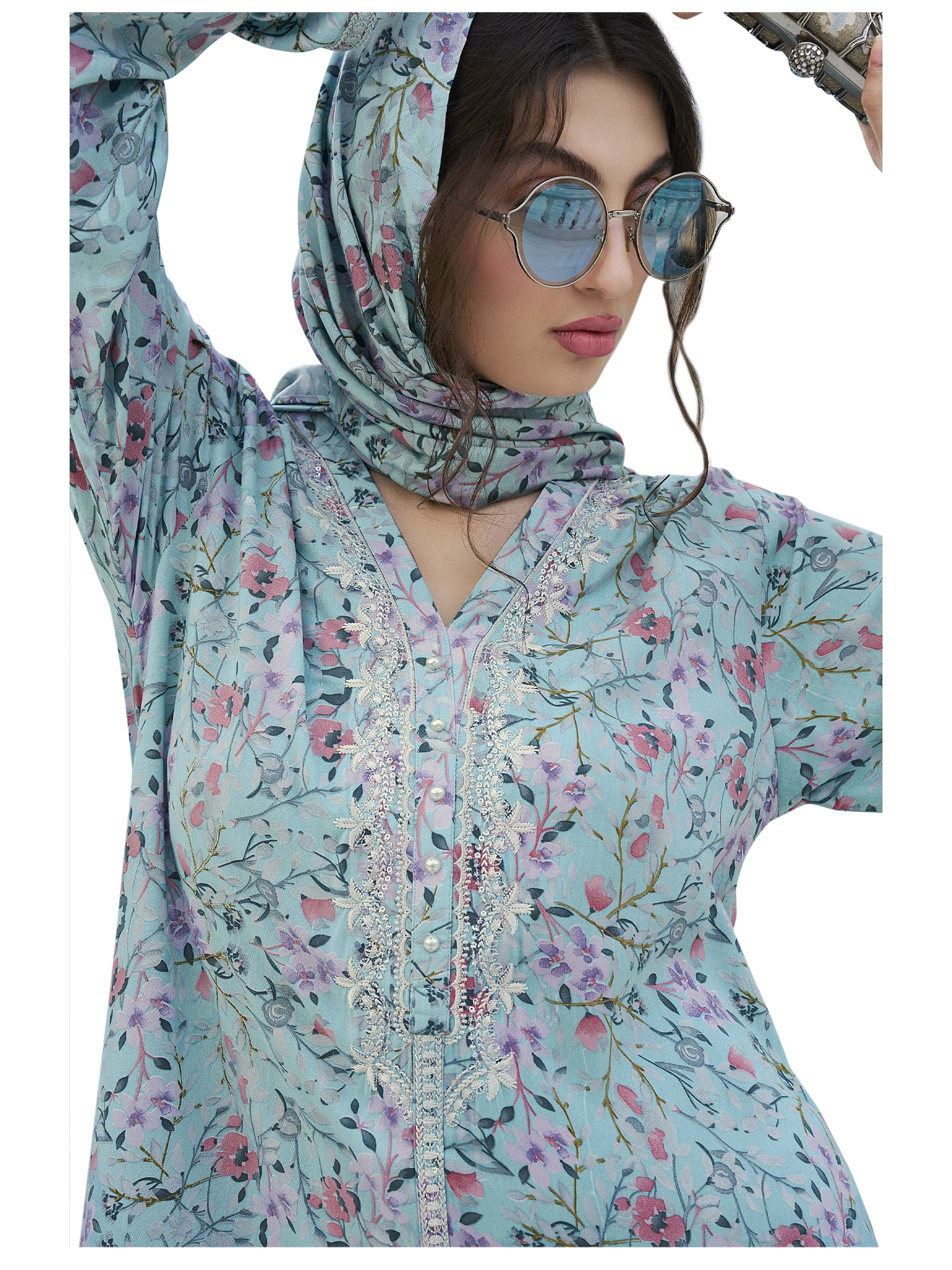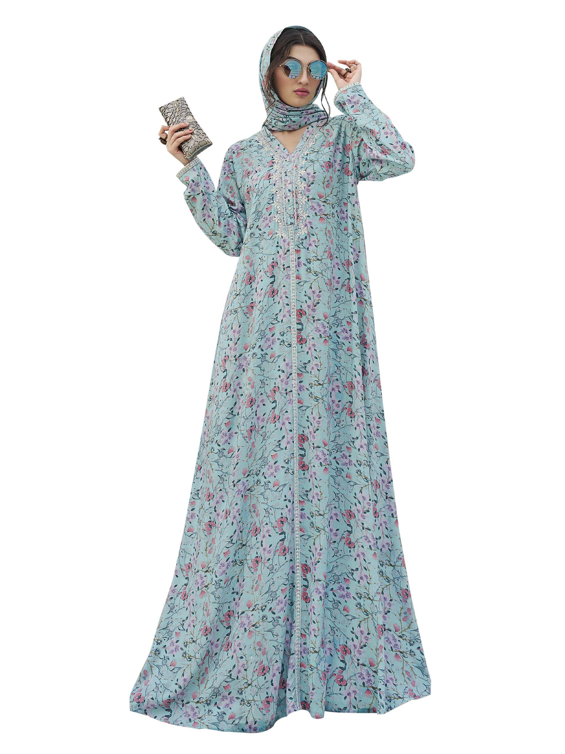 Step into ease with our blue cotton jalabiya that blends simplicity with elegance, designed with pink floral print, pattern on the chest and front buttons.