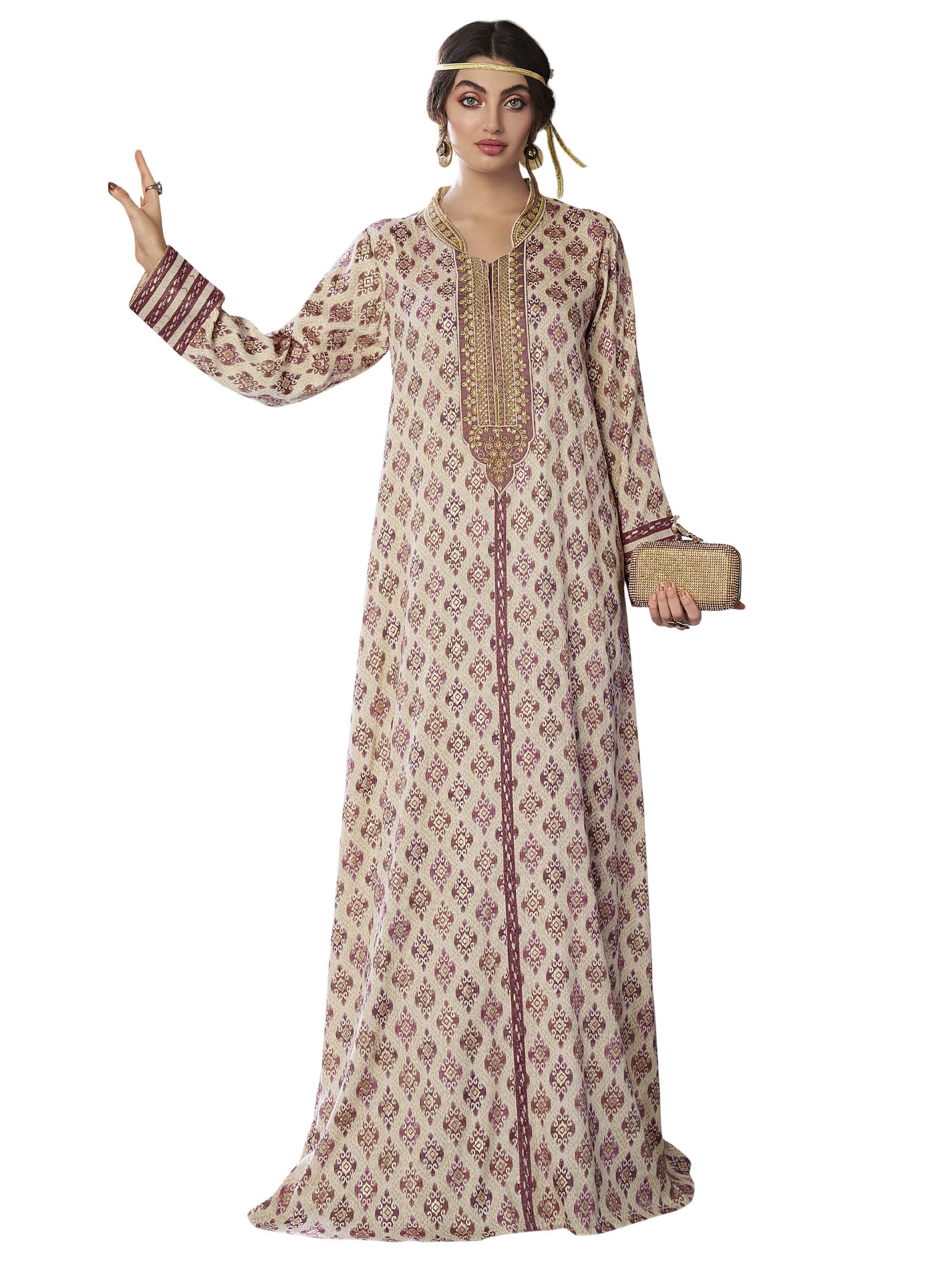 Steal the spotlight with your unique summer look and wear this long sleeve purple and silver printed jalabiya, designed with distinctive embroidery on the chest.
