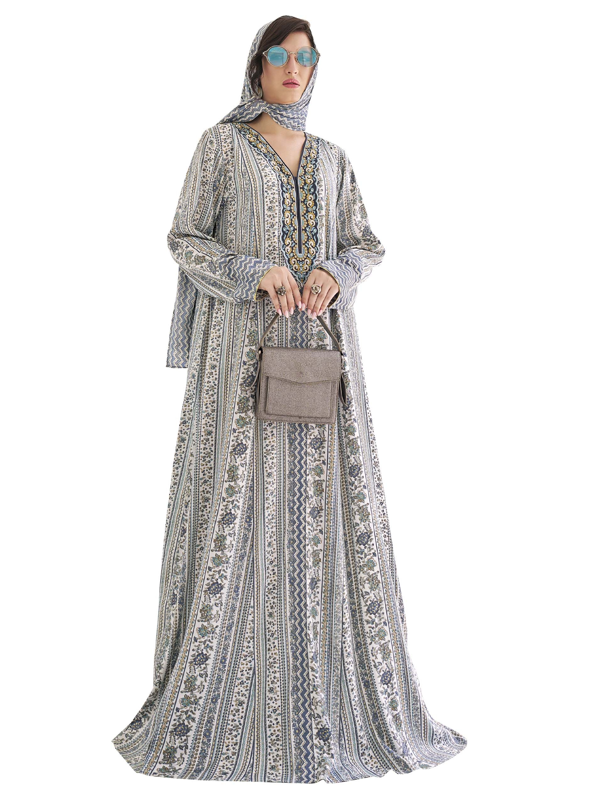 This jalabiya reflects your refined taste and attention to detail. It features a unique baby blue color and a unique design that combines wavy lines with flowers, creating a masterpiece. The design is completed with distinctive blue and gold embroidery on the chest.