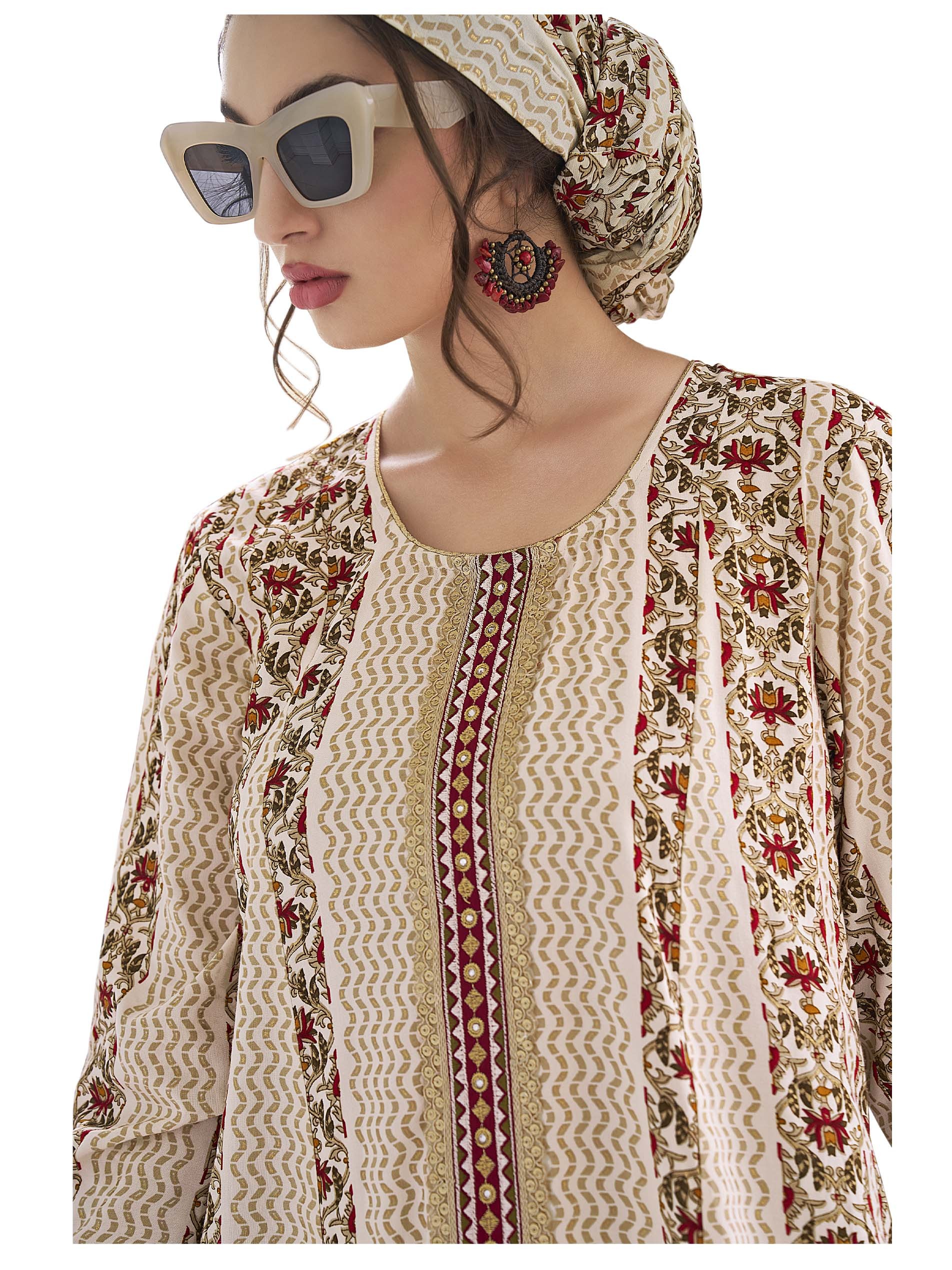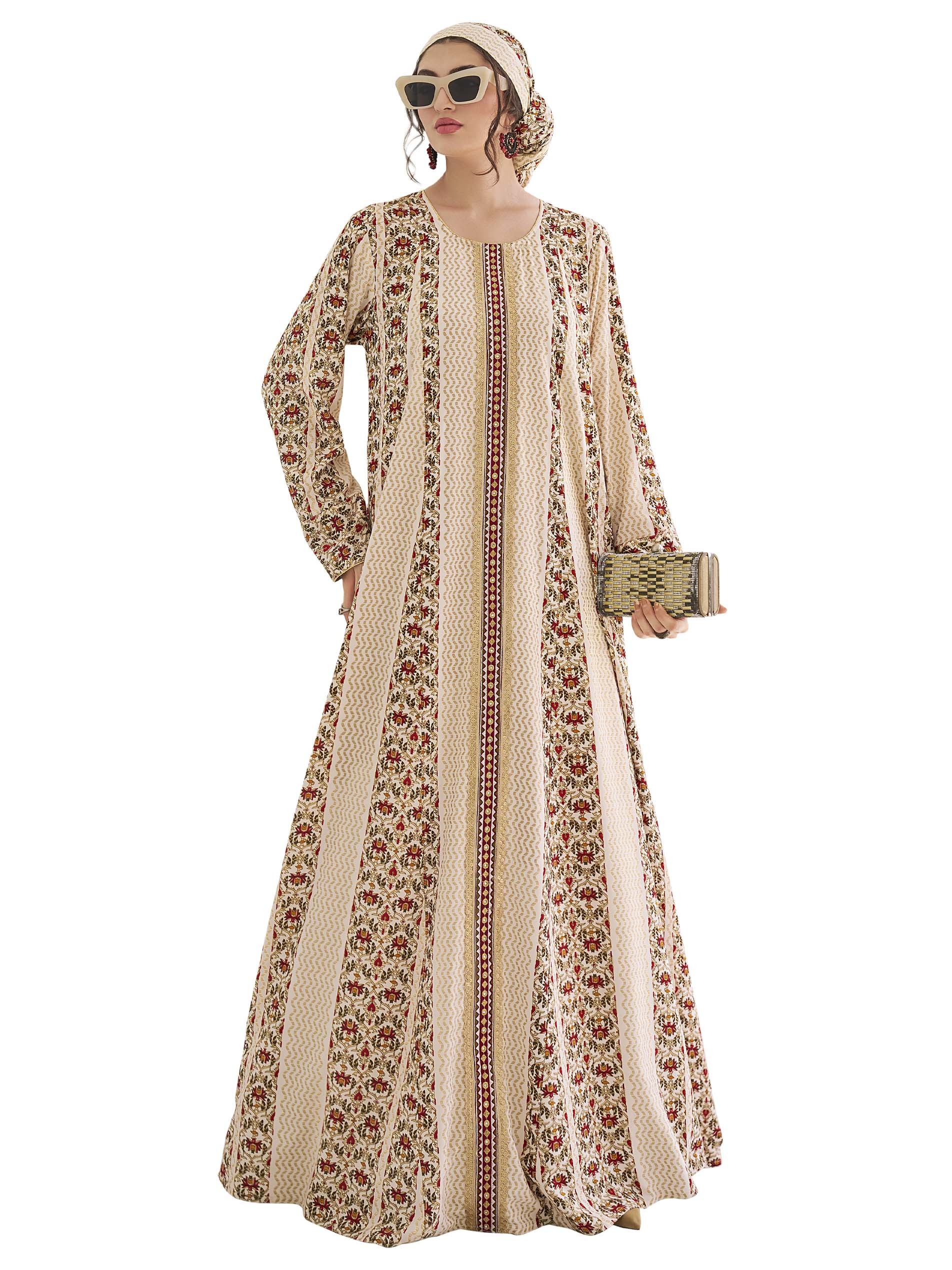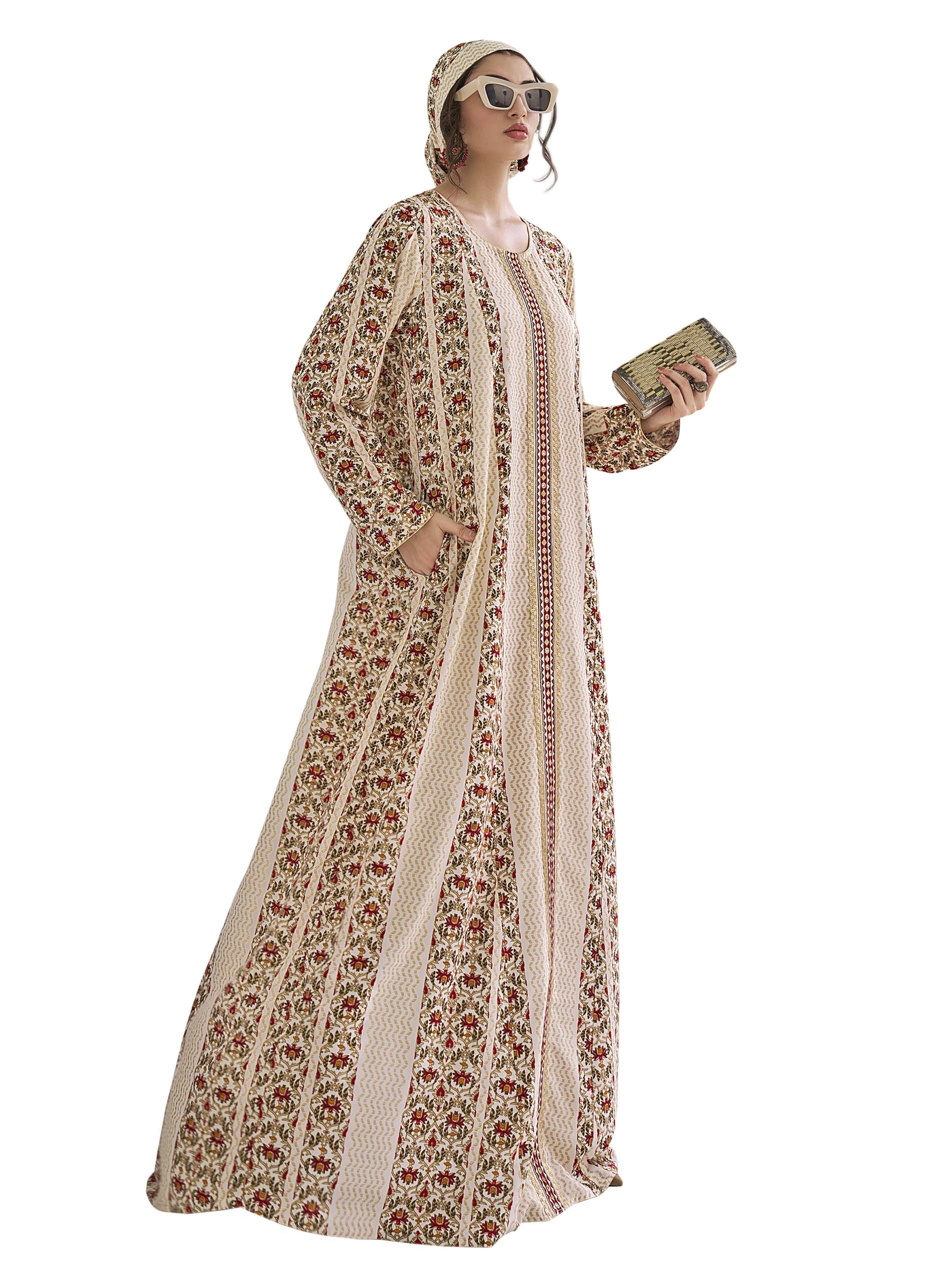 Jalabiya that reflects your femininity with a touch of luxury and sophistication! It features a modern design that combines wavy lines with flowers in gold and red for a unique summer look.
