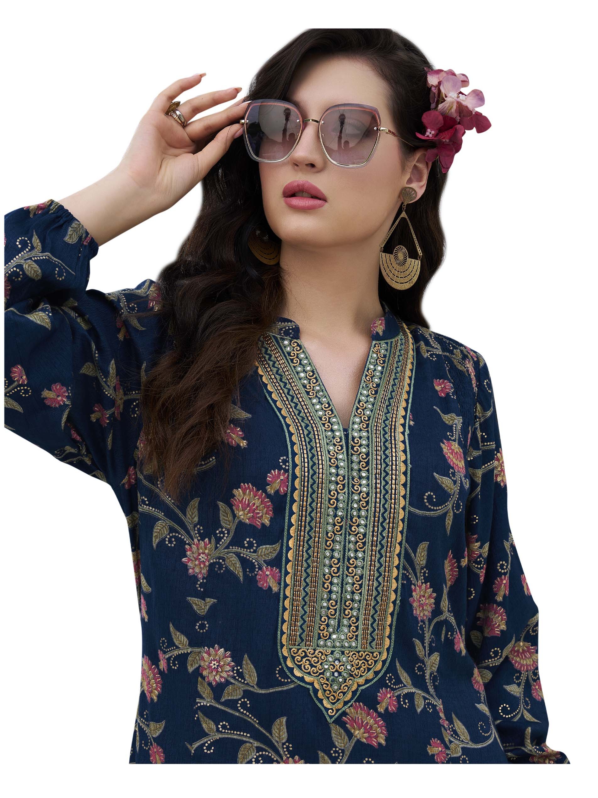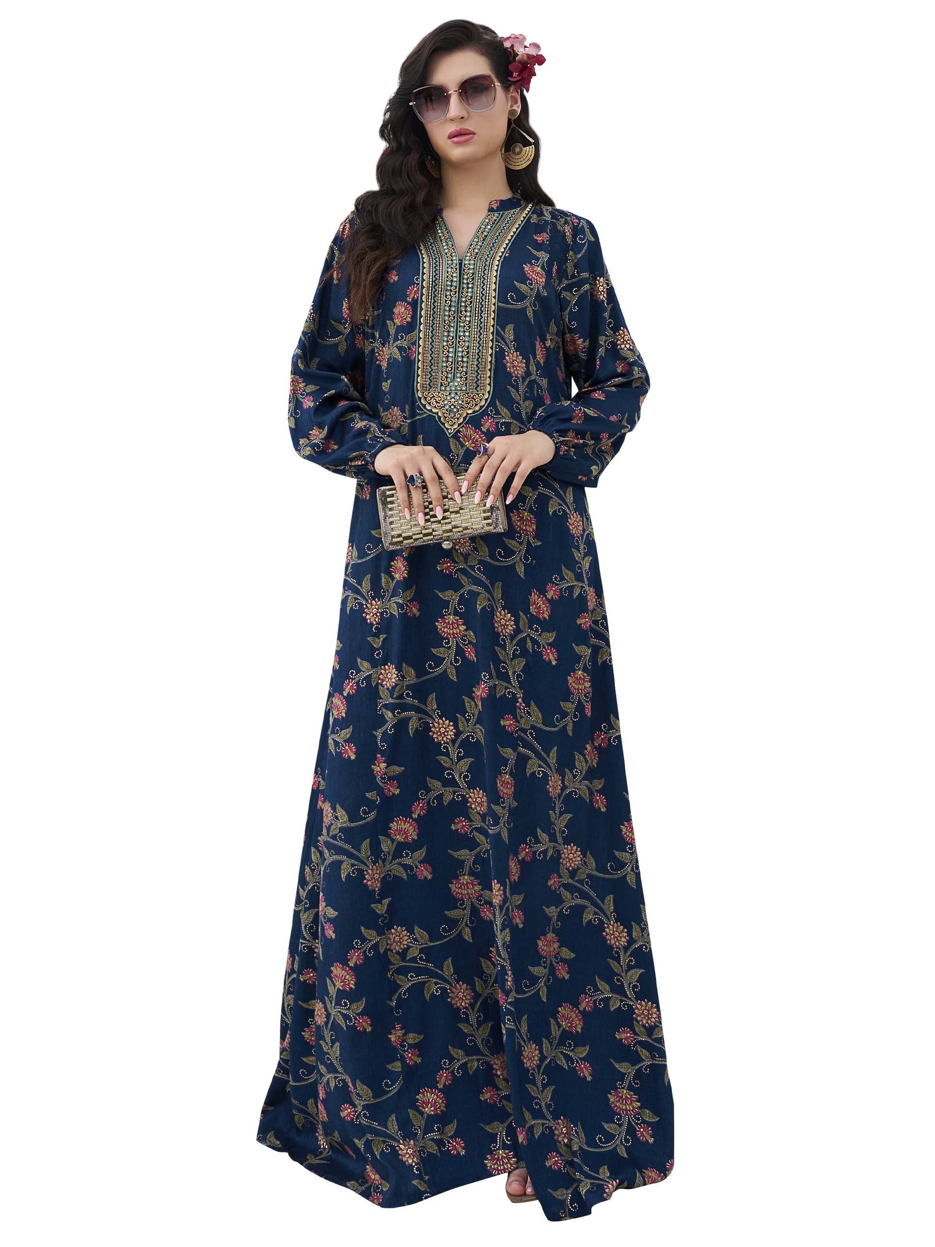 Blue suits you! Steal the spotlight with this long sleeve distinctive pink floral printed jalabiya, designed with a tree leaf pattern and a stunning embroidery on the chest that comes in gold and blue colors.