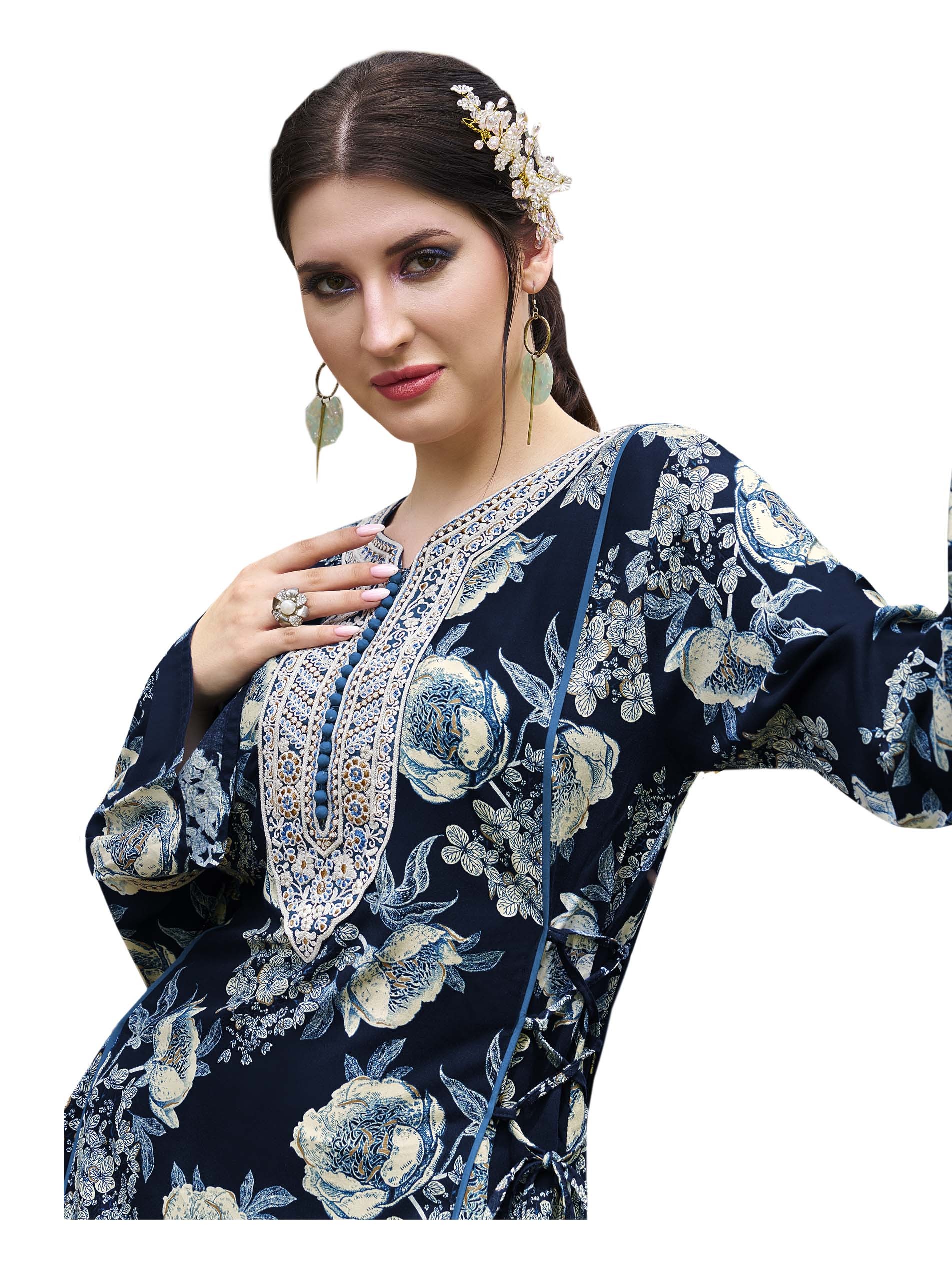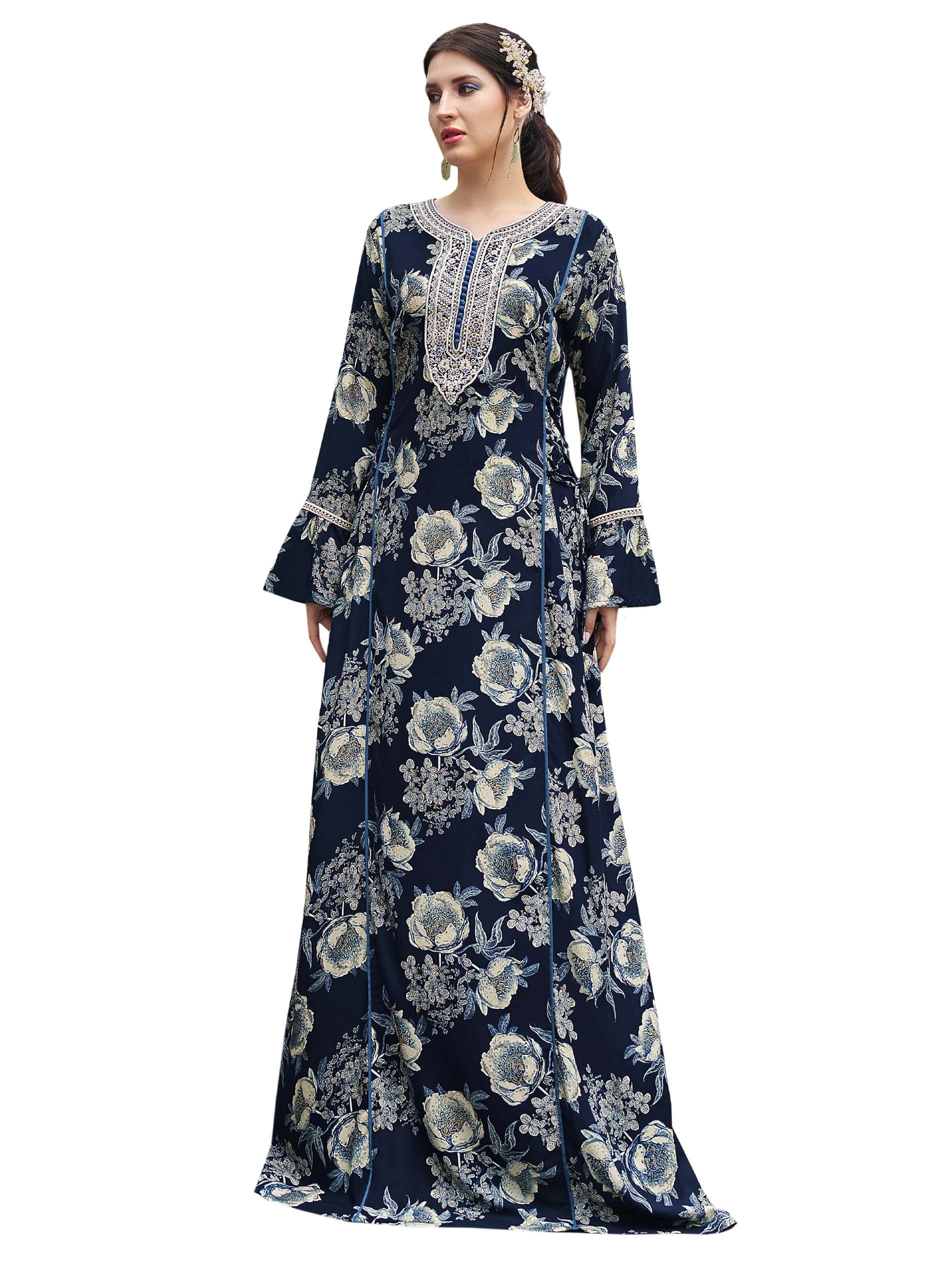Blue floral printed cotton jalabiya, designed with long sleeves and embroidery on the chest.