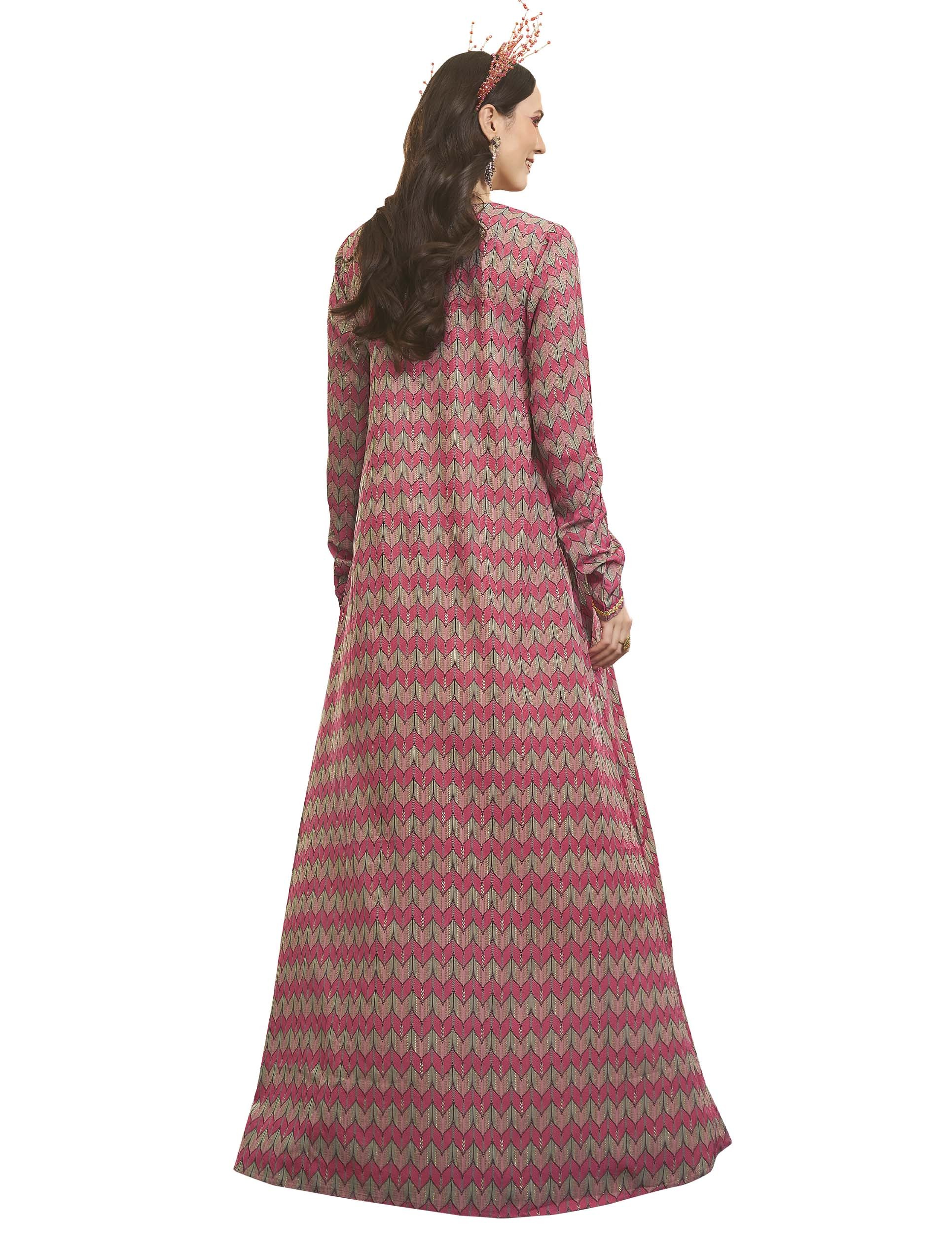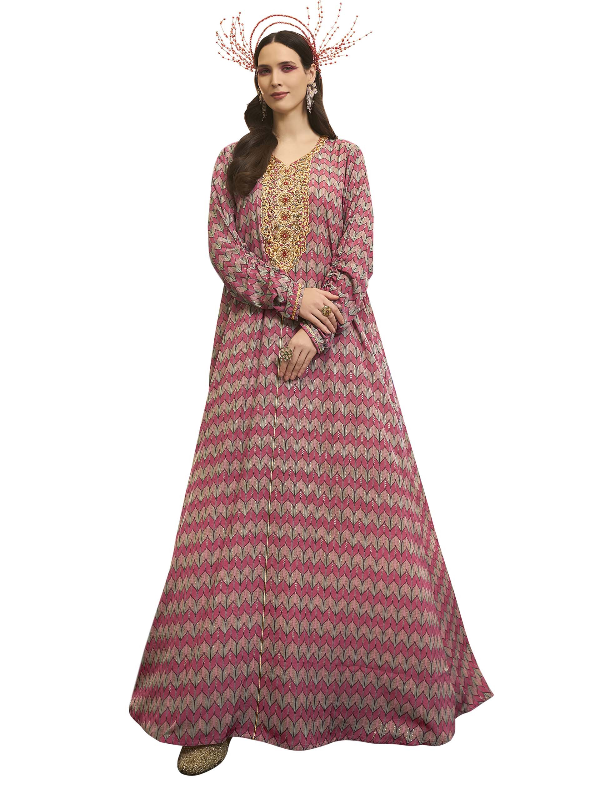 Long sleeve cotton jalabiya that comes with light and dark pink embroidery, complemented with luxurious gold artwork on the chest and sleeves.