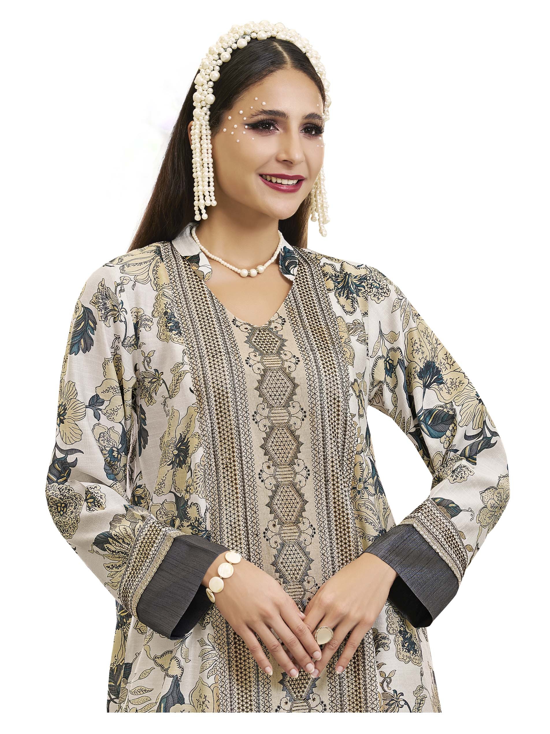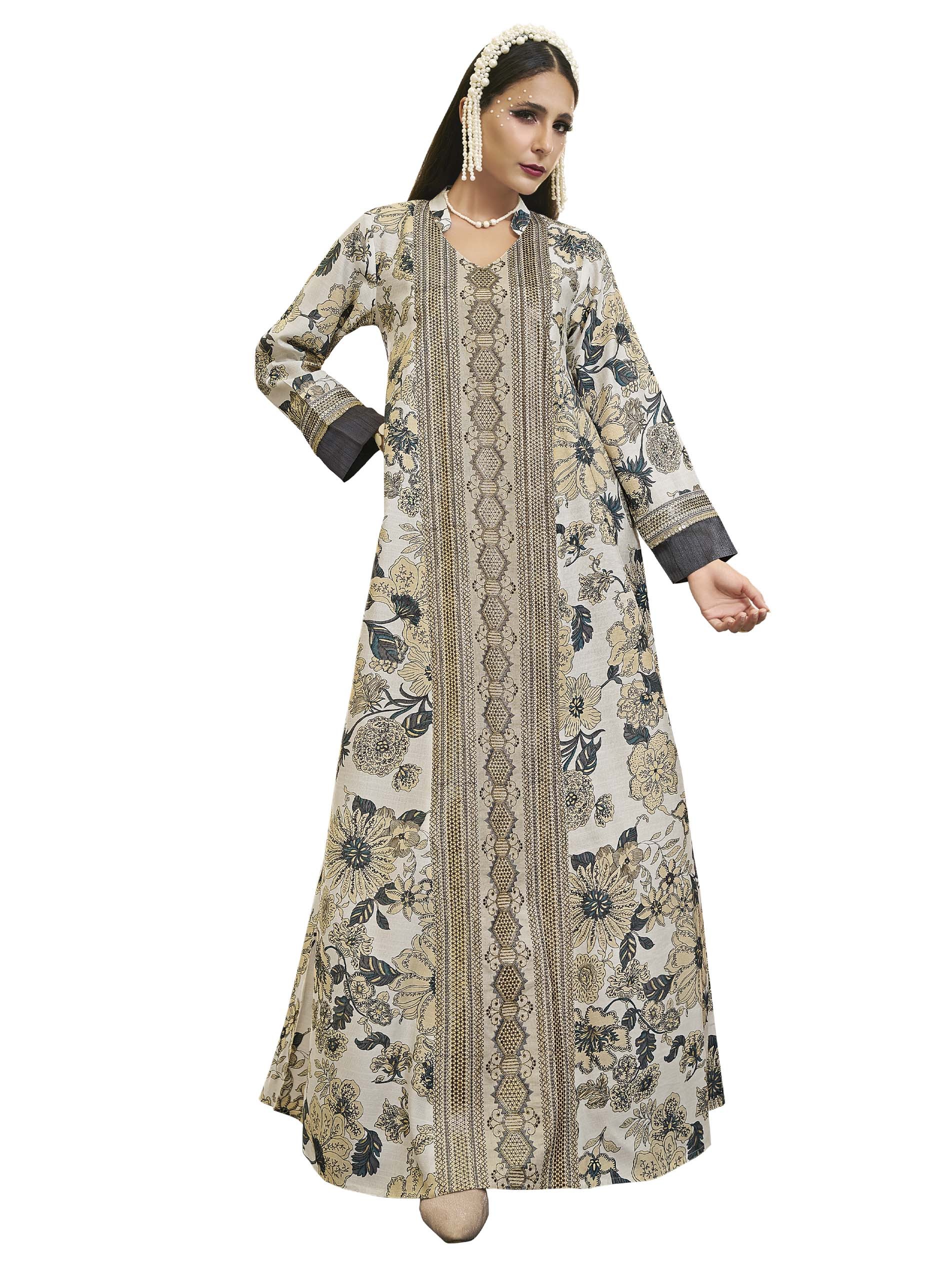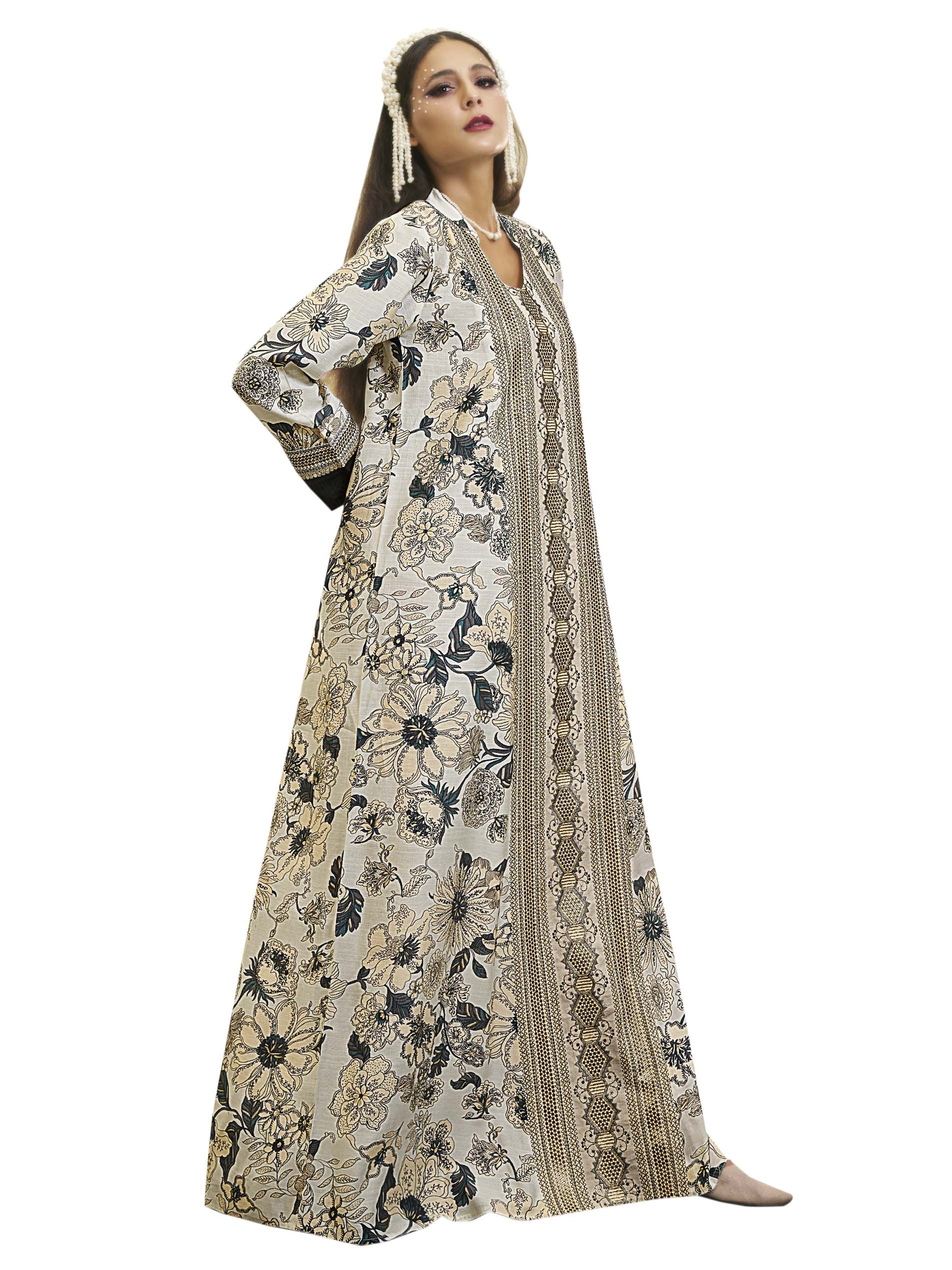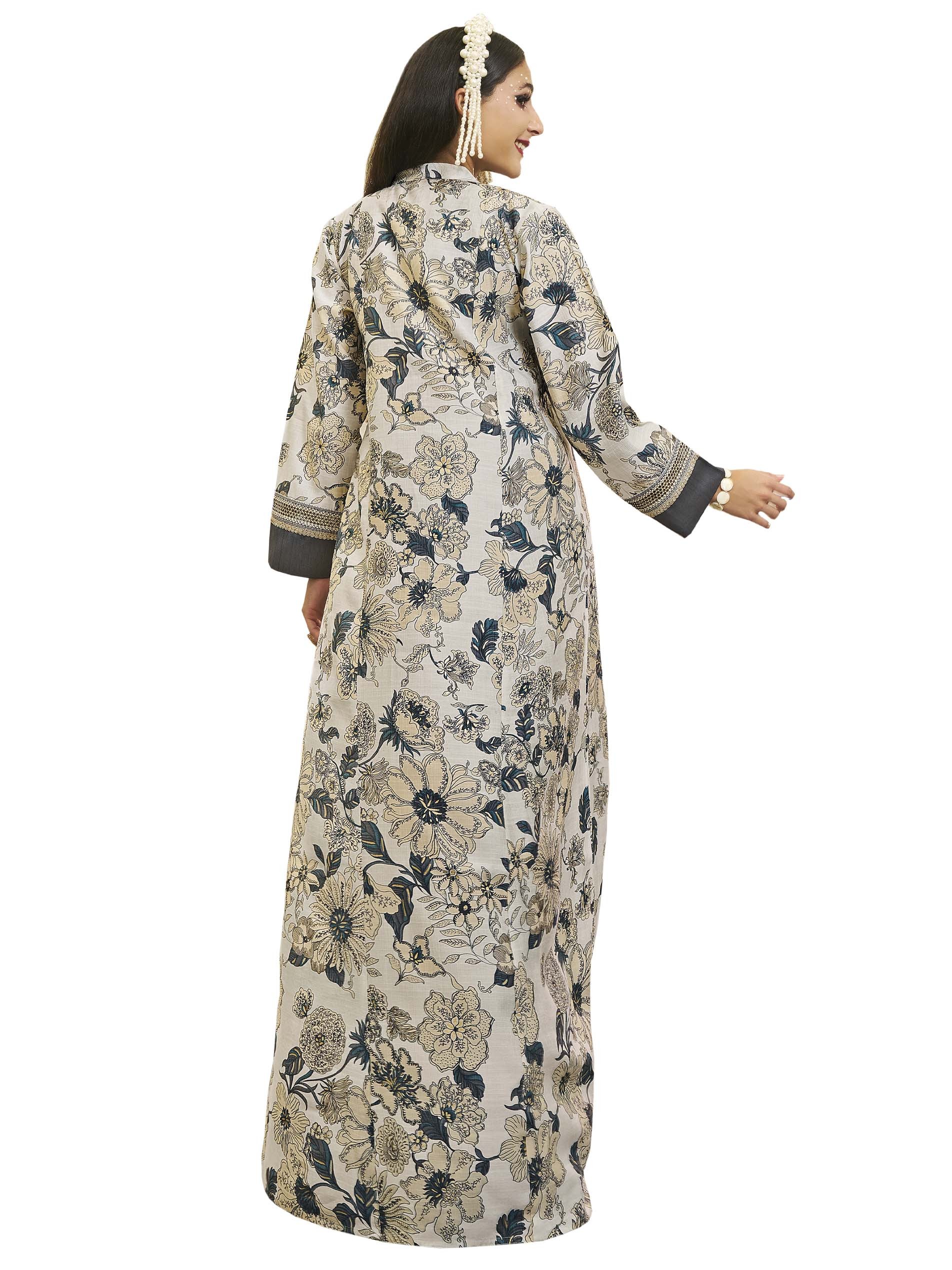 Our richly embroidered long sleeve gray cotton jalabiya is designed with floral pattern on both sides to give you a feeling of luxury and comfort.