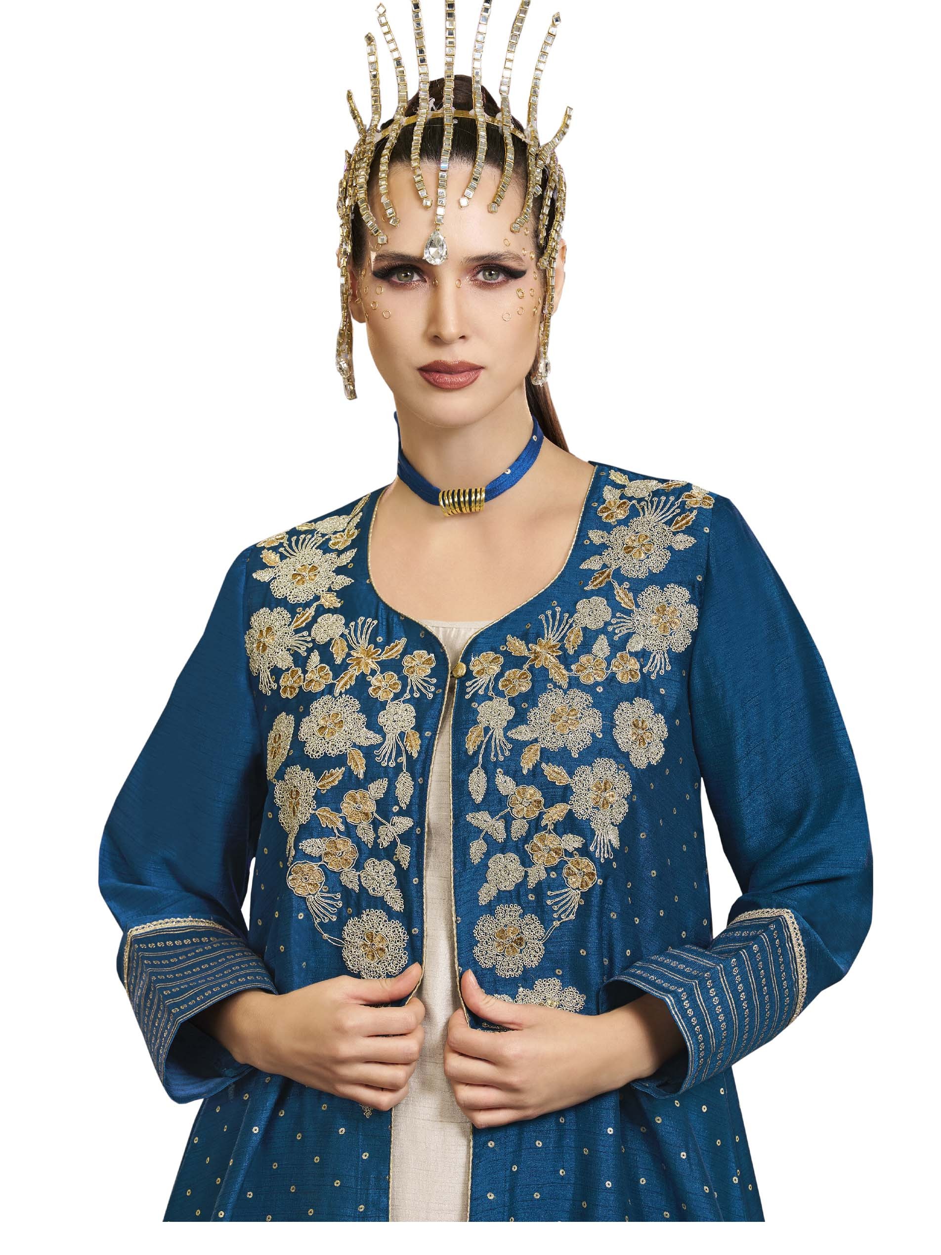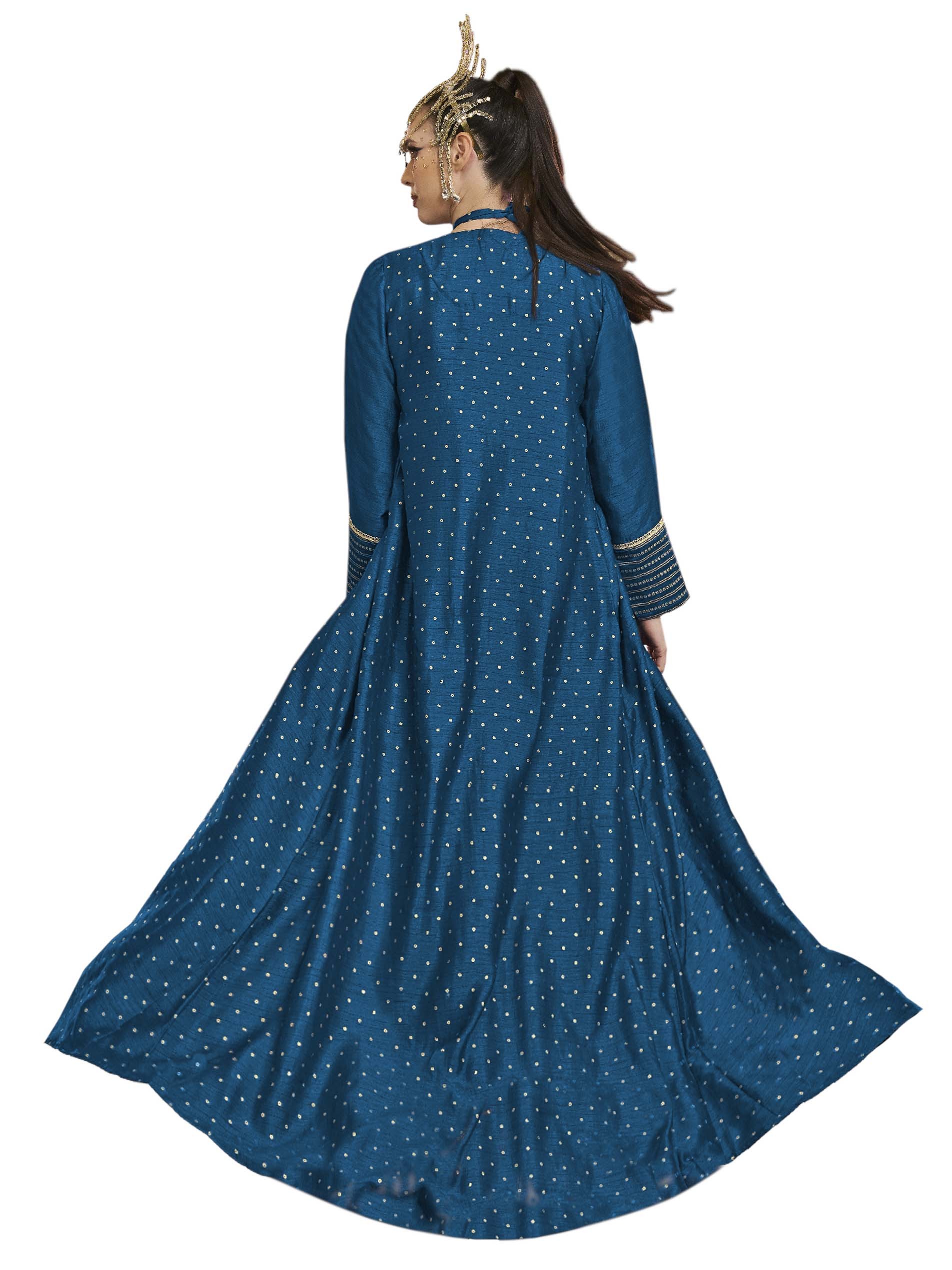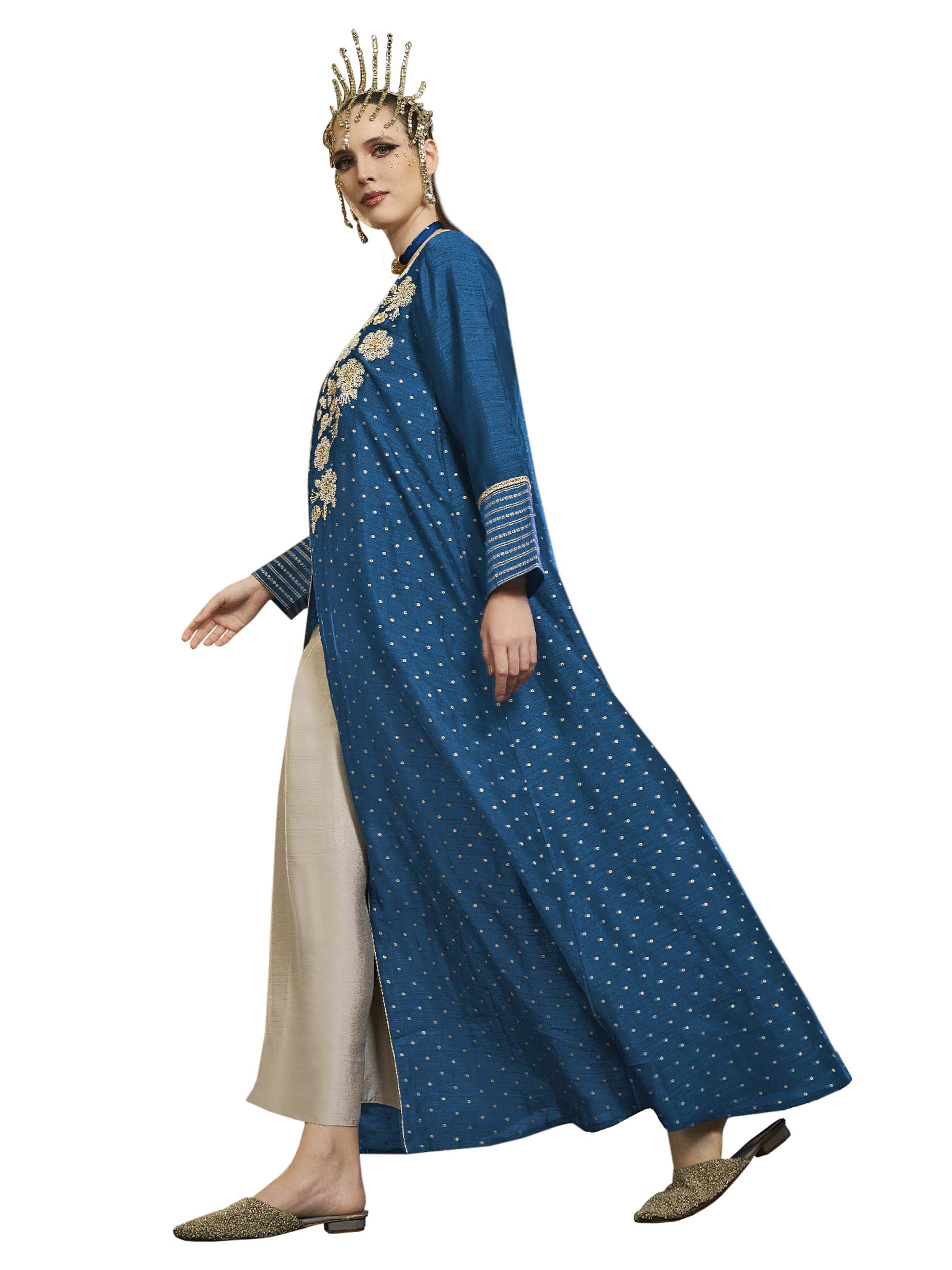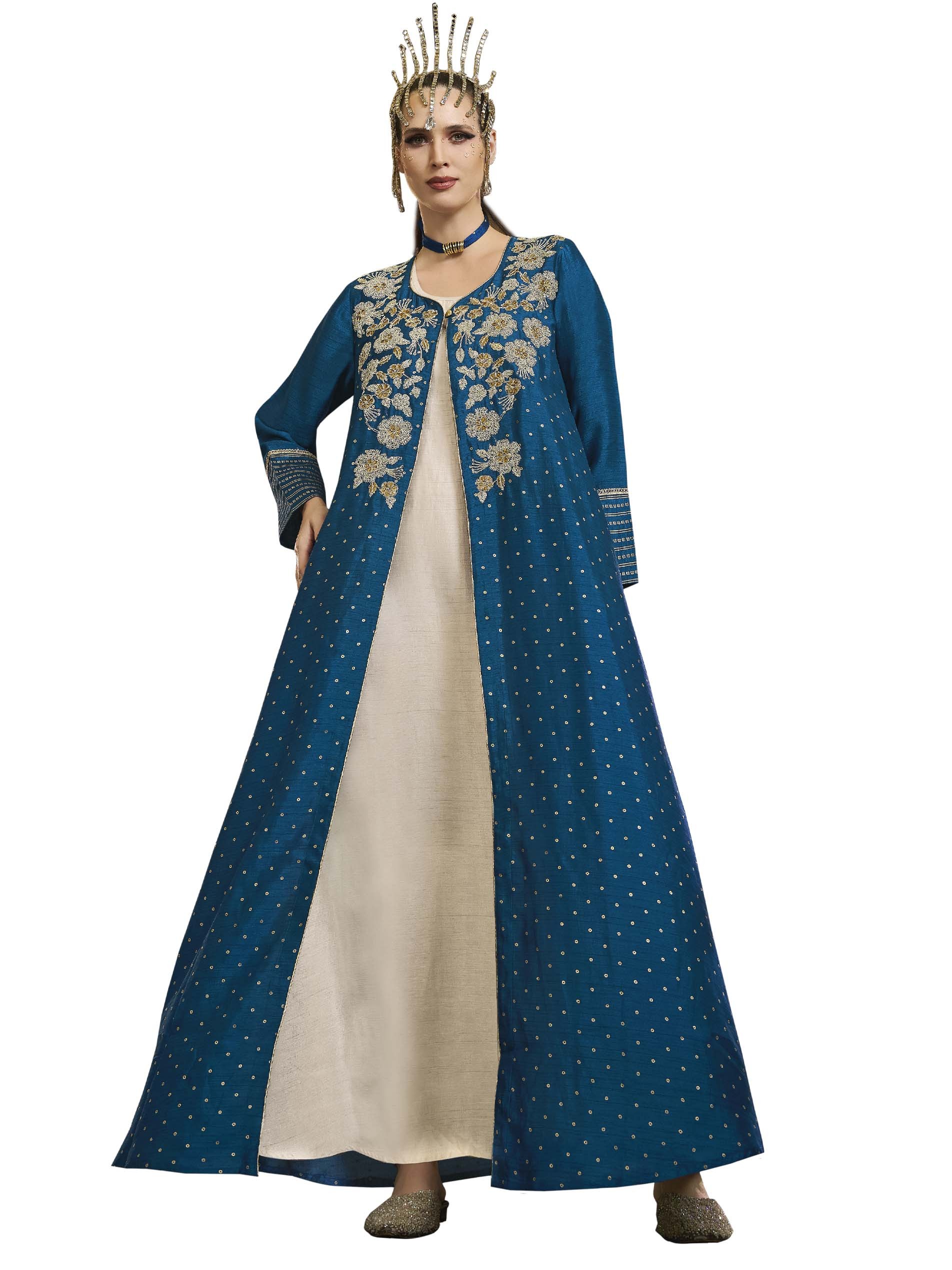 Long sleeve blue cotton jalabiya, designed with a white circular pattern and delicate chest floral embroidery.