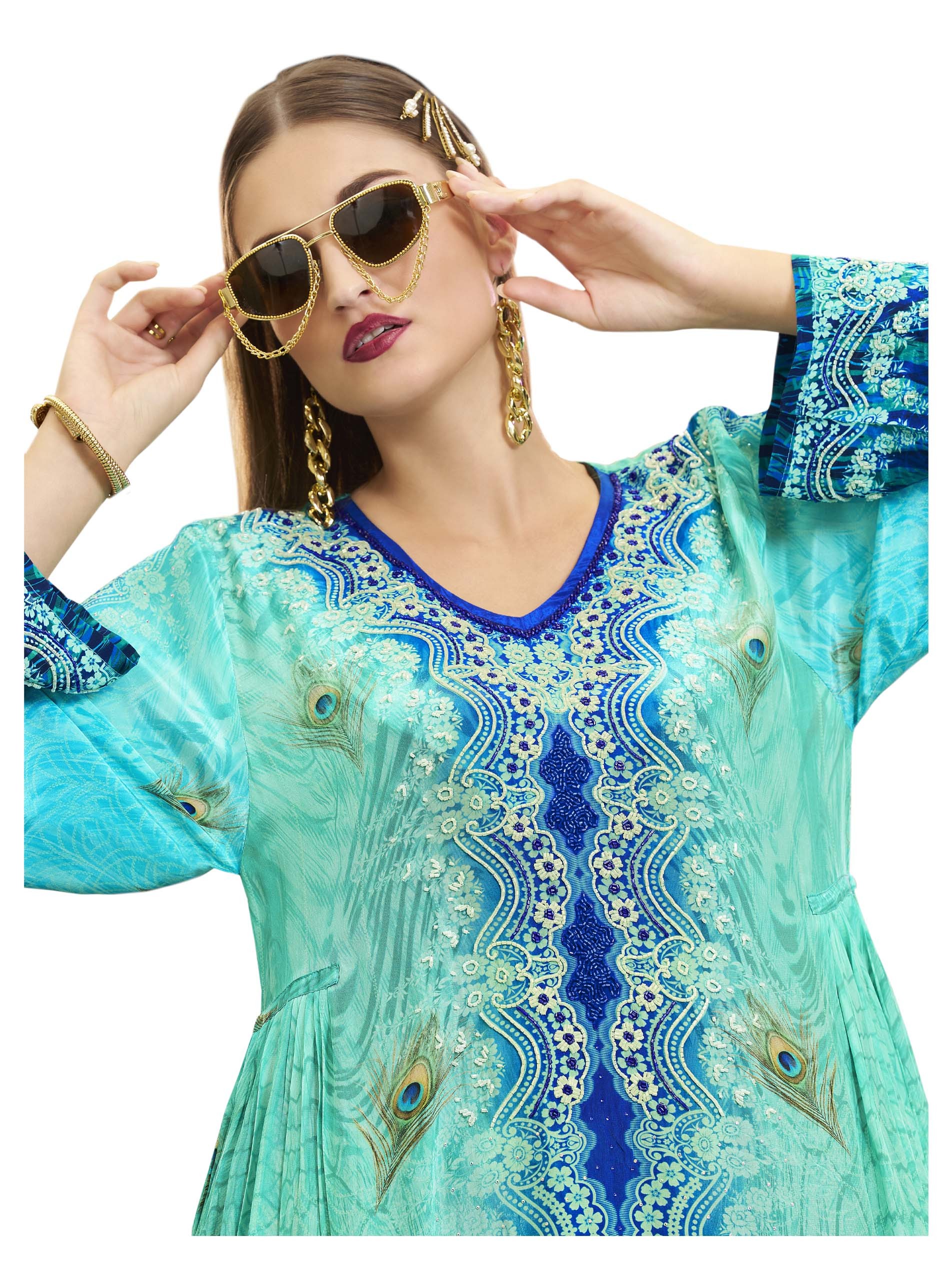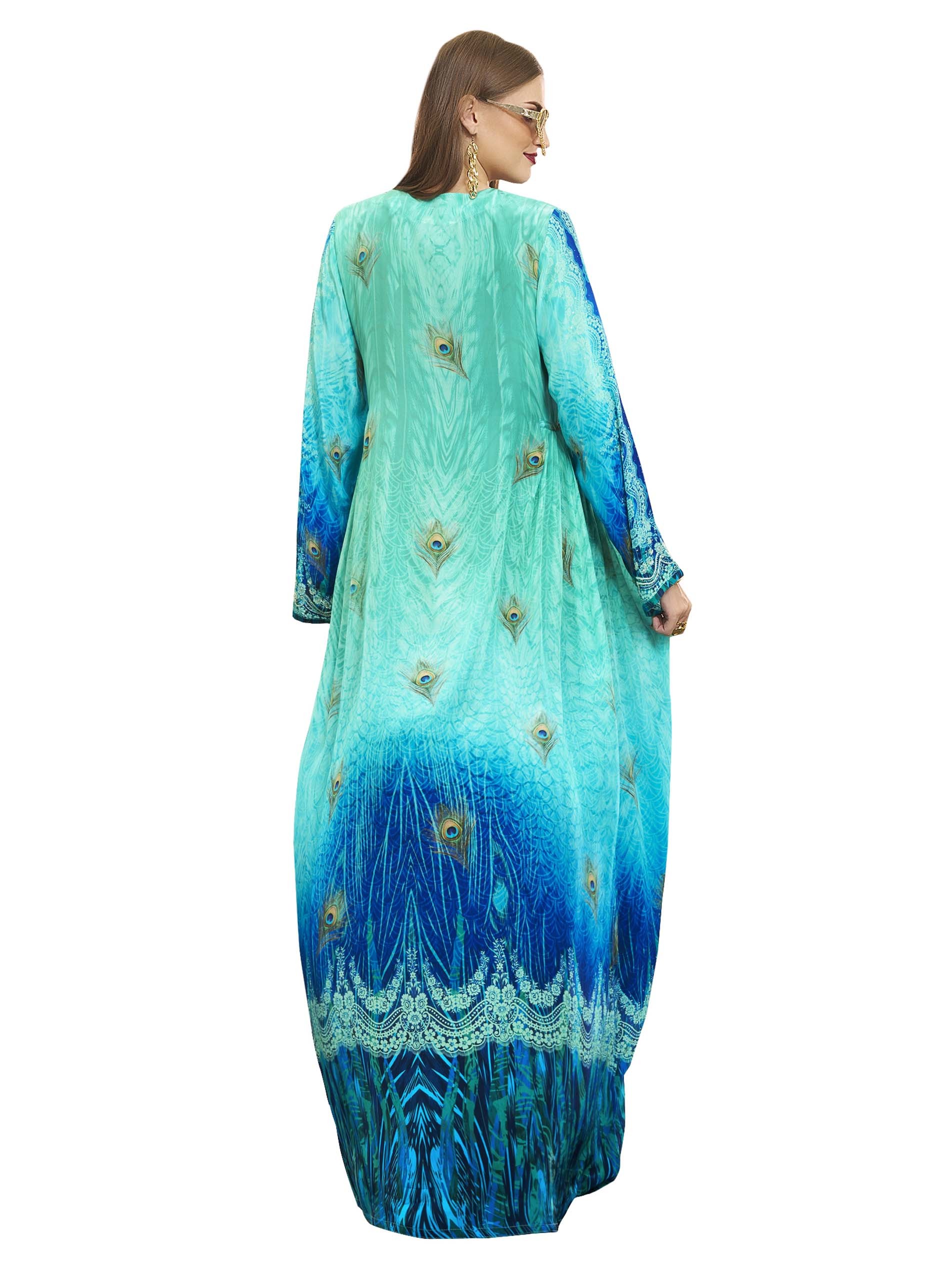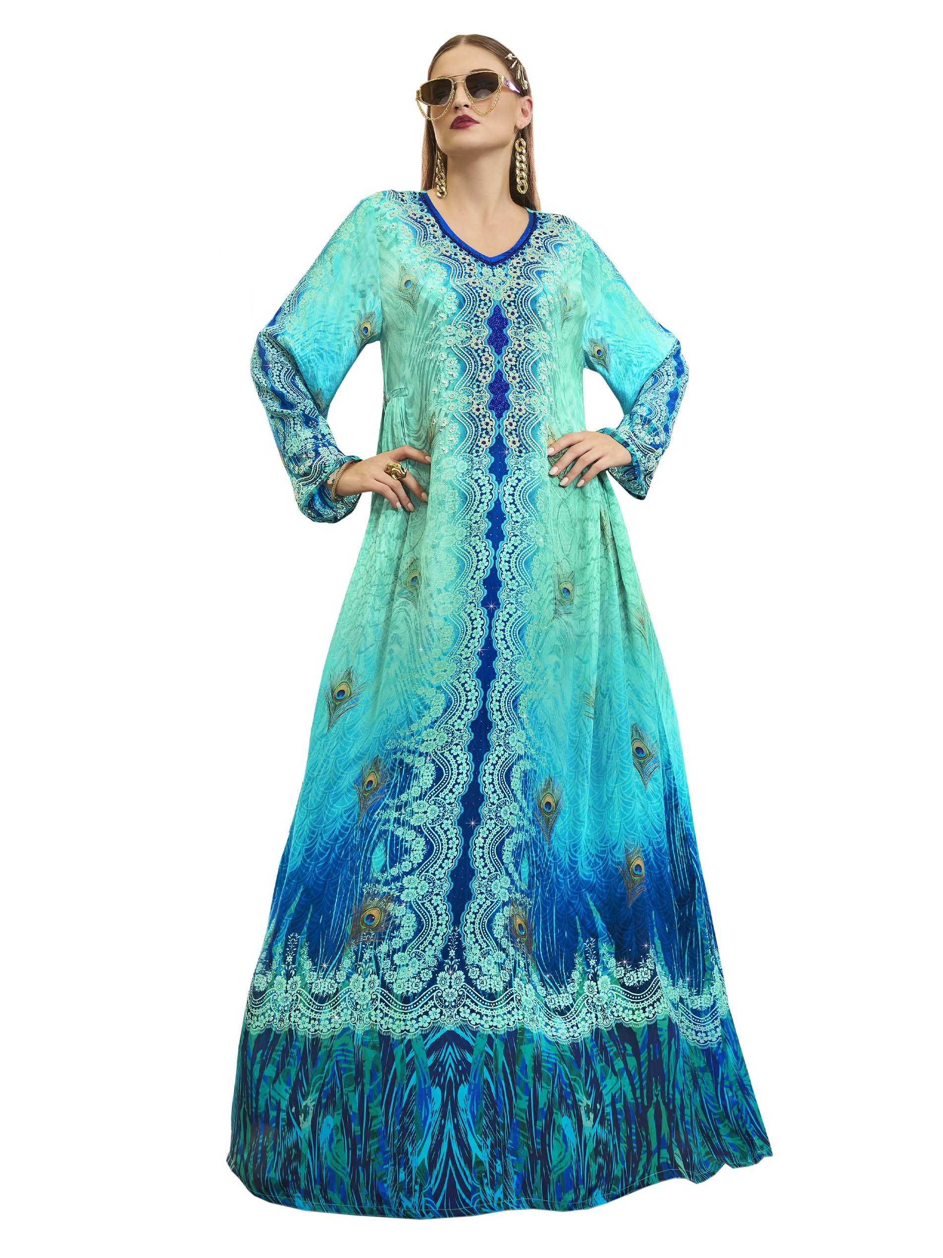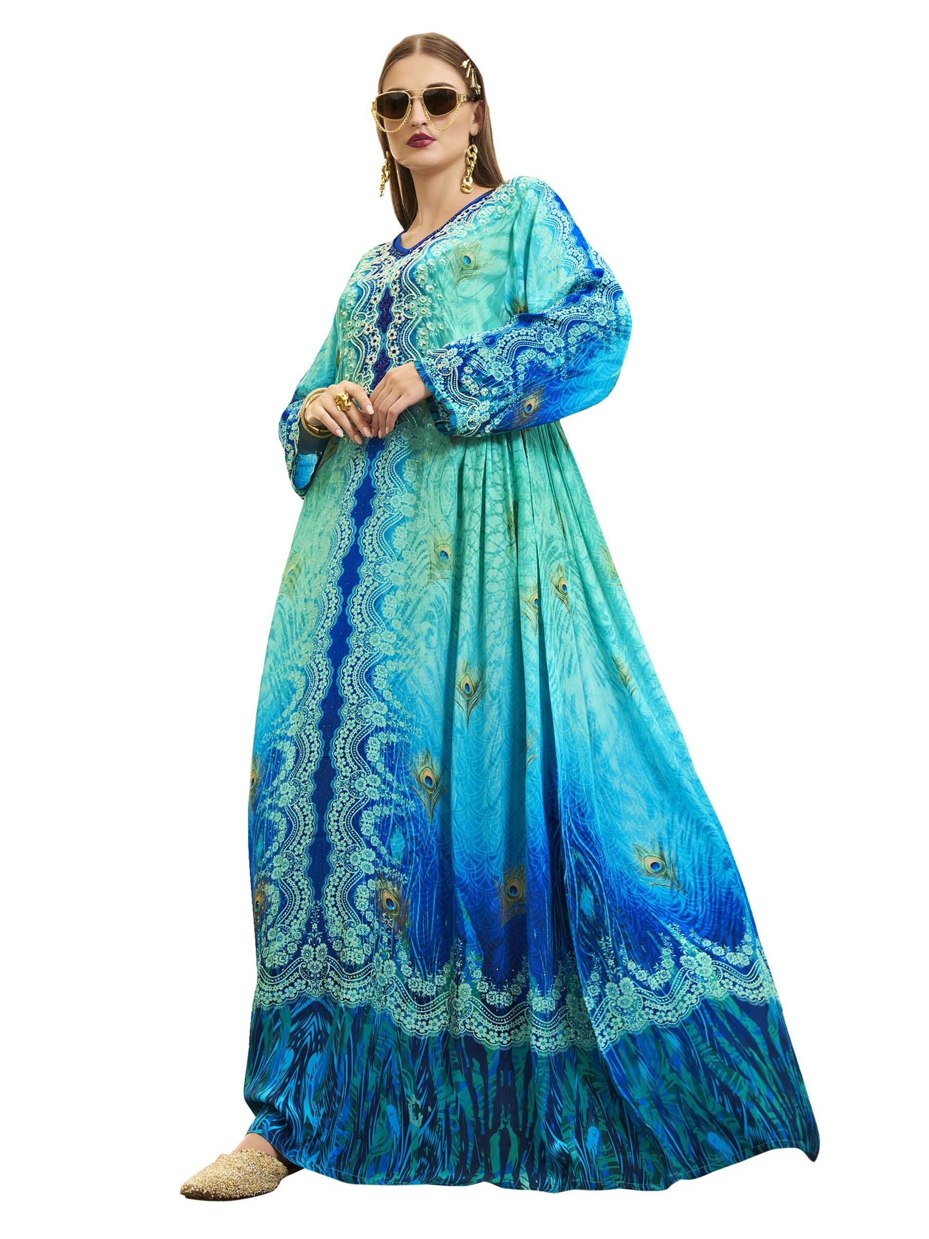 If you are a blue colour lover, this long sleeve cotton jalabiya is the perfect choice for you, designed with distinctive prints in shades of light and dark blue, complemented with white floral pattern.