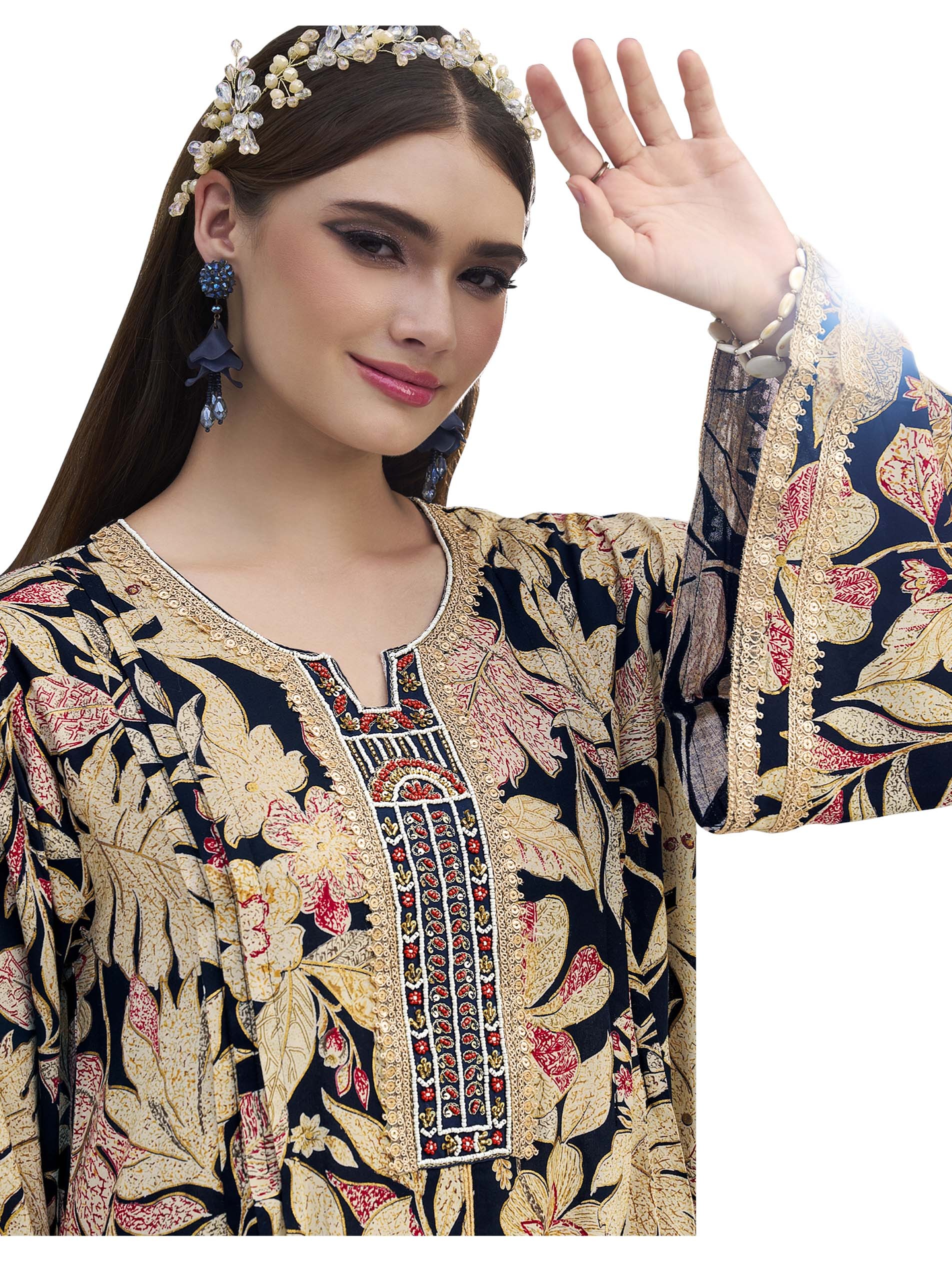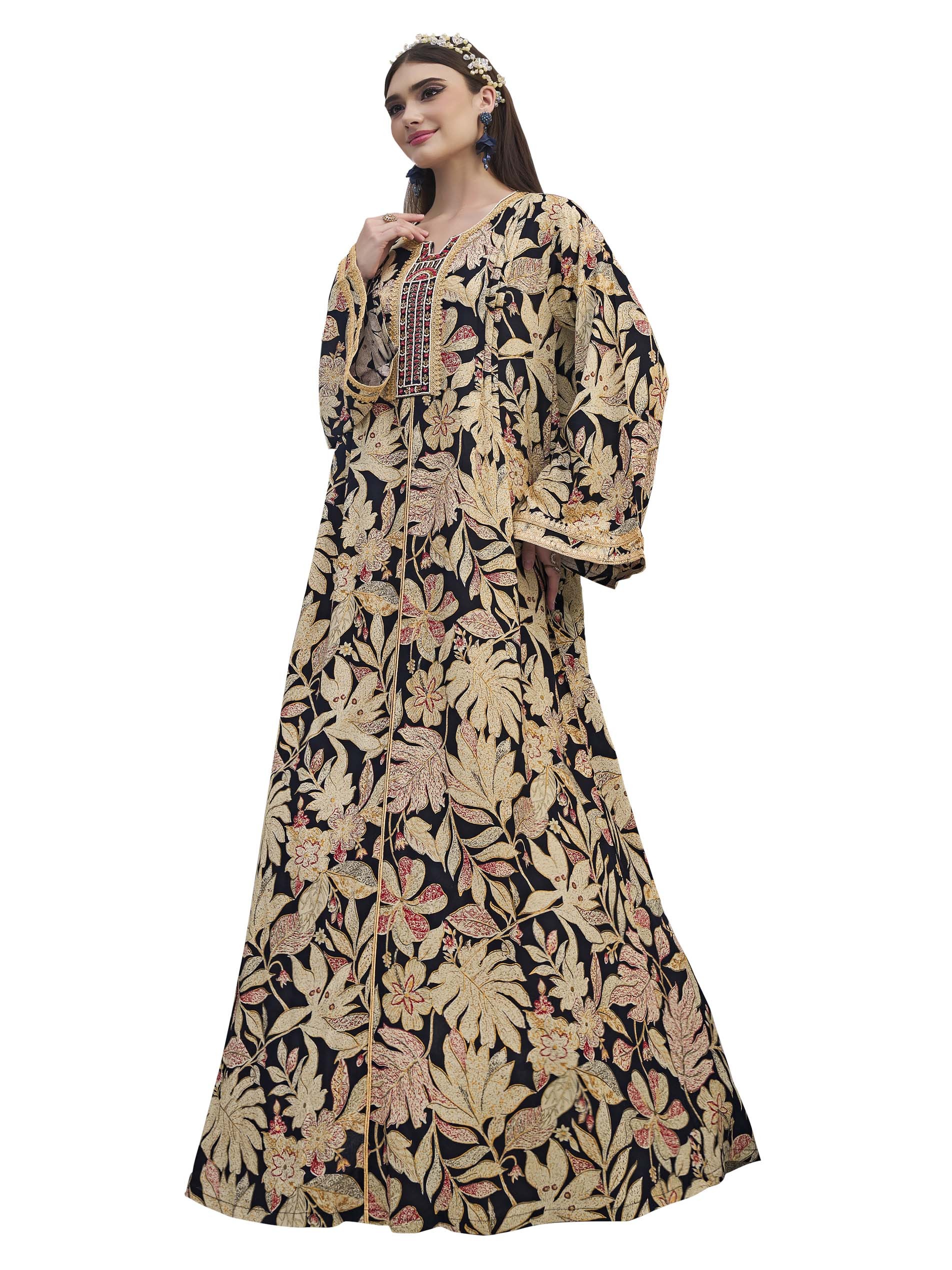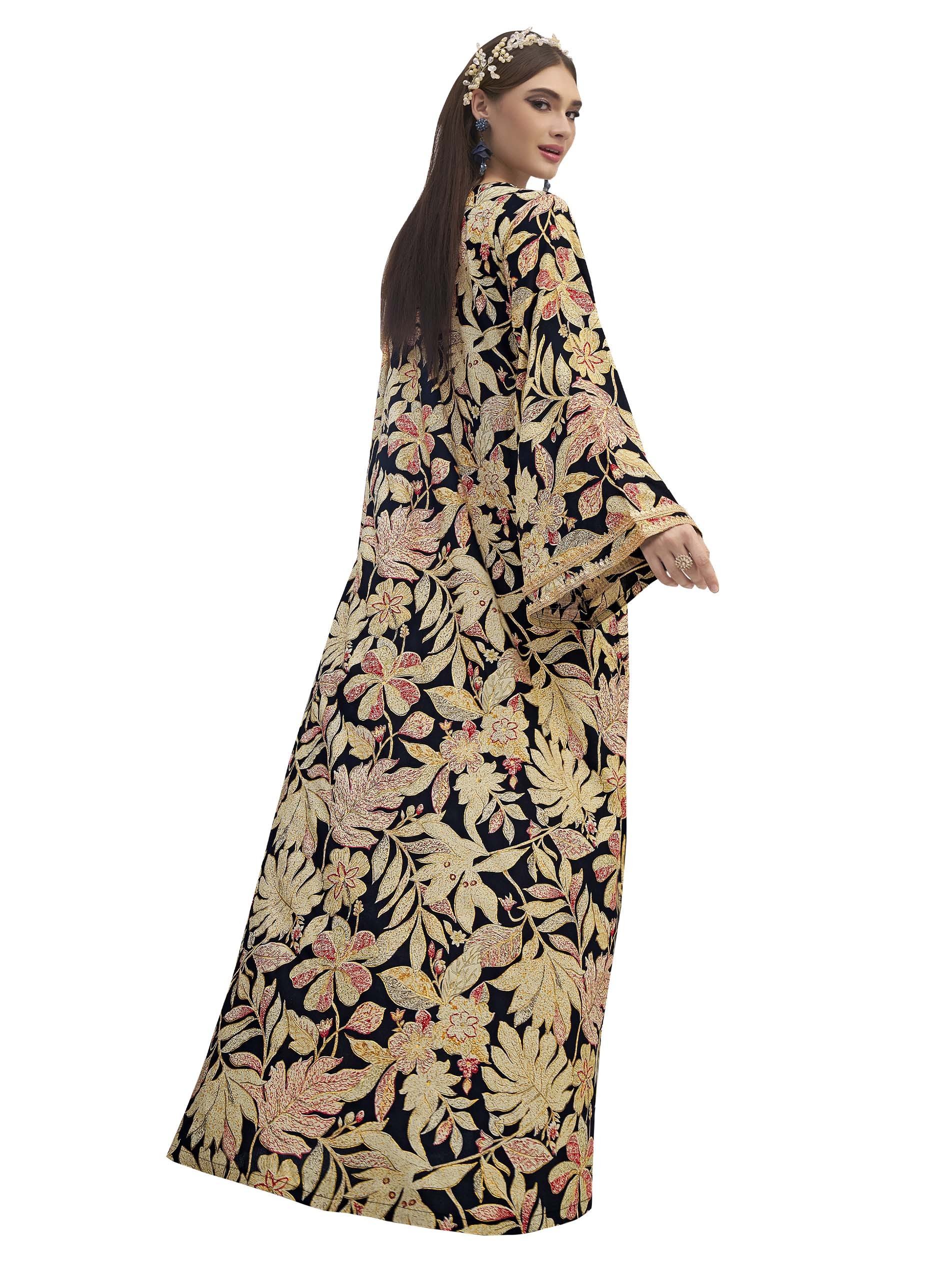 Our gorgeous long sleeve black cotton jalabiya features golden floral design and chest embroidery.