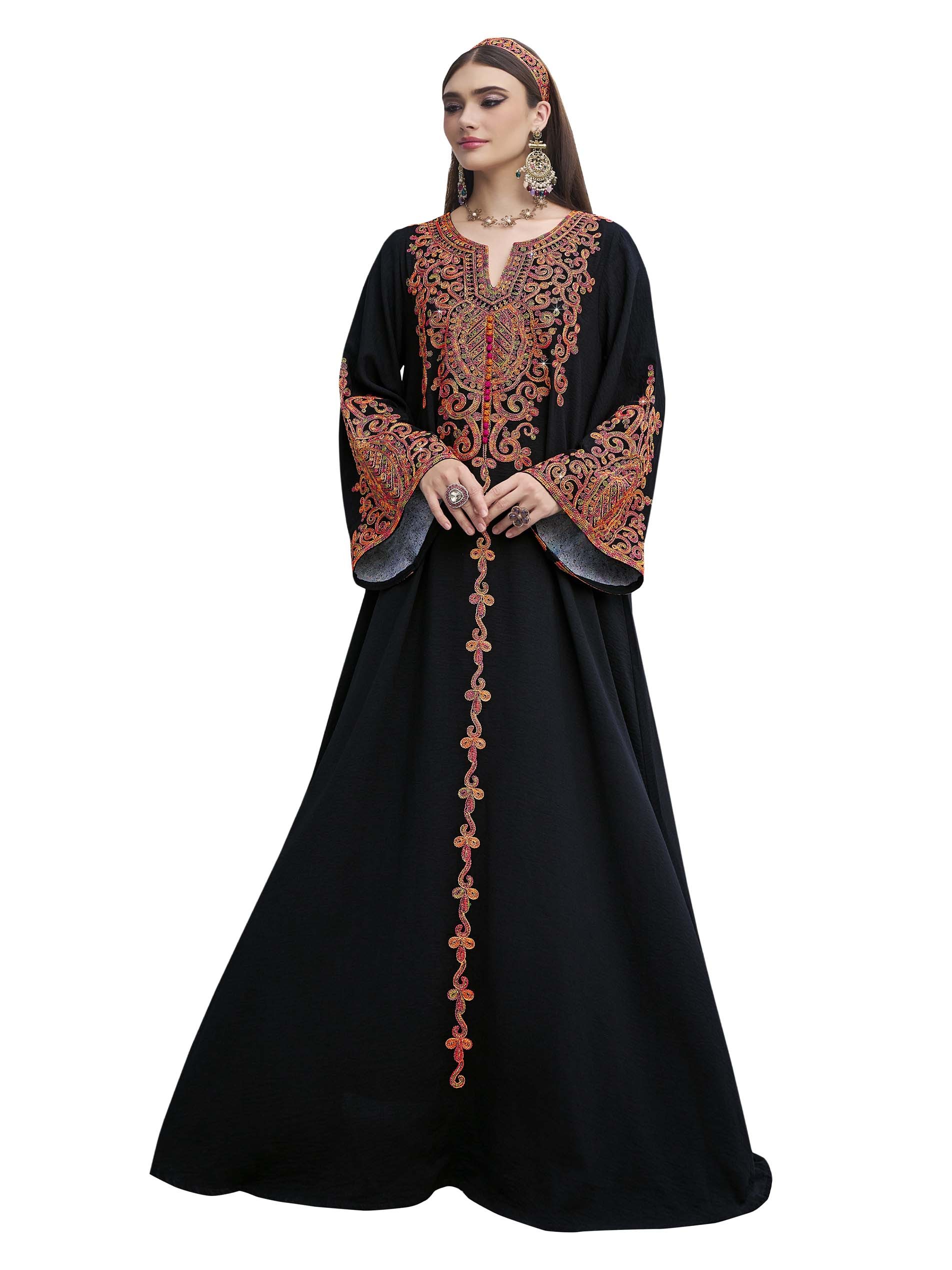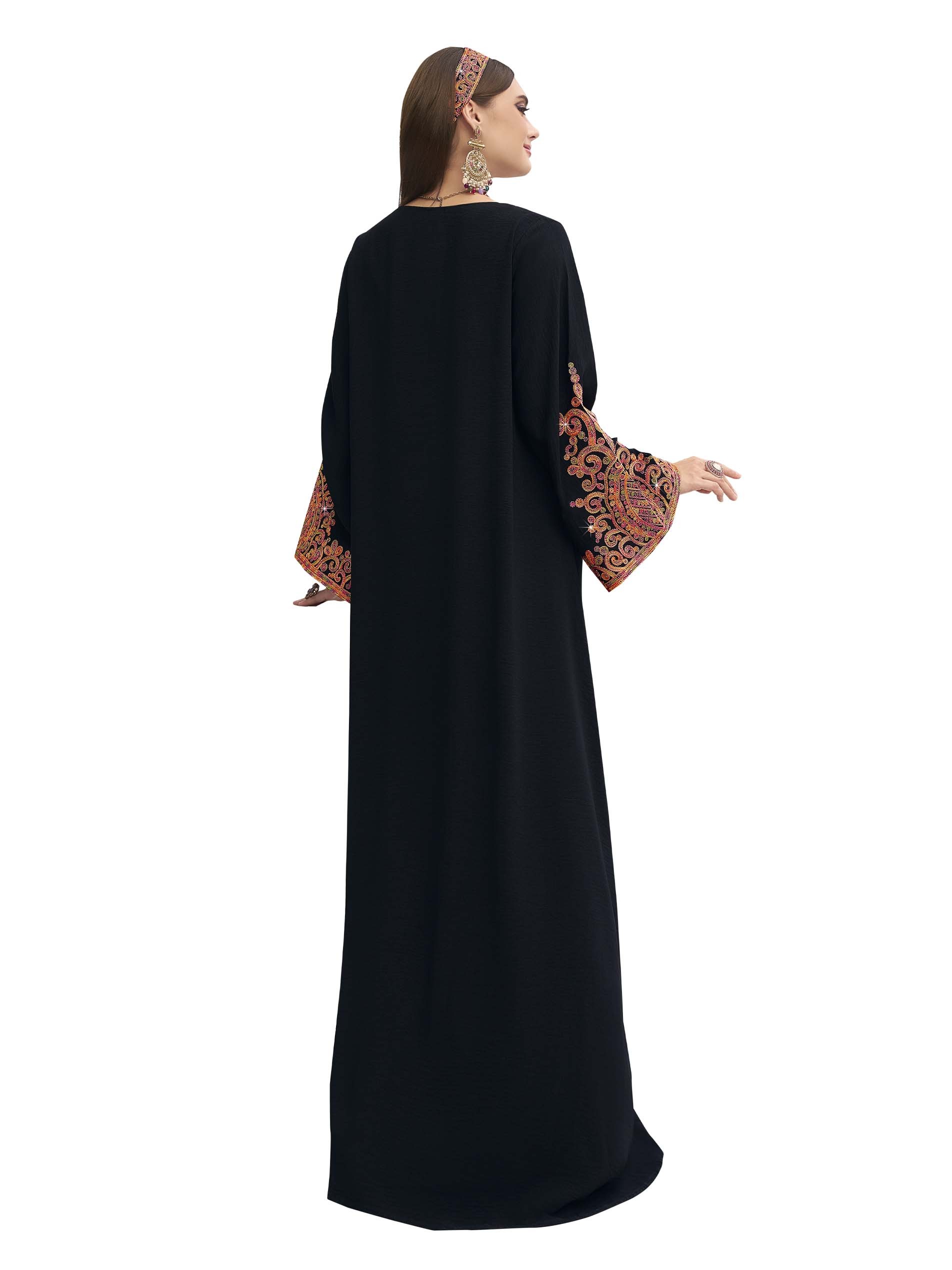 Shine in this black cotton jalabiya, adorned with colorful sleeve and chest embroidery for a distinctive Ramadan look.