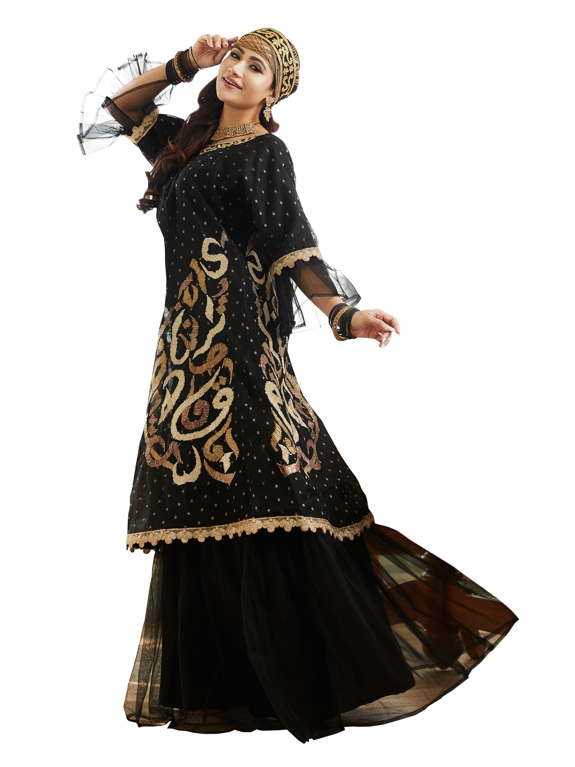 A light and breezy dantel fabric enhanced in net is shaped into a flawless jalabiya for this season. Fashioned in black to cast a mystical spell the full length jalabiya is tailored to fascination with a round neck, 3/4th sleeves, accentuated in a multiple works print. An A-line cut and double cross hemline make it enticing.