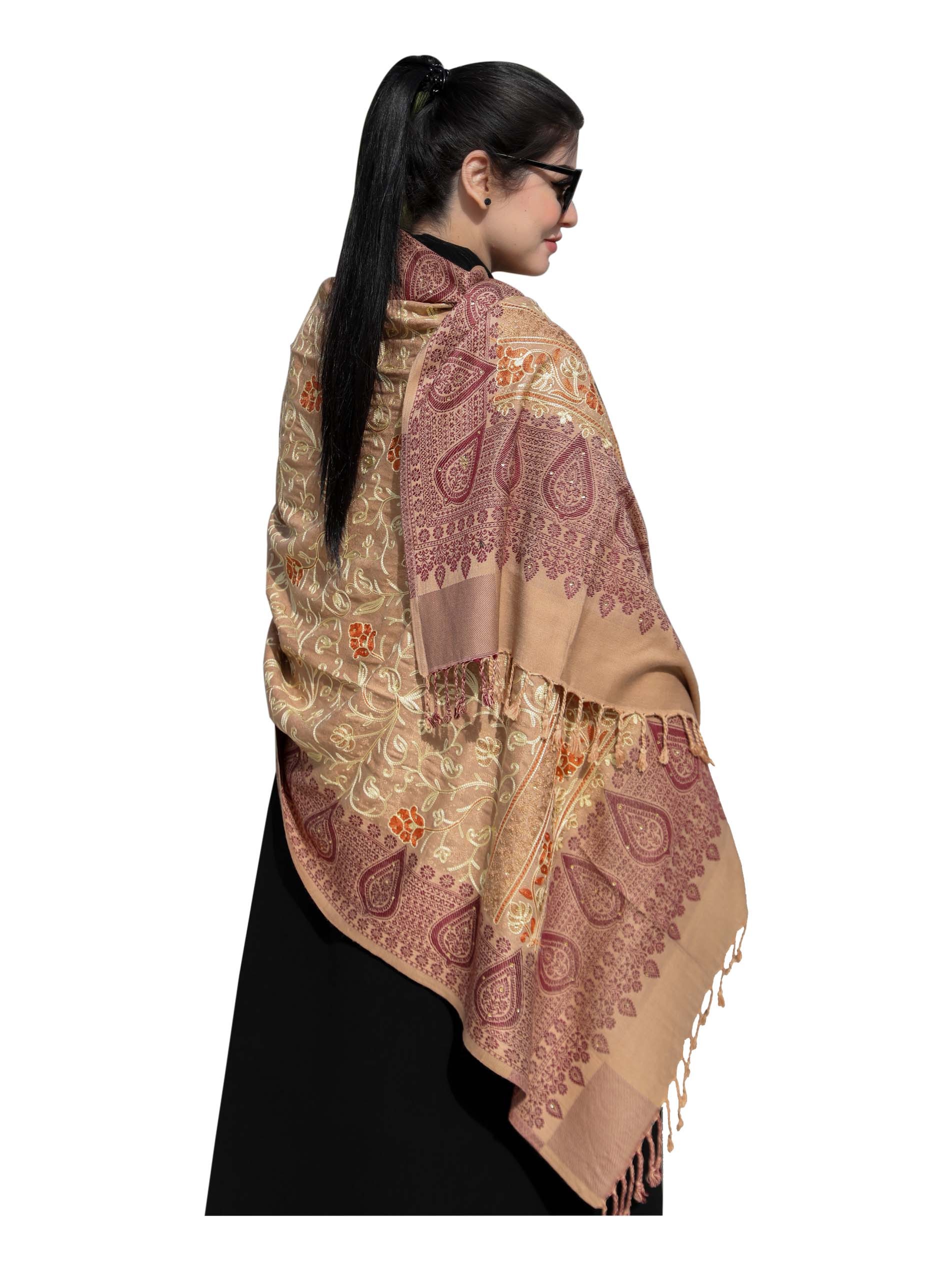 شال شتوي كشميري باللون البرتقالي مصمم بنقوشات متنوعة أنيقة. ويكتمل التصميم بتطريز باللون الذهبي ليضفي لمسة مميزة.