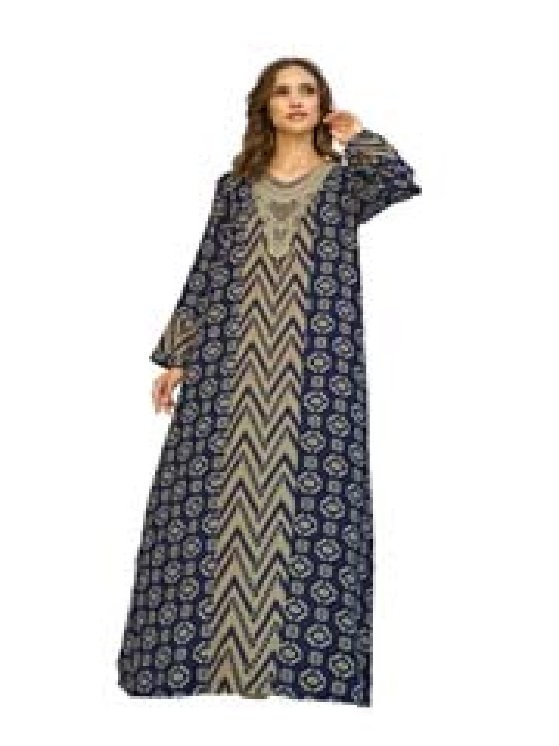 تتميز هذه الجلابية بقَصّة مُتَوَسِّعة، المصنوعة من القطن الناعم والقابل للتنفس، بأنها مثالية للخروجات الصيفية غير الرسمية. يتميز تصميمها بطباعة إيكات التي تحتوي على مزيج لافت من درجات اللون الأزرق والبيج مع الأنماط الهندسية وخطوط الشيفرون، بينما يضيف عمل التطريز بالدواري لمسة رقيقة من الأناقة.