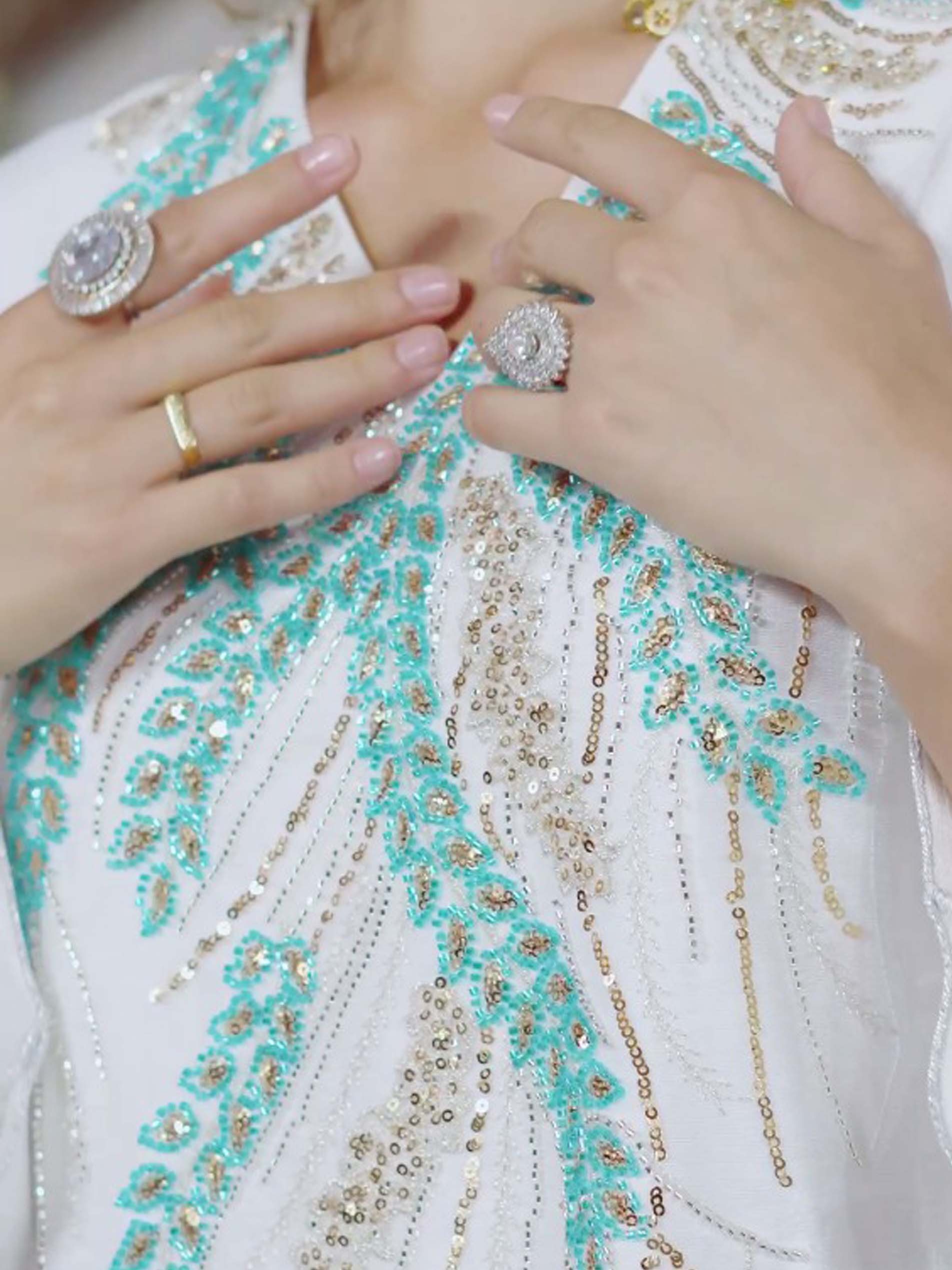هذه الجلابية الأنيقة بقصّة متوسعة، المصنوعة من الكتان القابل للتنفس، تتميز باللون الفيروزي والذهبي مع تطريزات دقيقة من الخرز والخرز اللامع. القاعدة البيضاء الناعمة تعزز التصميم الجميل، مما يجعلها مثالية لمناسبات رمضان. مريحةوأنيقة، توفر مزيجاً مثالياً من الرقي والعملية لموسم الصيف.