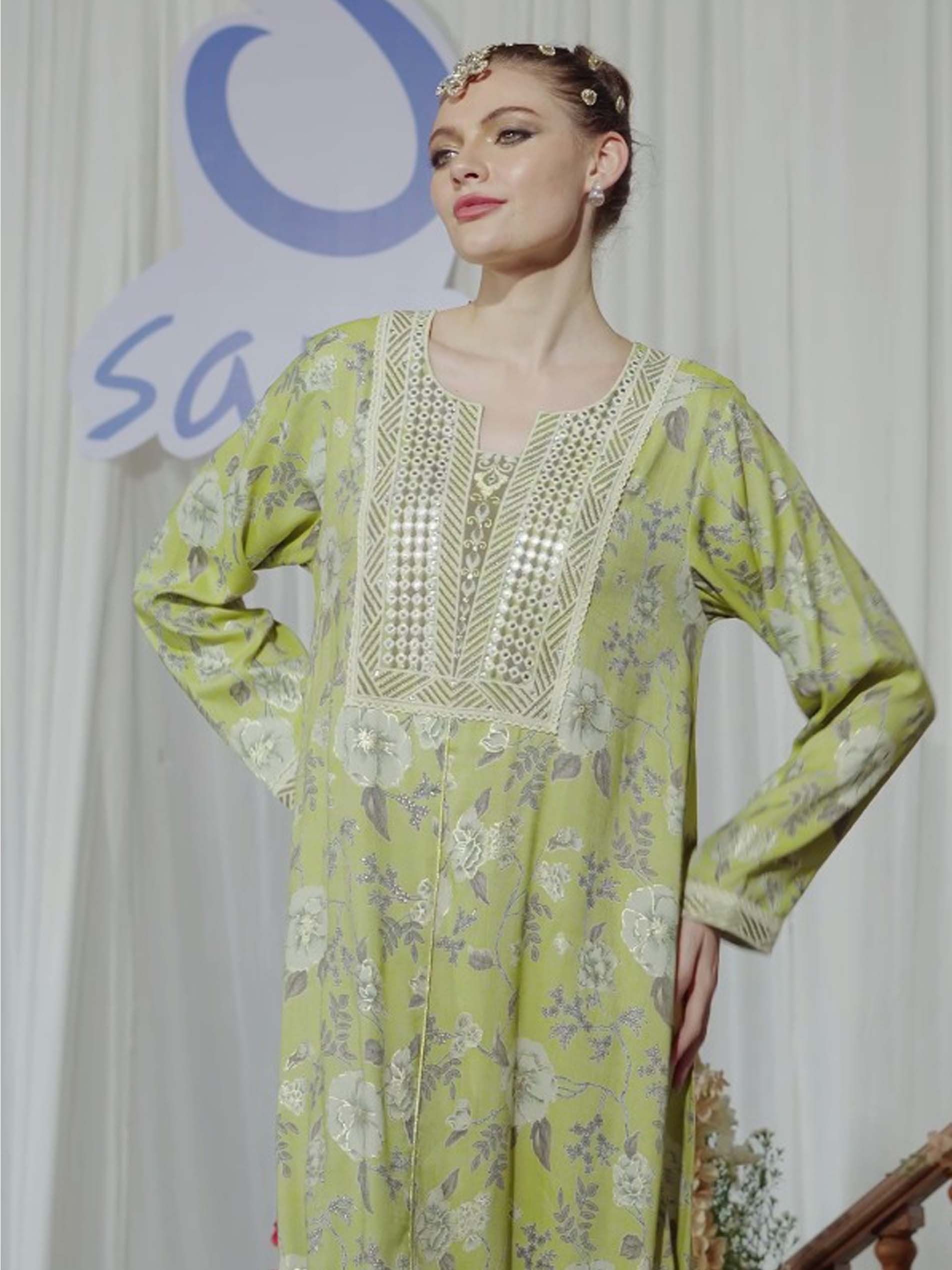 تتميز هذه الجلابية ذات القَصّة المُتَوَسِّعة، المصنوعة من القطن القابل للتنفس، بمزيج من الأناقة الكلاسيكية مع لمسة معاصرة، مما يجعلها مثالية للاحتفالات الرمضانية. يتم تعزيز اللون الأخضر الفاتح بطبعة زهور دقيقة وتطريز ذهبي، مما يخلق تصميمًا مستوحى من الطبيعة. يضمن تصميمها المنساب الراحة والأناقة خلال موسم الصيف الدافئ.