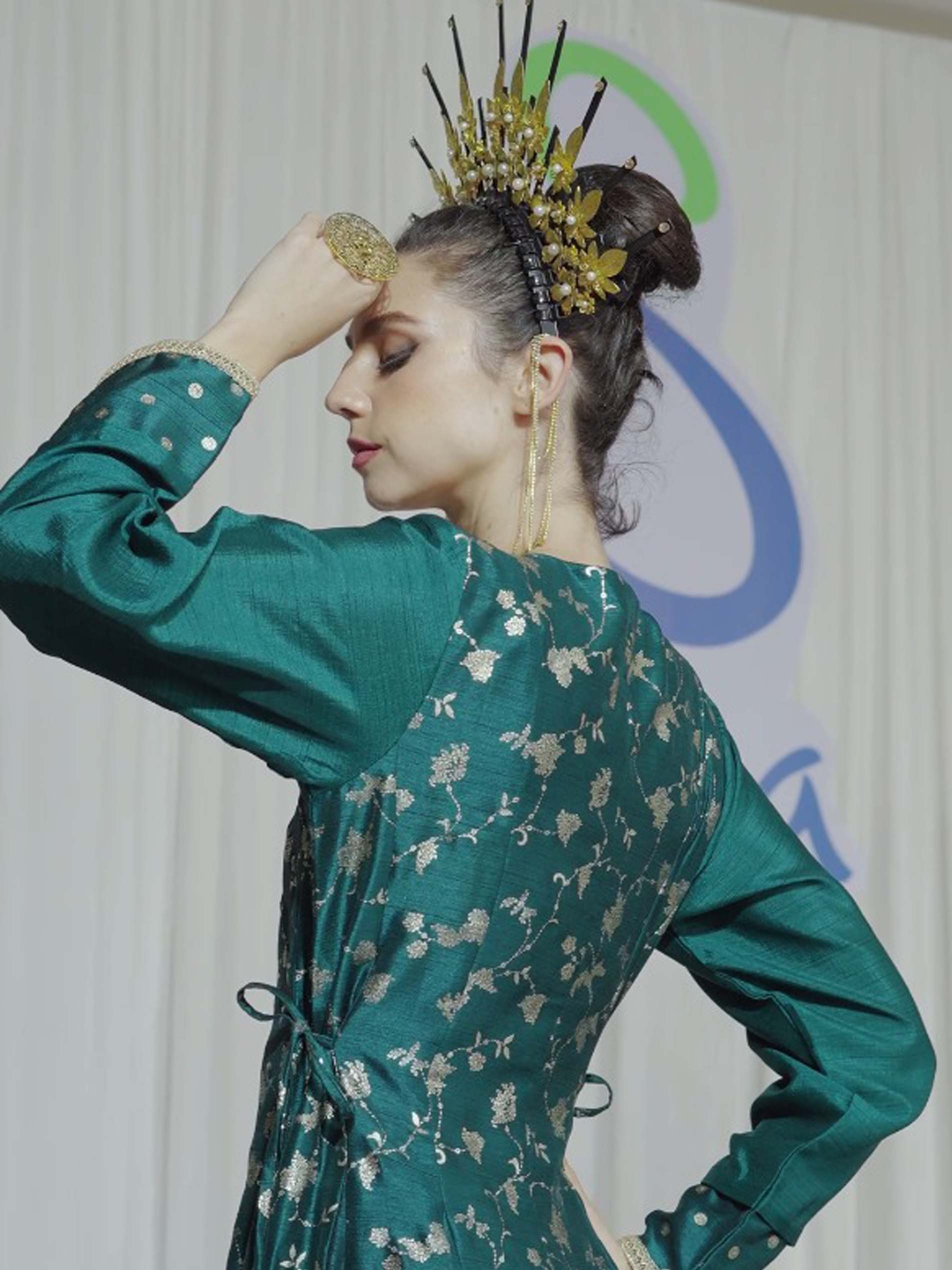 هذه الجلابية القطنية الأنيقة باللون الأخضر الزمردي الغني تتميز بقَصّة مُتَوَسِّعة تكمل القوام بأناقة. مزينة بتطريز زهور معقد ونقوش من النقاط الذهبية الدقيقة، تجمع بين التقليد والرقي. مثالية لاحتفالات رمضان، فهي توفر الأناقة والراحة لموسم الصيف.