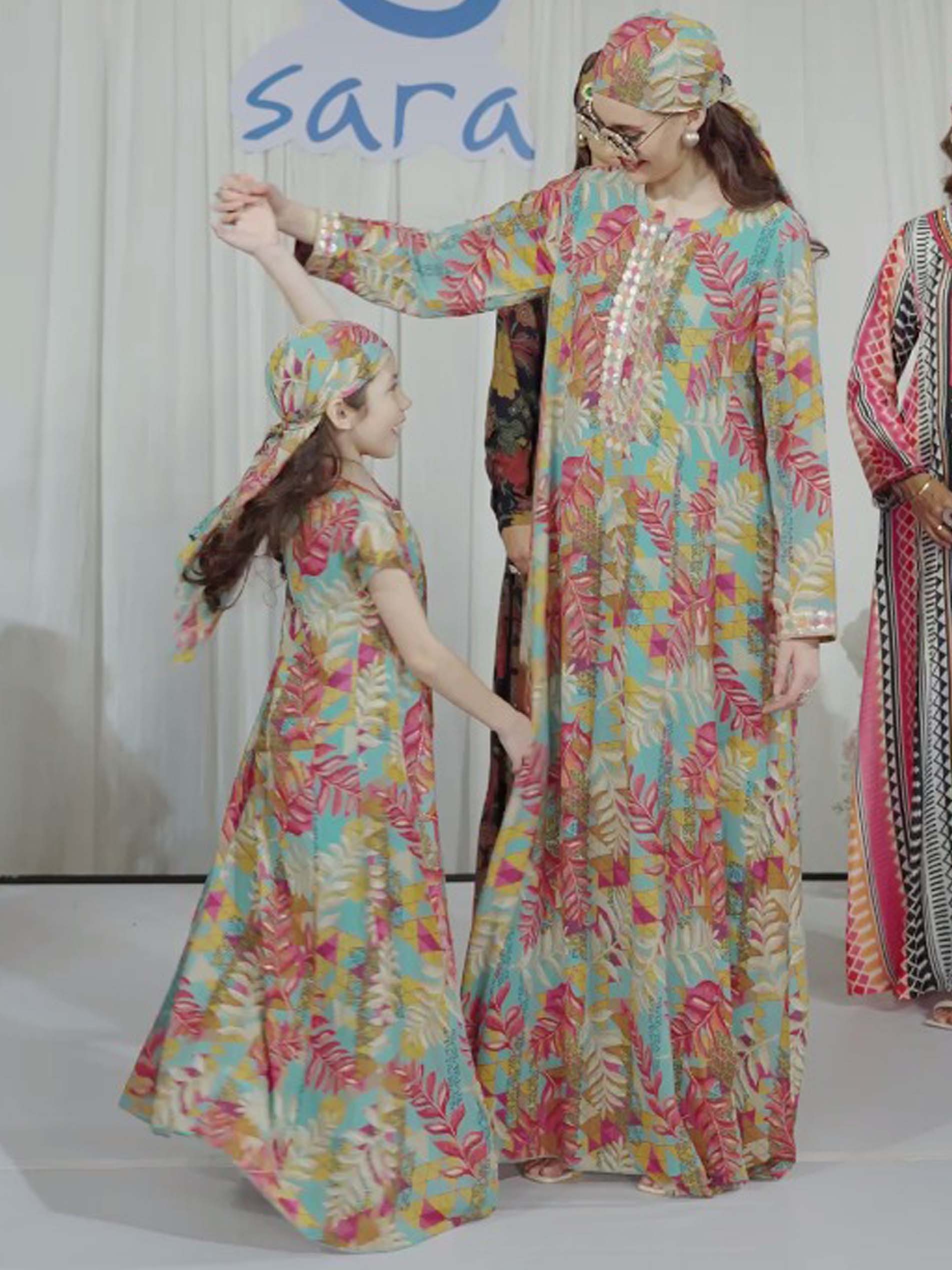 تتميز هذه الجلابية ذات القَصّة المُتَوَسِّعة، المصنوعة من القطن القابل للتنفس، بأنها خيار لافت وجذاب لحفلات الصيف. تحتوي على نقوش هندسية ورسوم أوراق تجريدية بألوان تركواز، وردي، وأصفر خردلي، مما يضفي عليها طابعًا مبهجًا وحيويًا. كما يتم تعزيز التصميم بعمل تطريزي دقيق باستخدام الفويل، مما يجعلها قطعة مميزة.