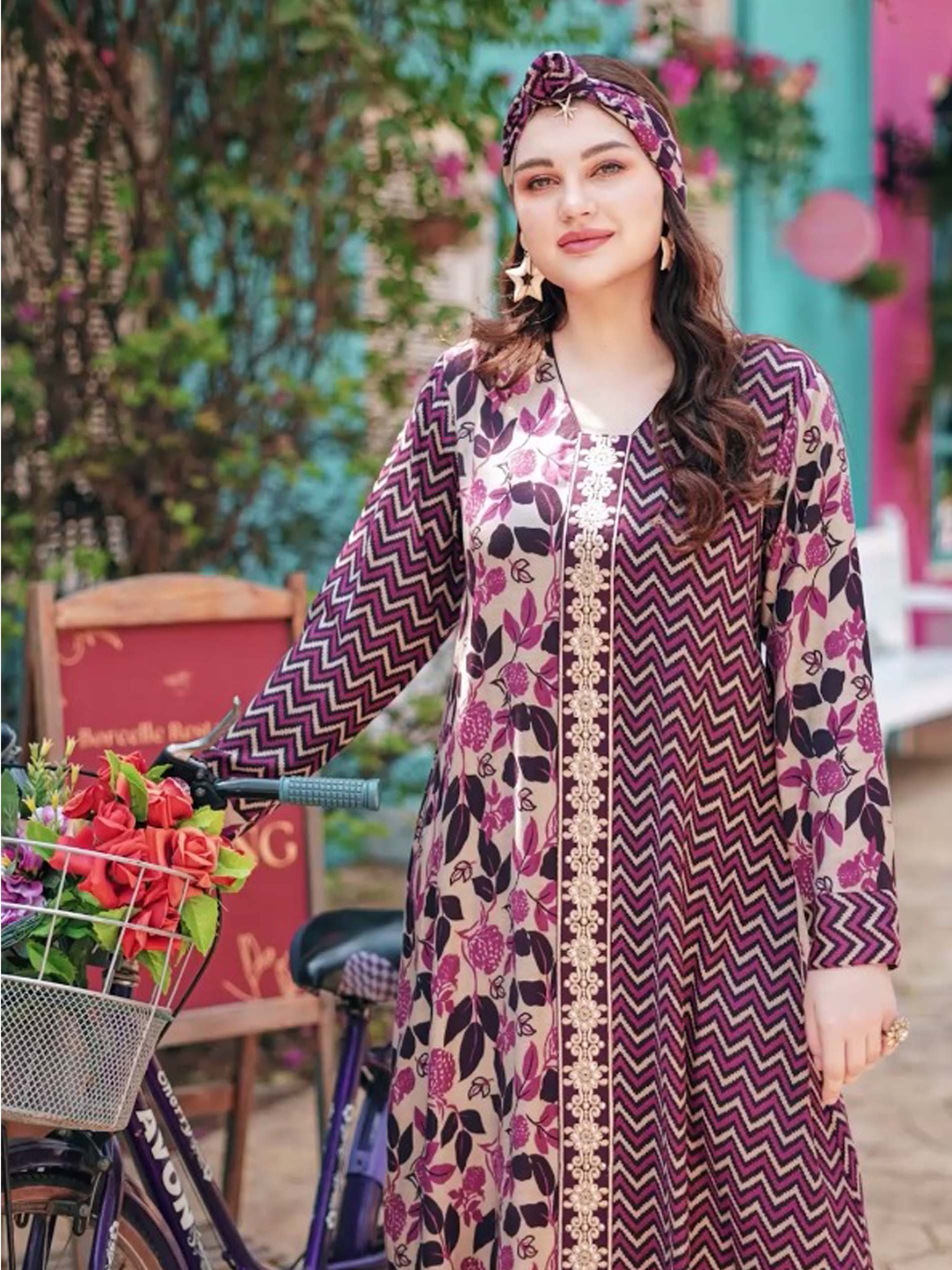 جلابية من القطن باللون البنفسجي الرائع، مزودة بنقشة أوراق الشجر على جانب من الجلابية ونقوشات متعرجة على الجانب الاخر مع أكمام طويلة. ويكتمل التصميم بتطريز رائع يمتد بطول الجلابية.