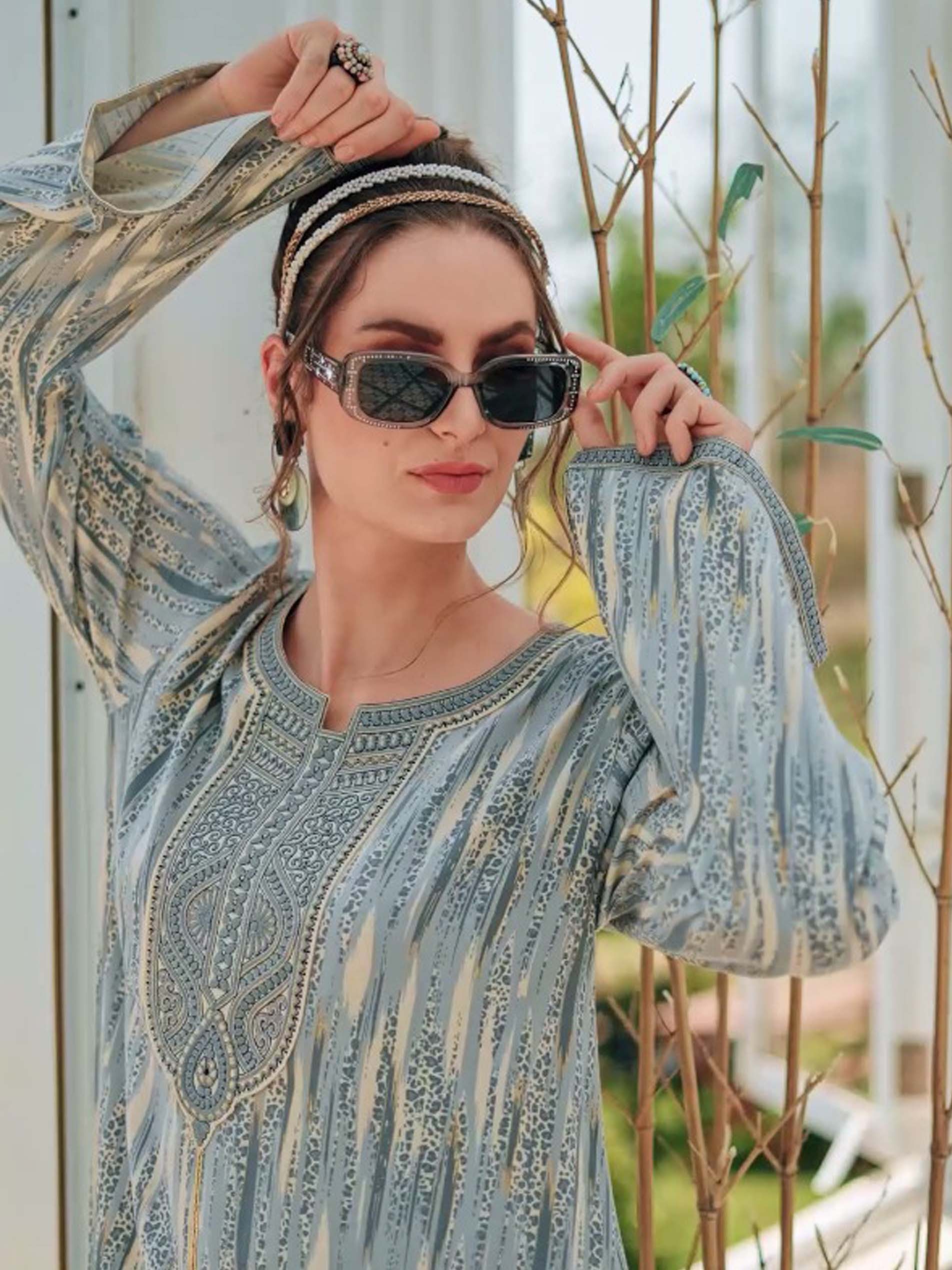 اذا كنتي من محبي التميز، هذه الجلابية يجب أن تكون جزء من خزانتك...مصممة من القطن وملونة باللون الرمادي الرائع مع نقوشات بيضاء مميزة وتطريز على الصدر.
