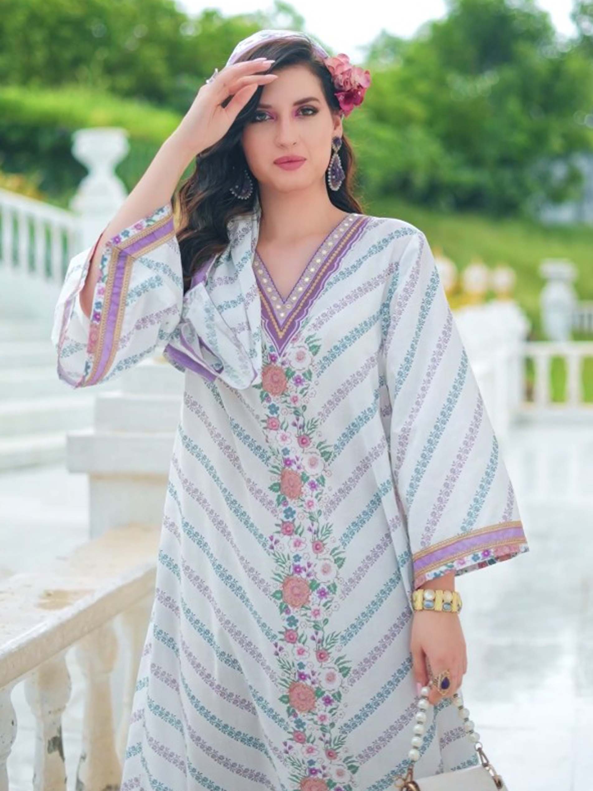 جلابية قطنية بيضاء اللون مصممة بتطريز مخطط من الزهور الملونة على جانبي الجلابية. وبتكمل التصميم بأكمام طويلة واسعة وطبعة الأزهار التي تمتد بطول الجلابية لتمنحك الشعور بالأناقة والتميز.
