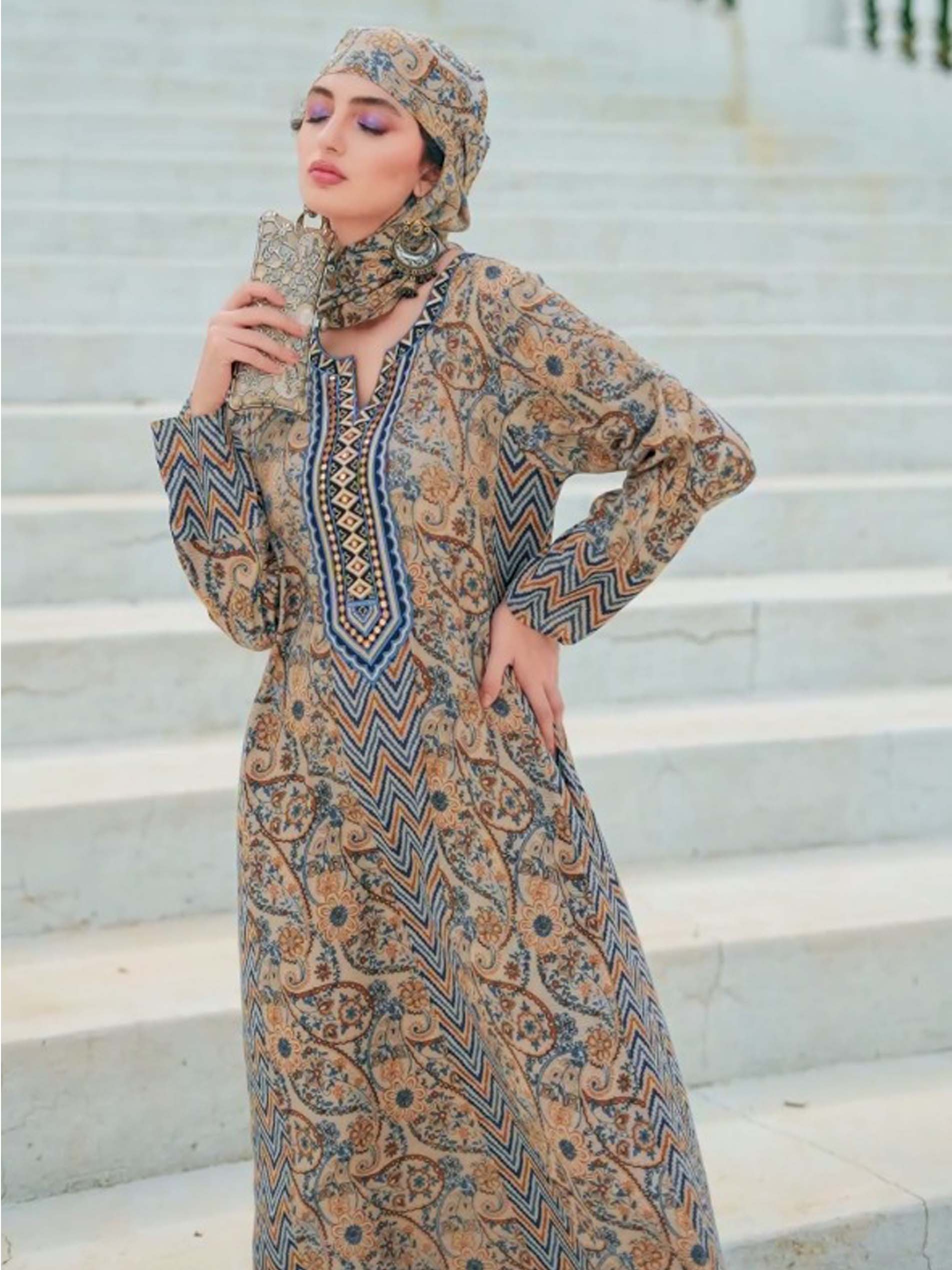 جلابية من القطن بتصميم فريد يدمج بين الزهور والخطوط المتعرجة باللونين الأزرق والذهبي مع أكمام طويلة وتطريز مميز على الصدر.