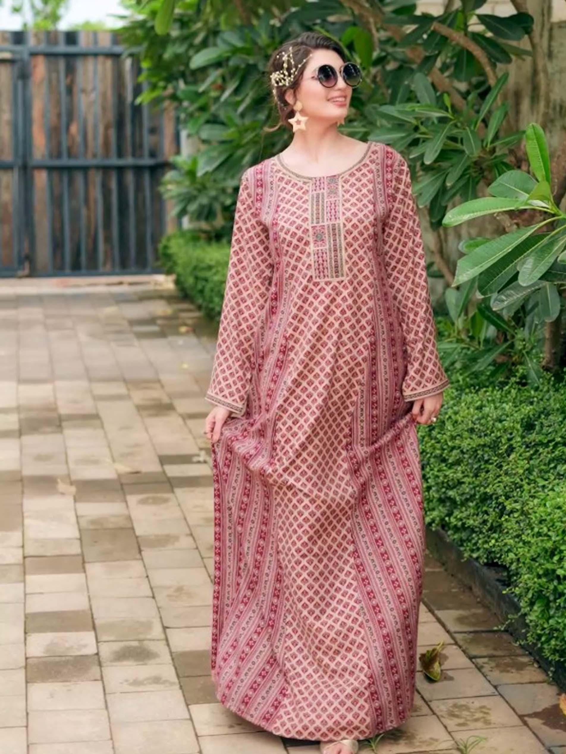 جلابية من القطن ملونة باللون الماروني مصممة بنقوشات مميزة مع تطريز على الصدر مع أكمام طويلة وفتحة رقبة دائرية.