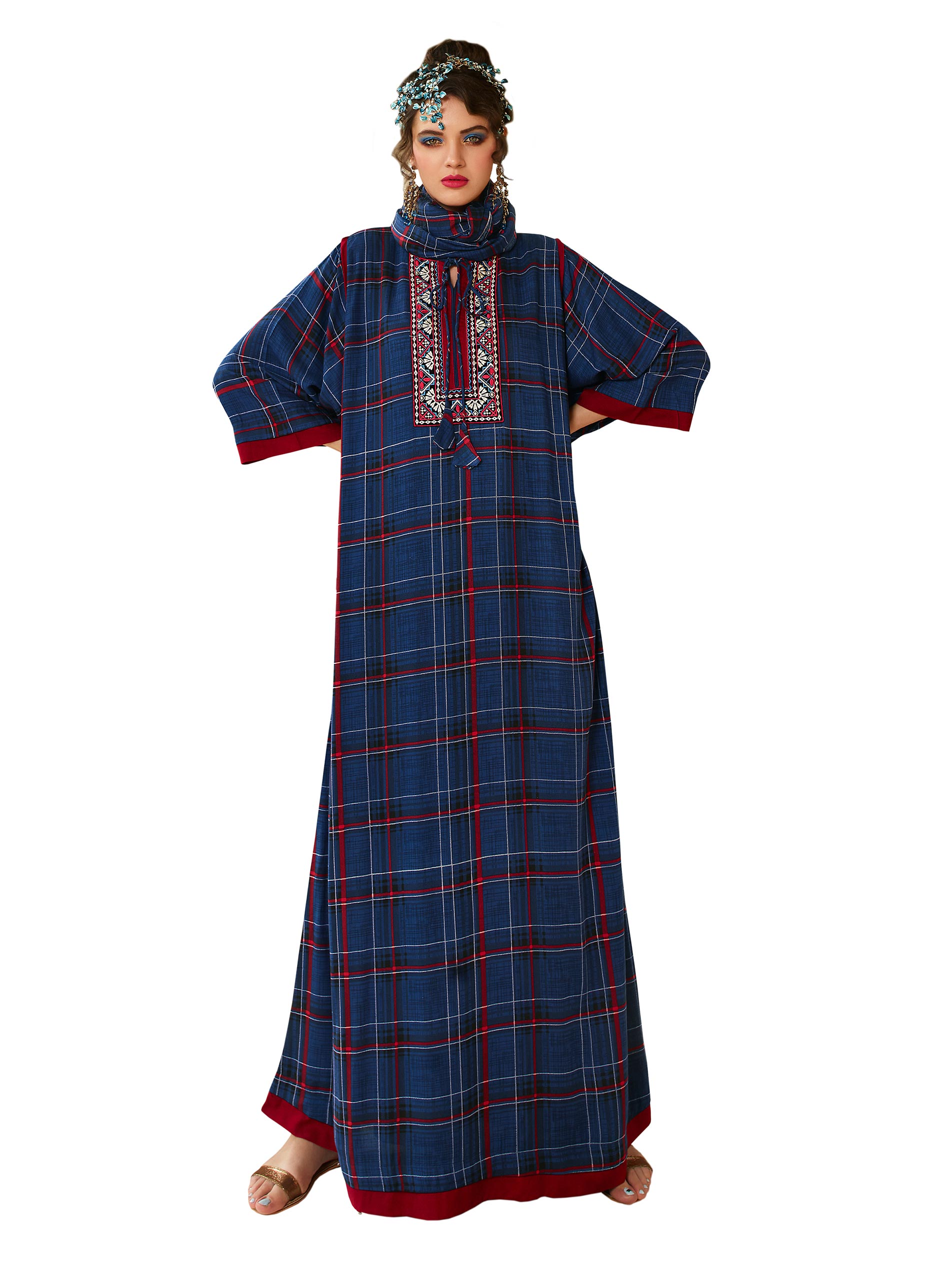 This one’s for those with a high taste surely. A stunning navy blue jalabiya with a collared neck creating a casual, smart and sophisticated look. Fancy sleeves and an A line-cut in plaid print on rayon to criss-cross summer in style that exudes cool and calm.