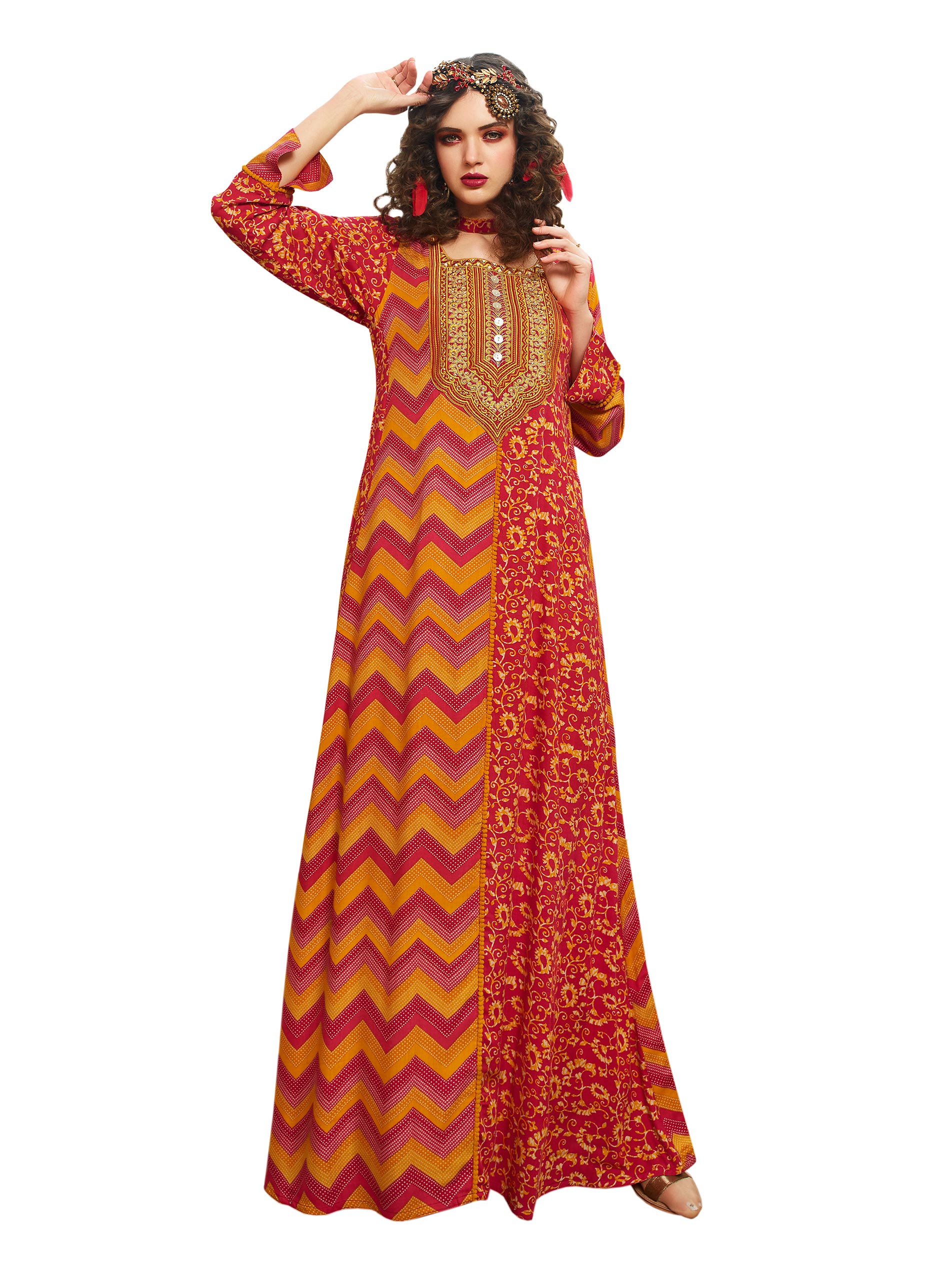 Red stands for power, grace, love and courage. This passionately designed red full length jalabiya is styled in a multiple print rayon fabrics. The full sleeves and the round neck with an A-line cut look simply stunning in the daring red. Sara Arabia online has the most pretty Arabian dresses.