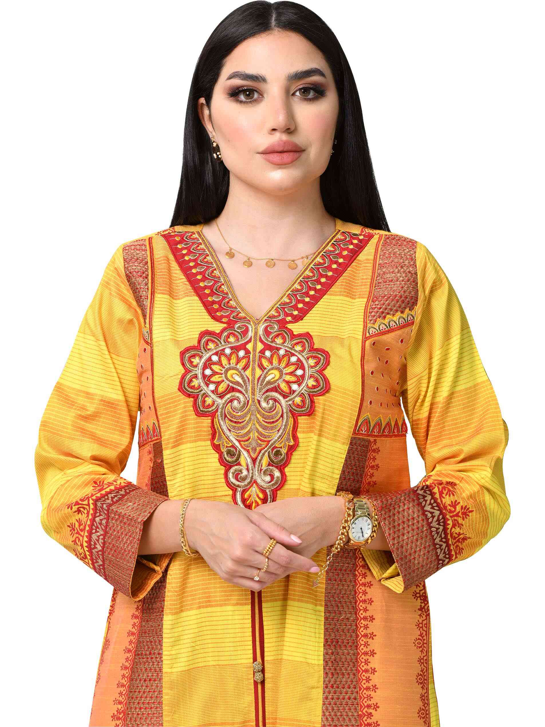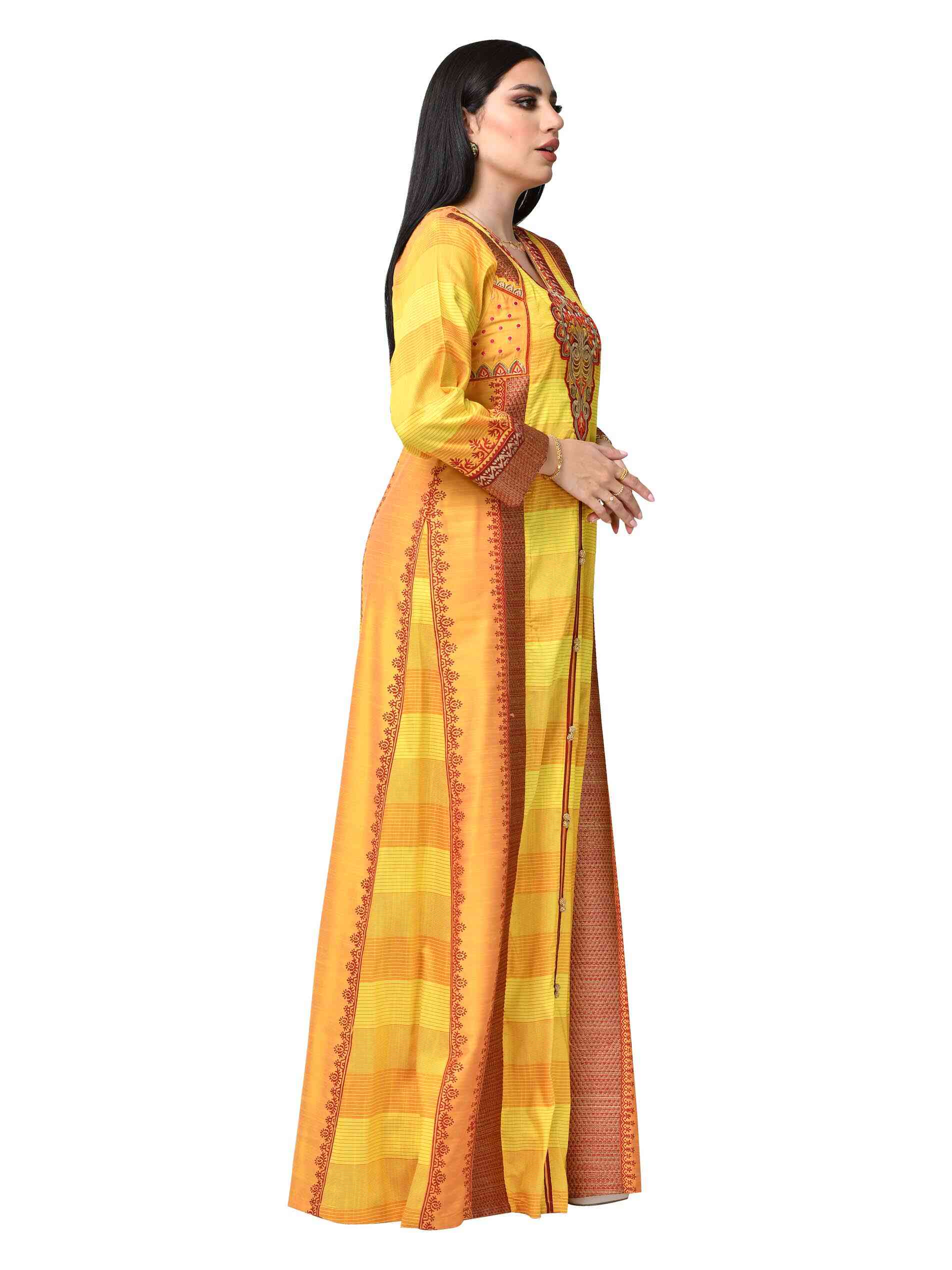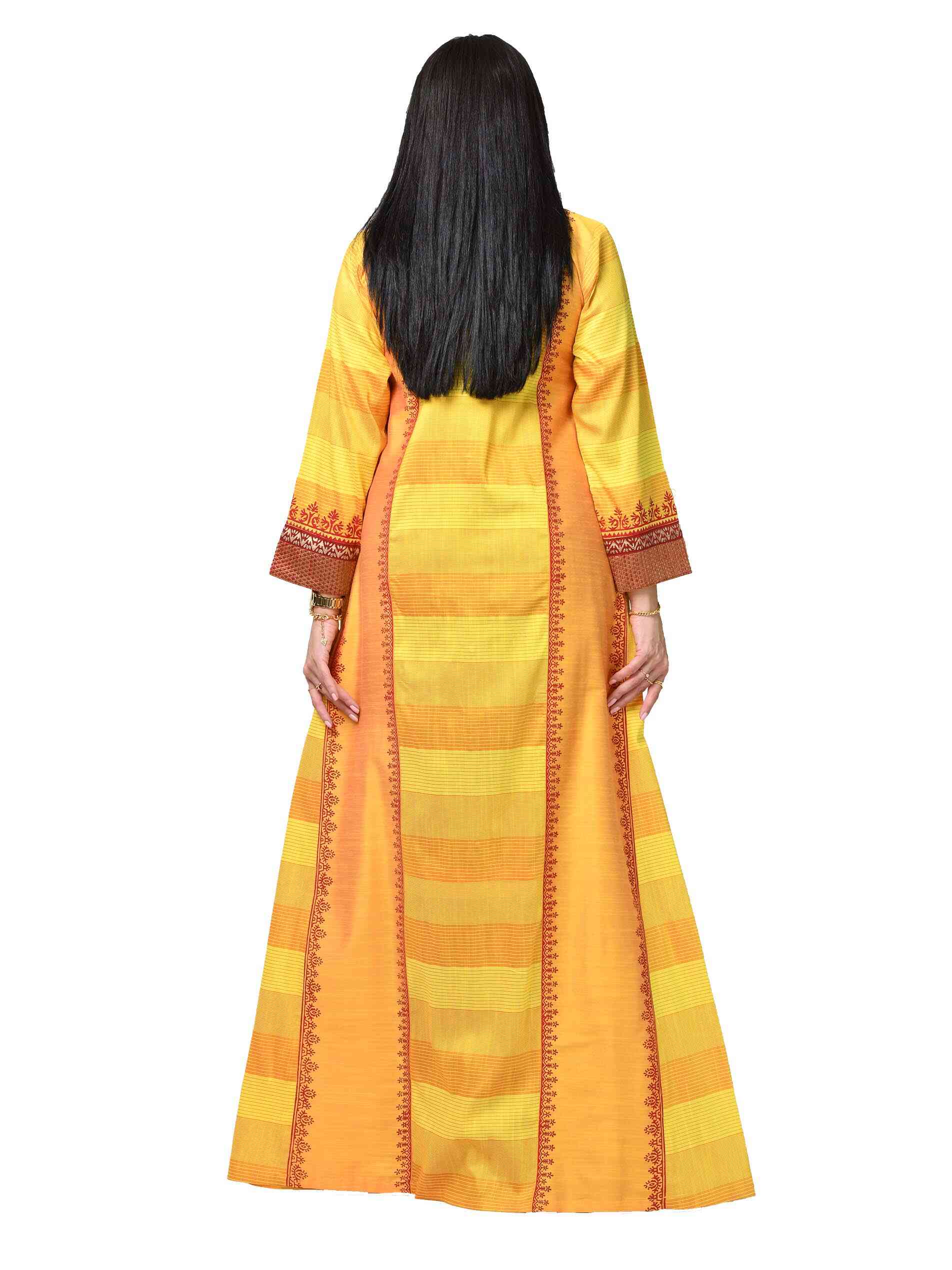 Yellow is the colour of happiness, and yellow in multiple prints is a reminder of the various joys life brings in the form of different colours of blessings and bounties. Look graceful and prosperous in a full length yellow jalabiya tailored in PST fabric lending it a fascinating fall. The V neck and full sleeves compliment the A-line hemline making it a stunning piece of casual wear.