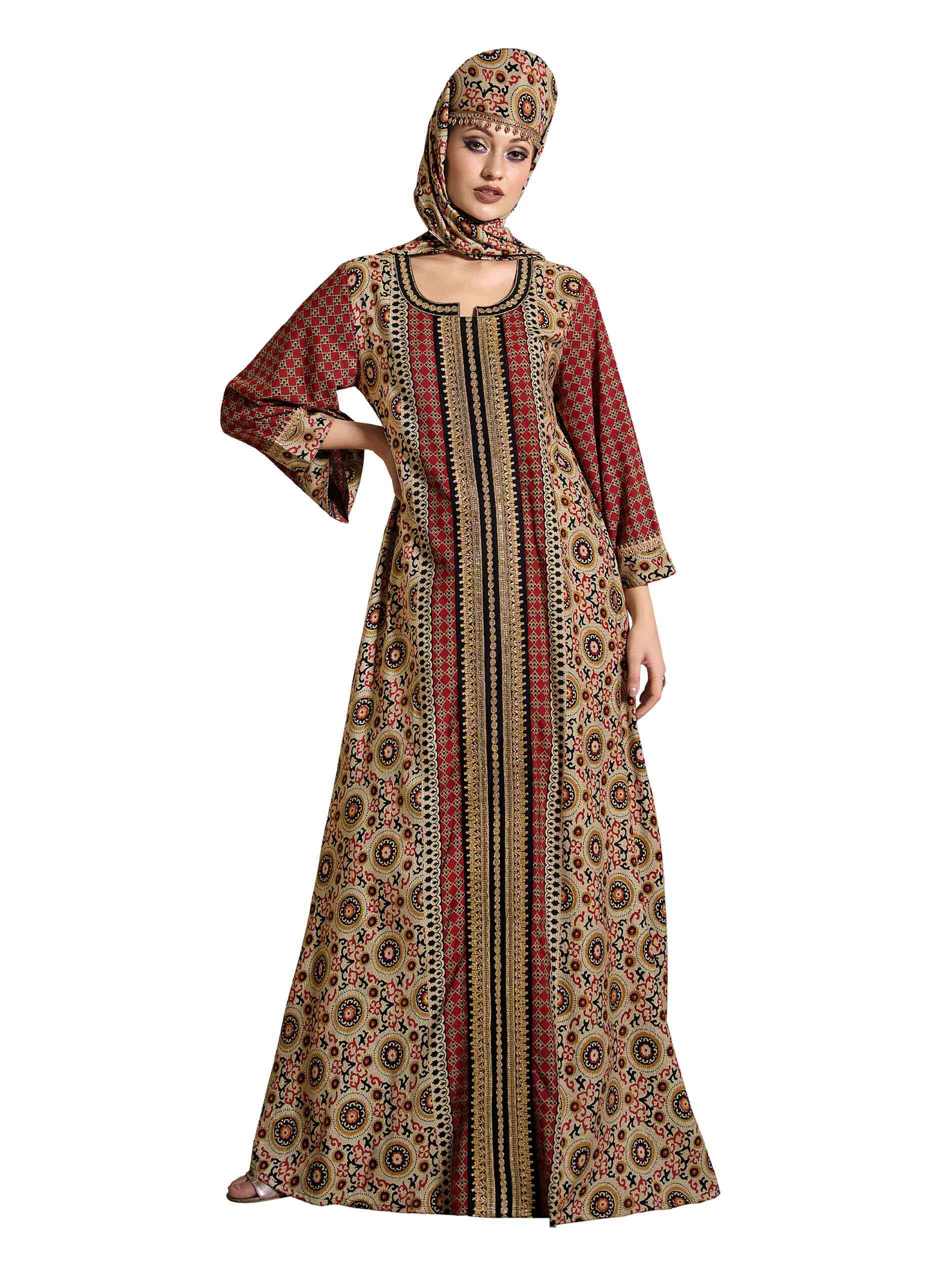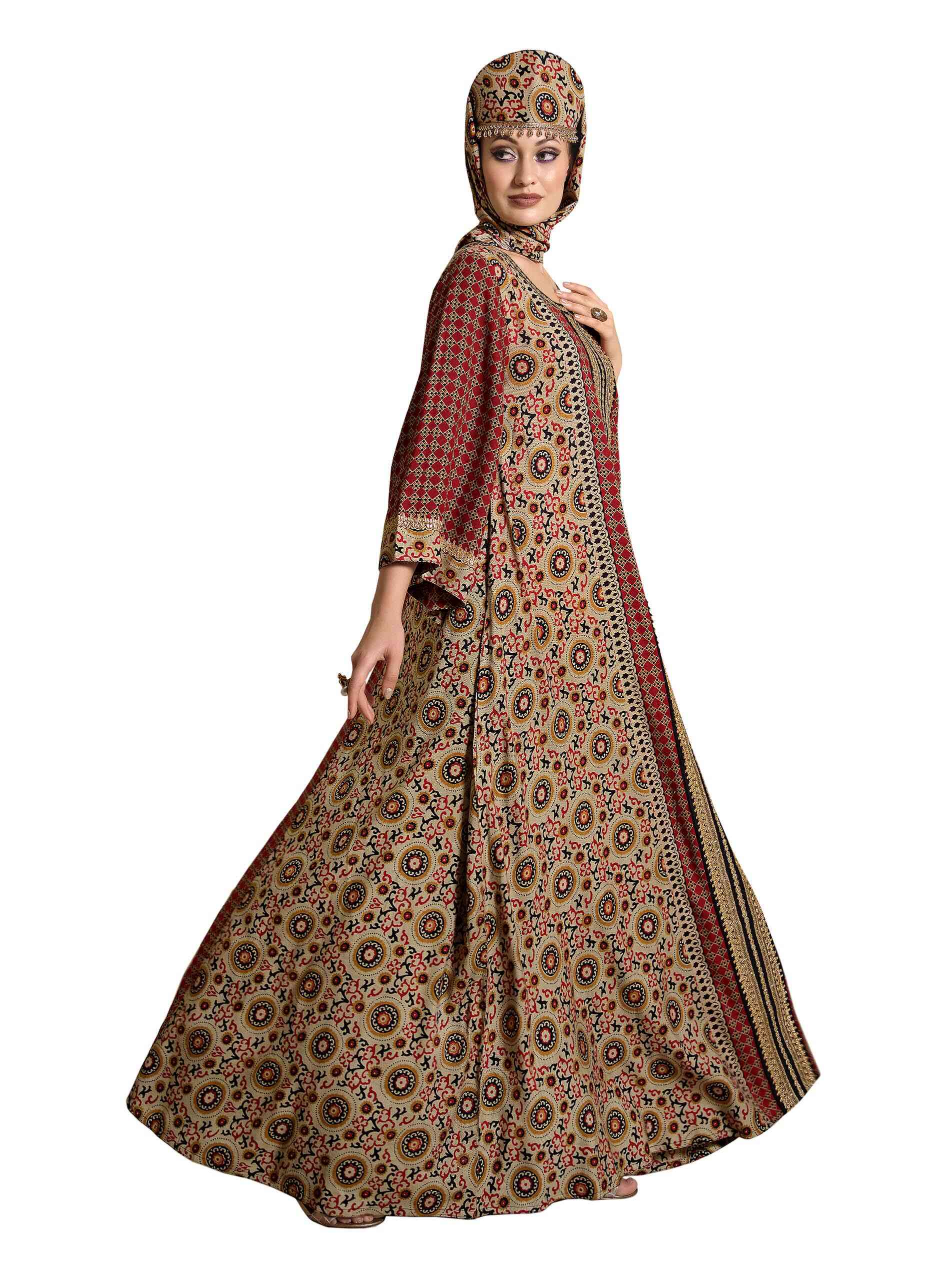 Inspired by ancient stories and symbols this full length earthy jalabiya shall take you back in time with its brown colour and aboriginal print. Yet, it is stunningly modern in its styling defined by 3/4th sleeves, A line cut and notch neck. Look rustic, look beautiful, look with the times, yet charmingly grounded.